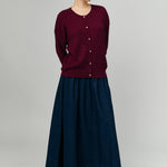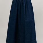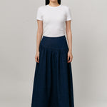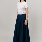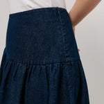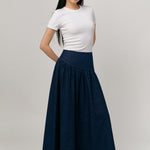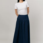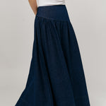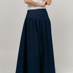 A maxi skirt with an asymmetric waistband and a flared silhouette with gathered details. Rendered in cotton denim. Finished with a hidden zip on the side.