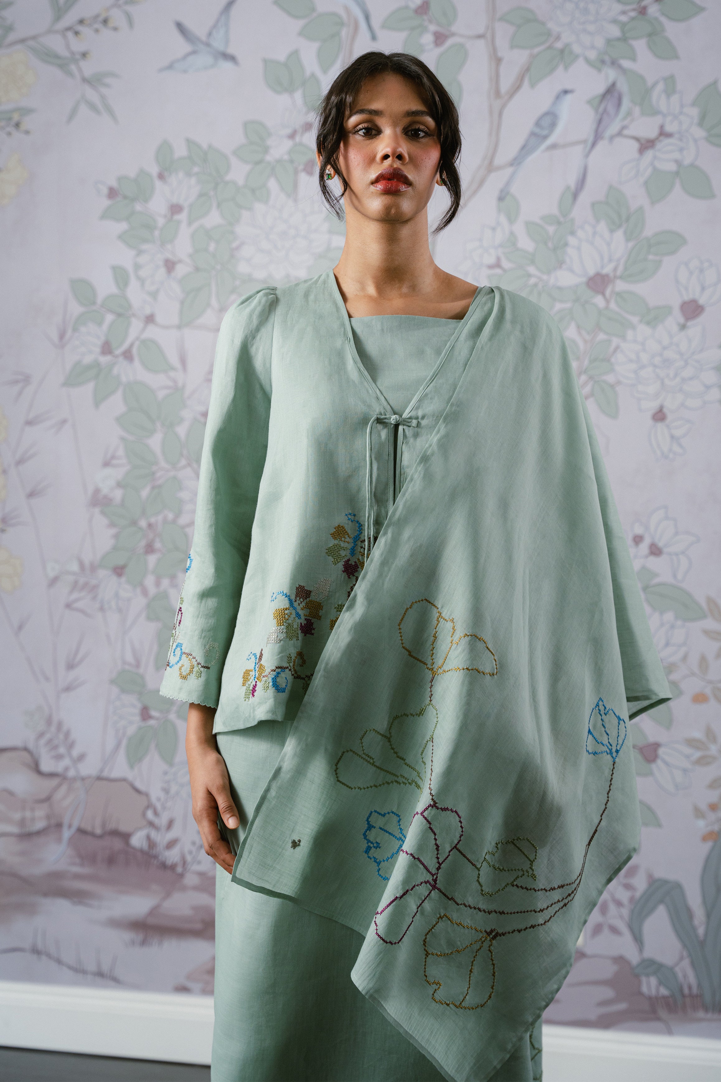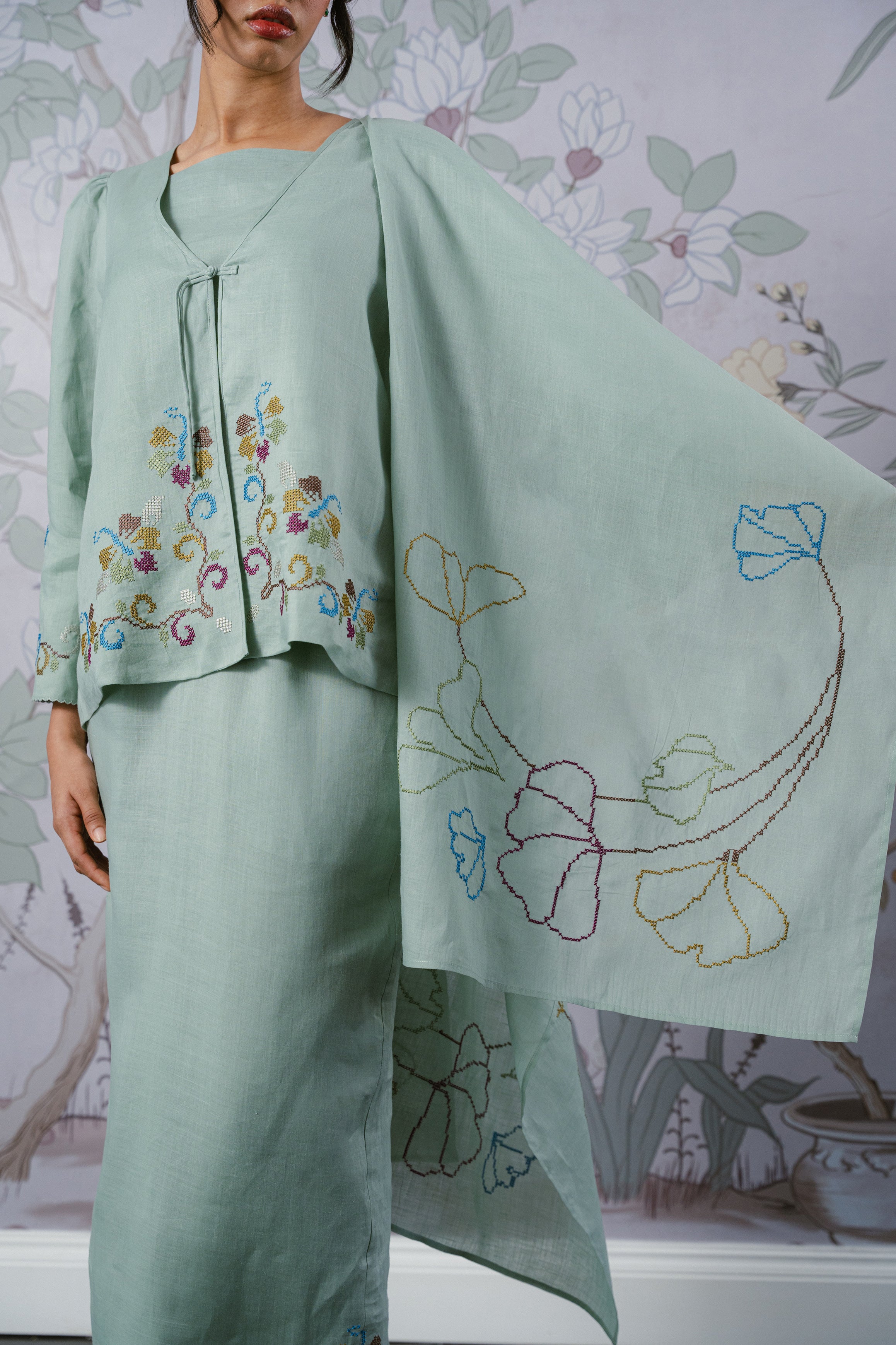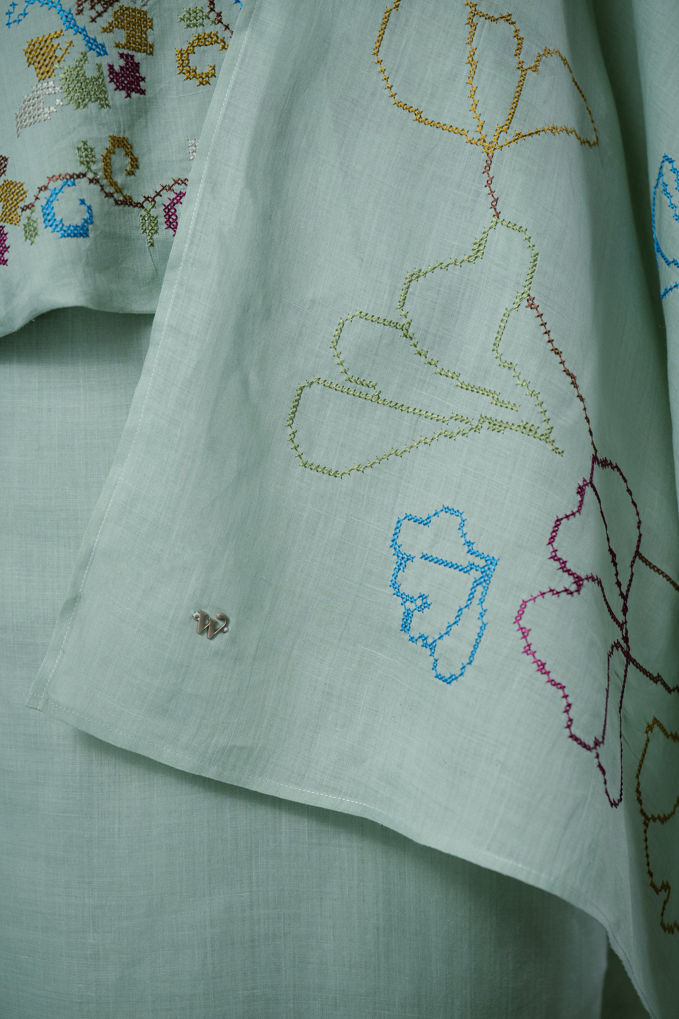 An heirloom in the making, rendered in 100% ramie. This selendang is framed with intricate multicolour floral cross-stitch detailing and finished with a delicate W metal logo. Drape it over your shoulders or wear it as a headscarf to to show it off to full effect.