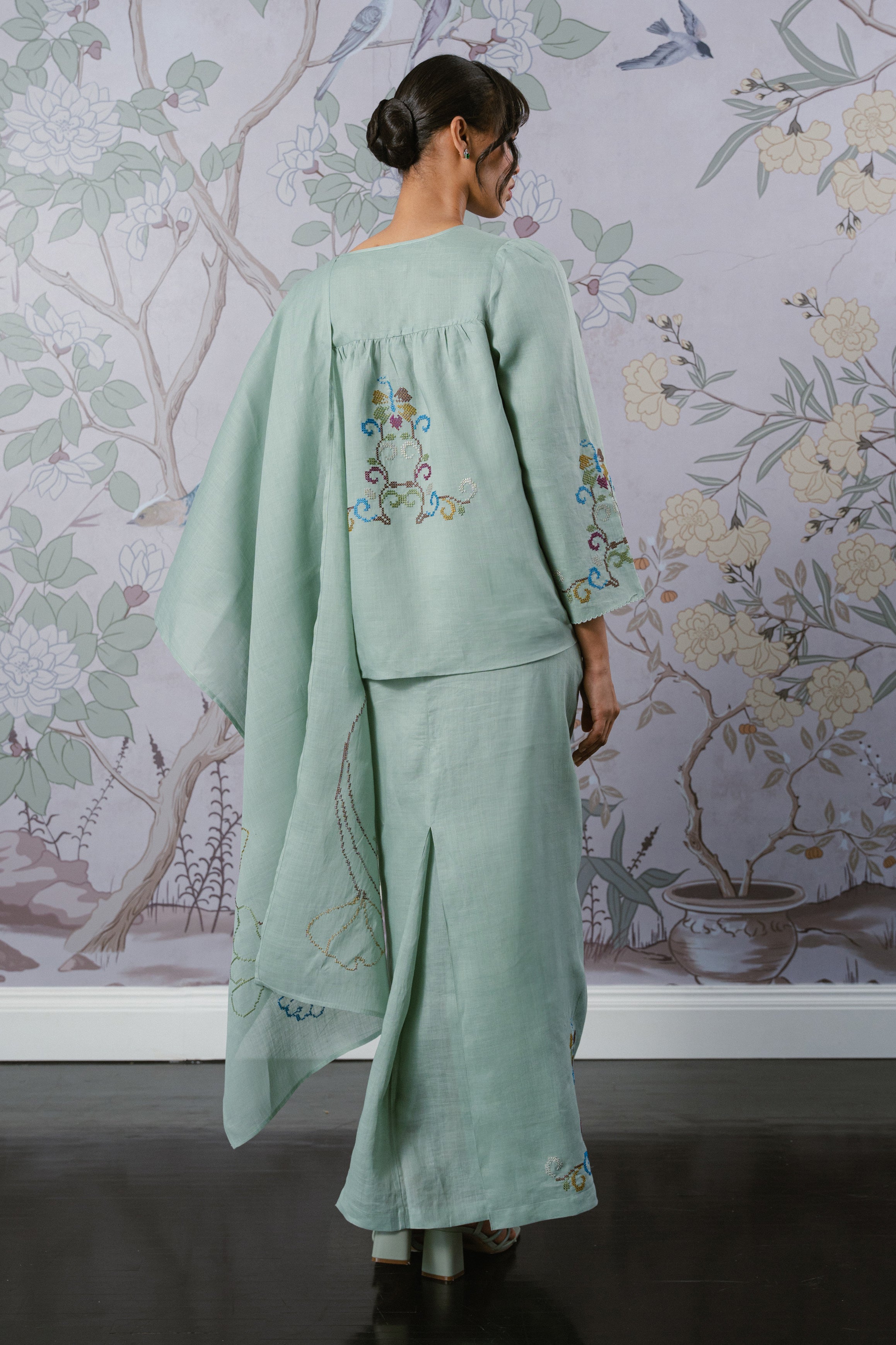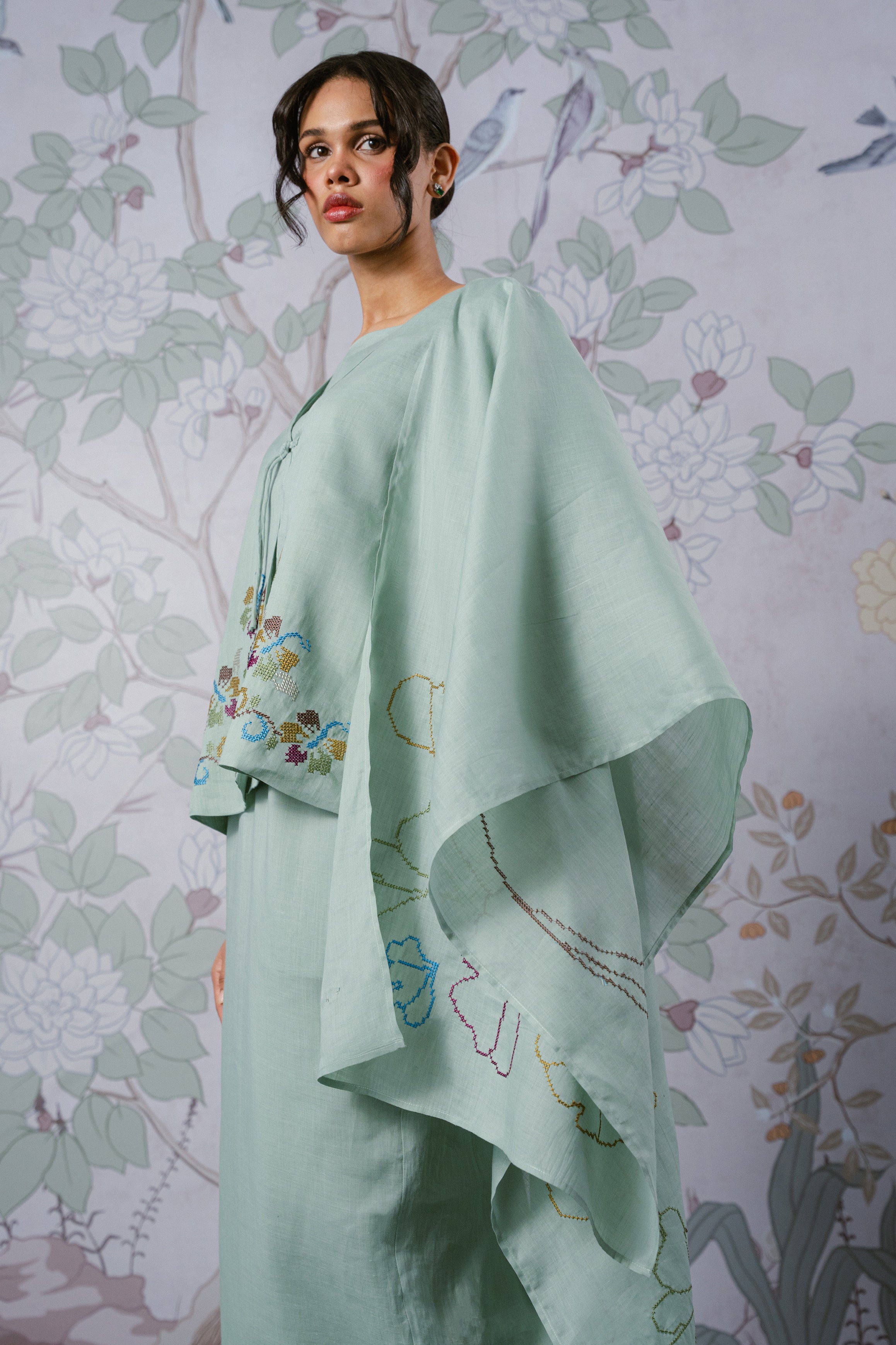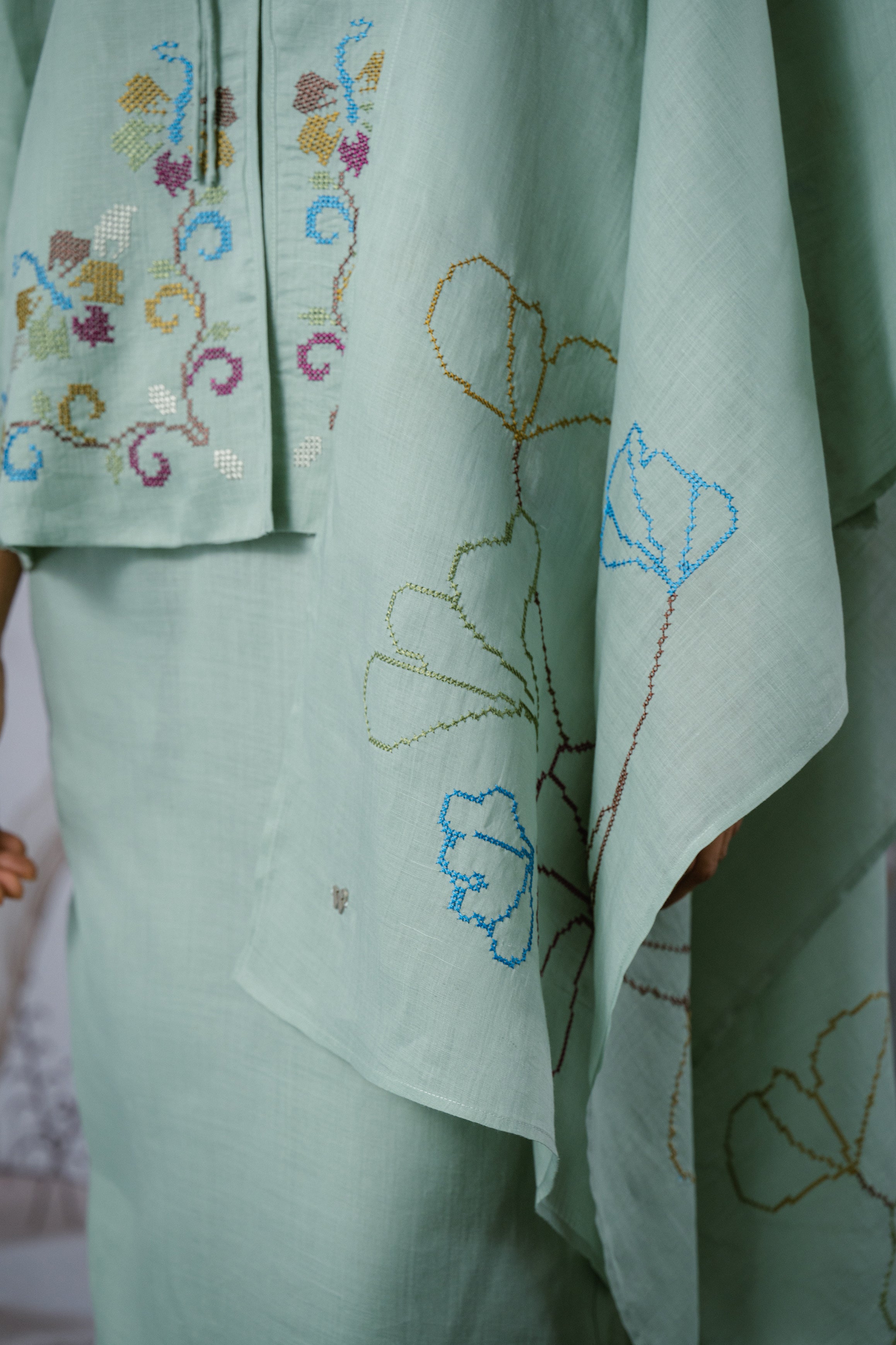 An heirloom in the making, rendered in 100% ramie. This selendang is framed with intricate multicolour floral cross-stitch detailing and finished with a delicate W metal logo. Drape it over your shoulders or wear it as a headscarf to to show it off to full effect.