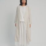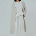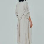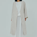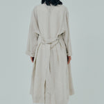 A relaxed fit, ankle-length lightweight coat. Features a double-breasted front and turn-up sleeves detailed with buttons. Finished with side pockets and a waist tie. Rendered in linen.