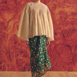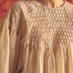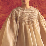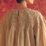 A raglan flare blouse with hand-stitched honeycomb pintuck detailing, a round neckline, and a button closure with an elastic loop at the back. Rendered in ramie, and fully lined in cotton.