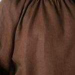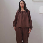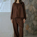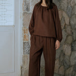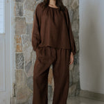 A raglan blouse with a gathered neckline and full sleeves. Designed for comfort in mobility. Rendered in 100% linen.