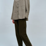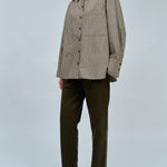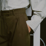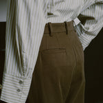 Trousers with front pleats, side pockets and a clean tapered leg. Rendered in cotton. Finished with a structured waistband and subtle back welt pocket.
