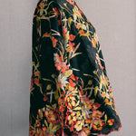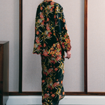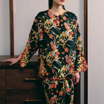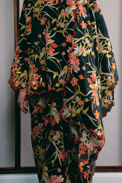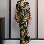 An iteration of the classic Kedah fit, rendered in ramie and lined with cotton. The set includes a top with intricate multi-tone floral embroidery, finished with tulip-cut sleeves, side slits, and a front button closure. Finished with a matching, slip-on knot skirt.