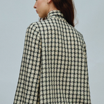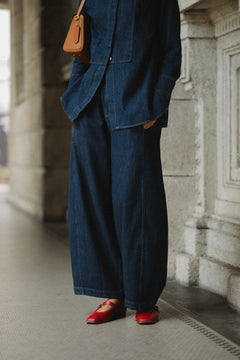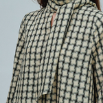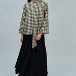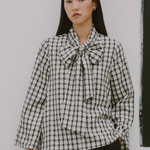 An A-line blouse with a bow collar and V-shaped front. Finished with bell sleeves.