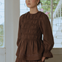 A shirred blouse rendered in linen, designed with a peplum for soft structure. Framed with intricate trimming and smocked wristbands, finished with a round neckline.