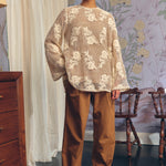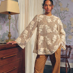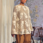 An A-line fit, crafted from intricate crochet lace layered over a ramie base. Features delicate sequin embellishments with floral motifs. Finished with full sleeves.