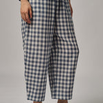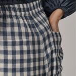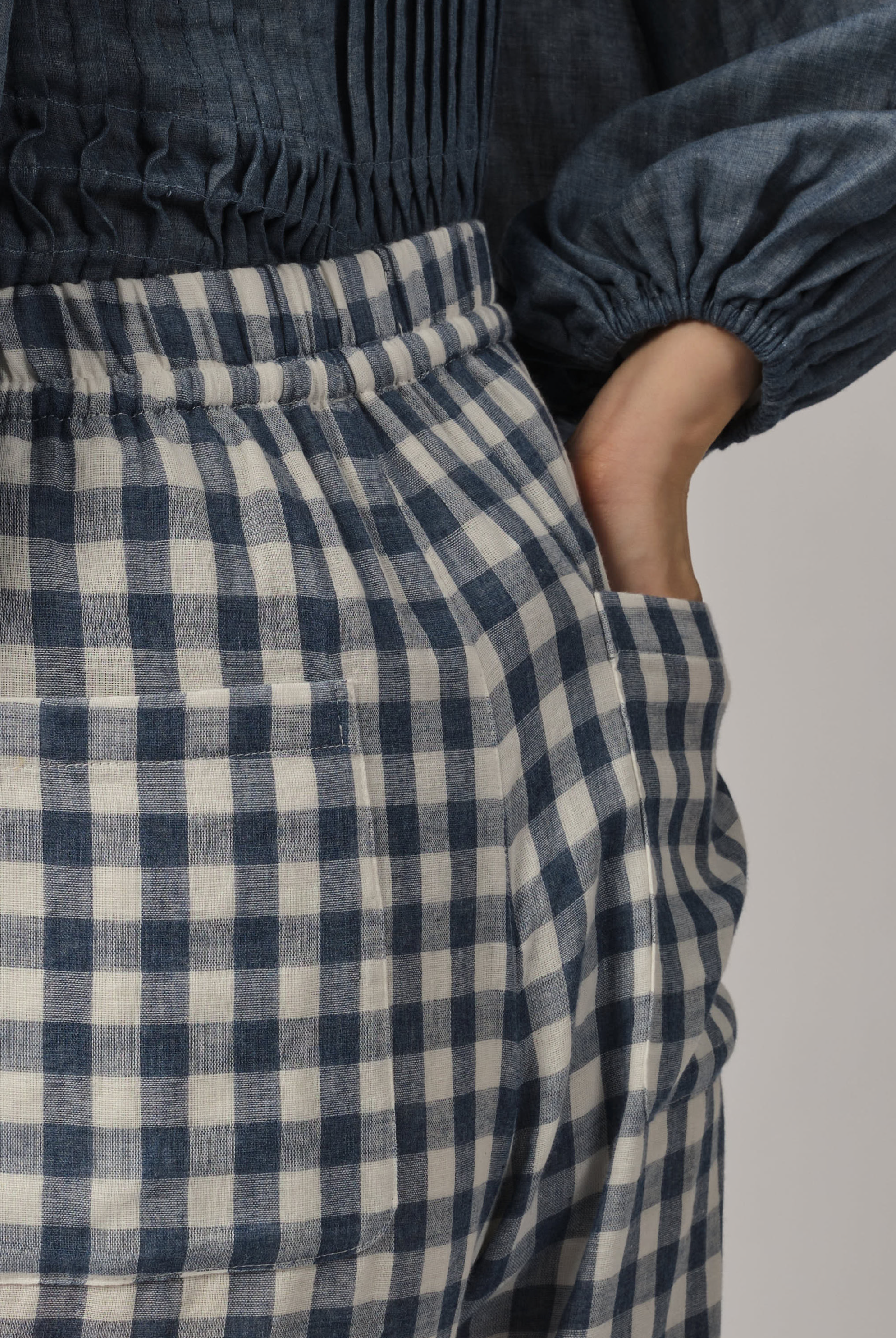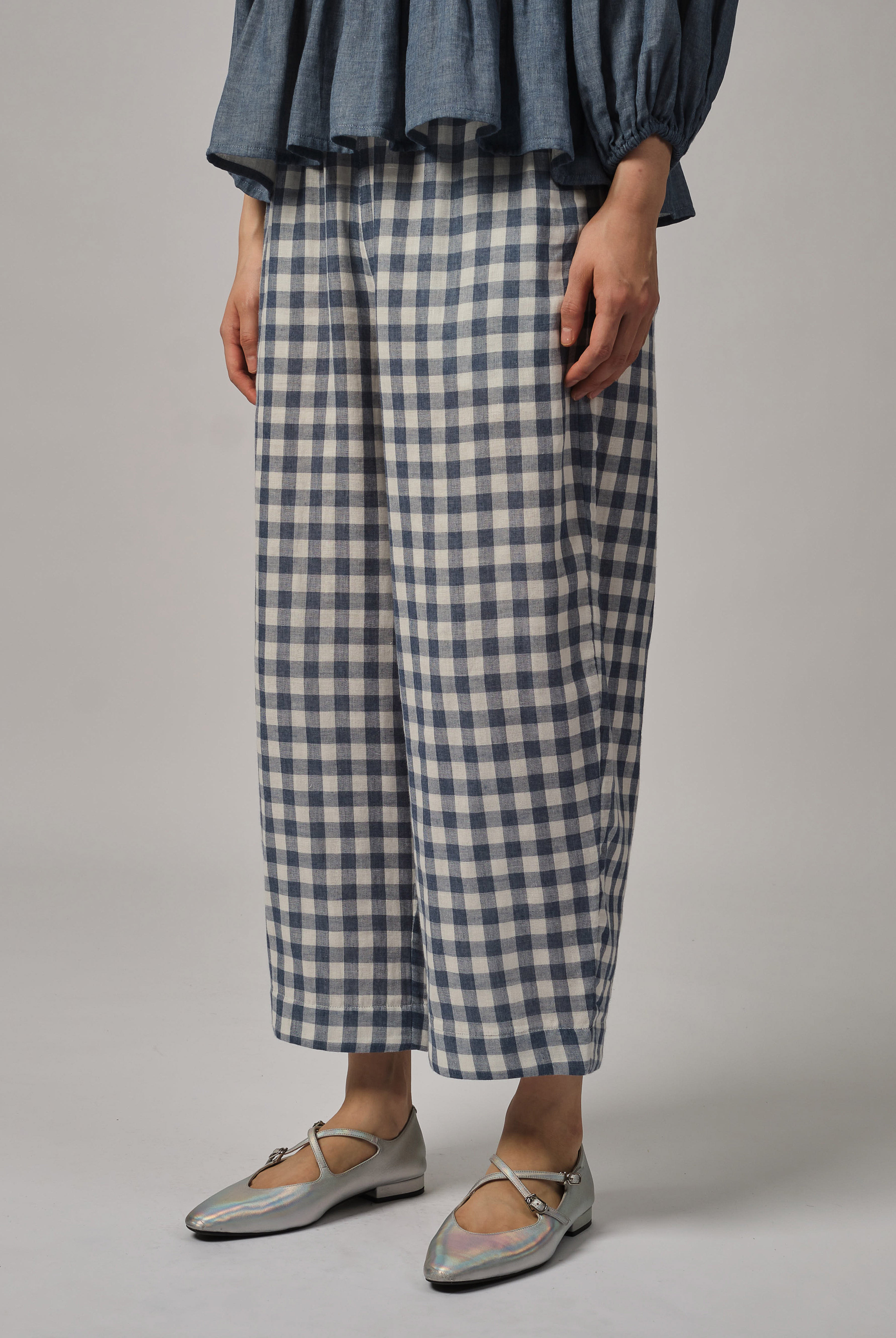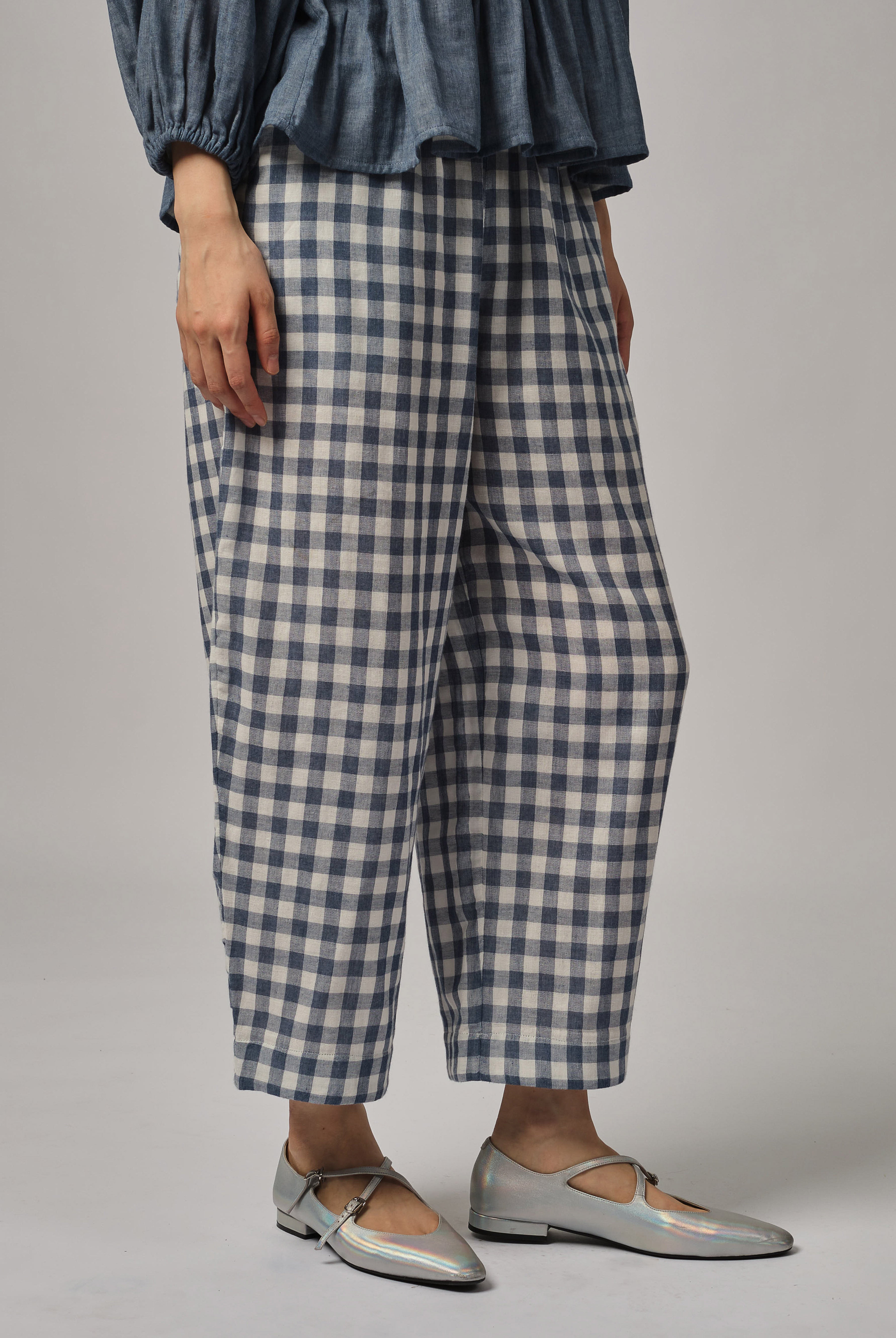 A slim barrel silhouette in cotton, with a gingham weave pattern. Features an adjustable drawstring with elastic waistband. Finished with a back and side pockets. An ankle-length cut.