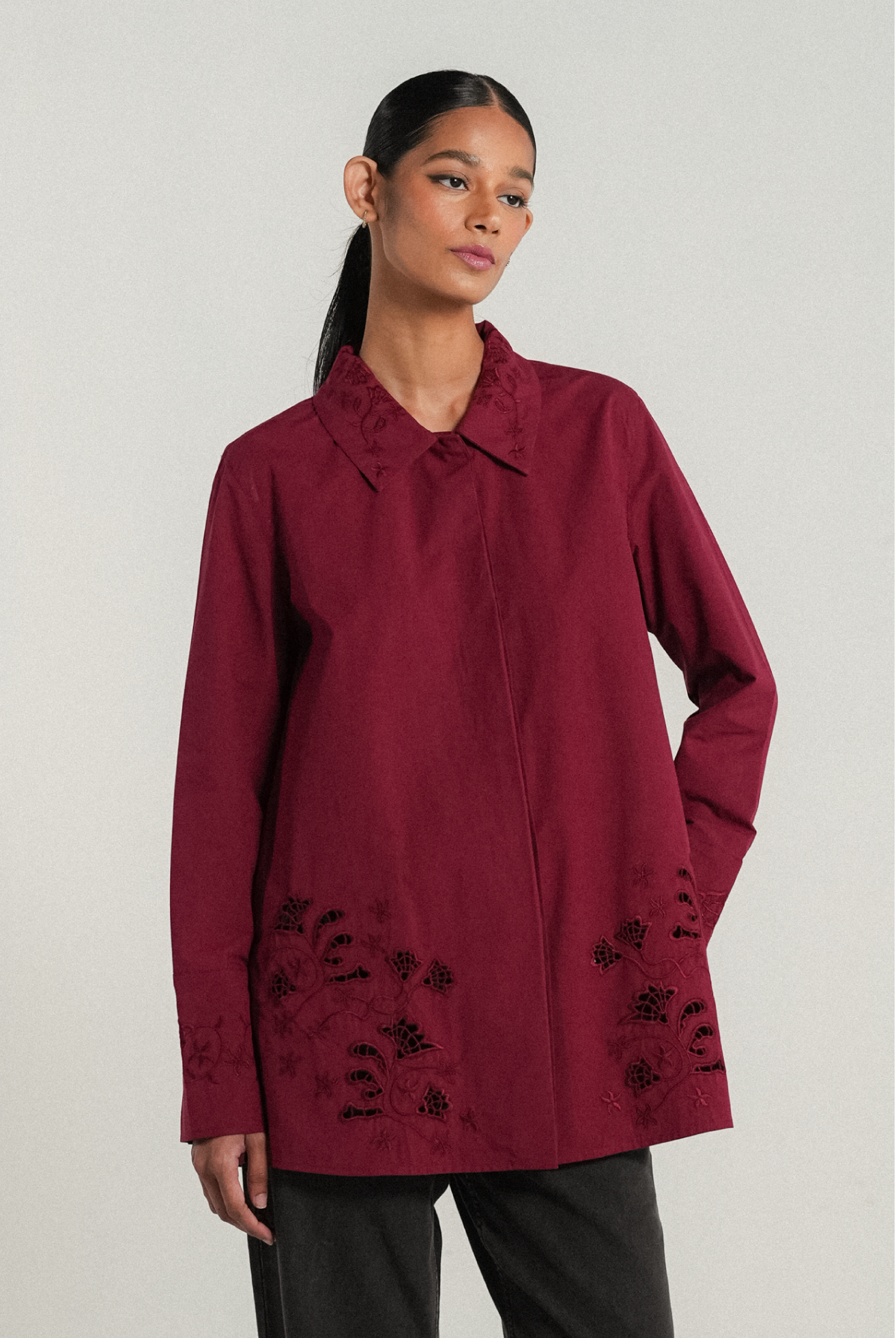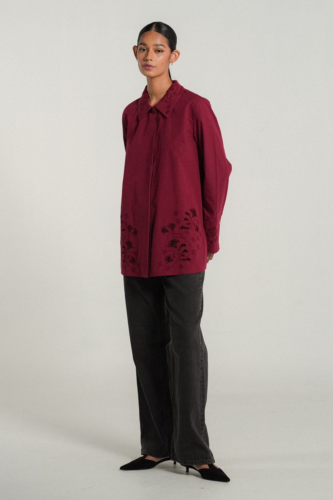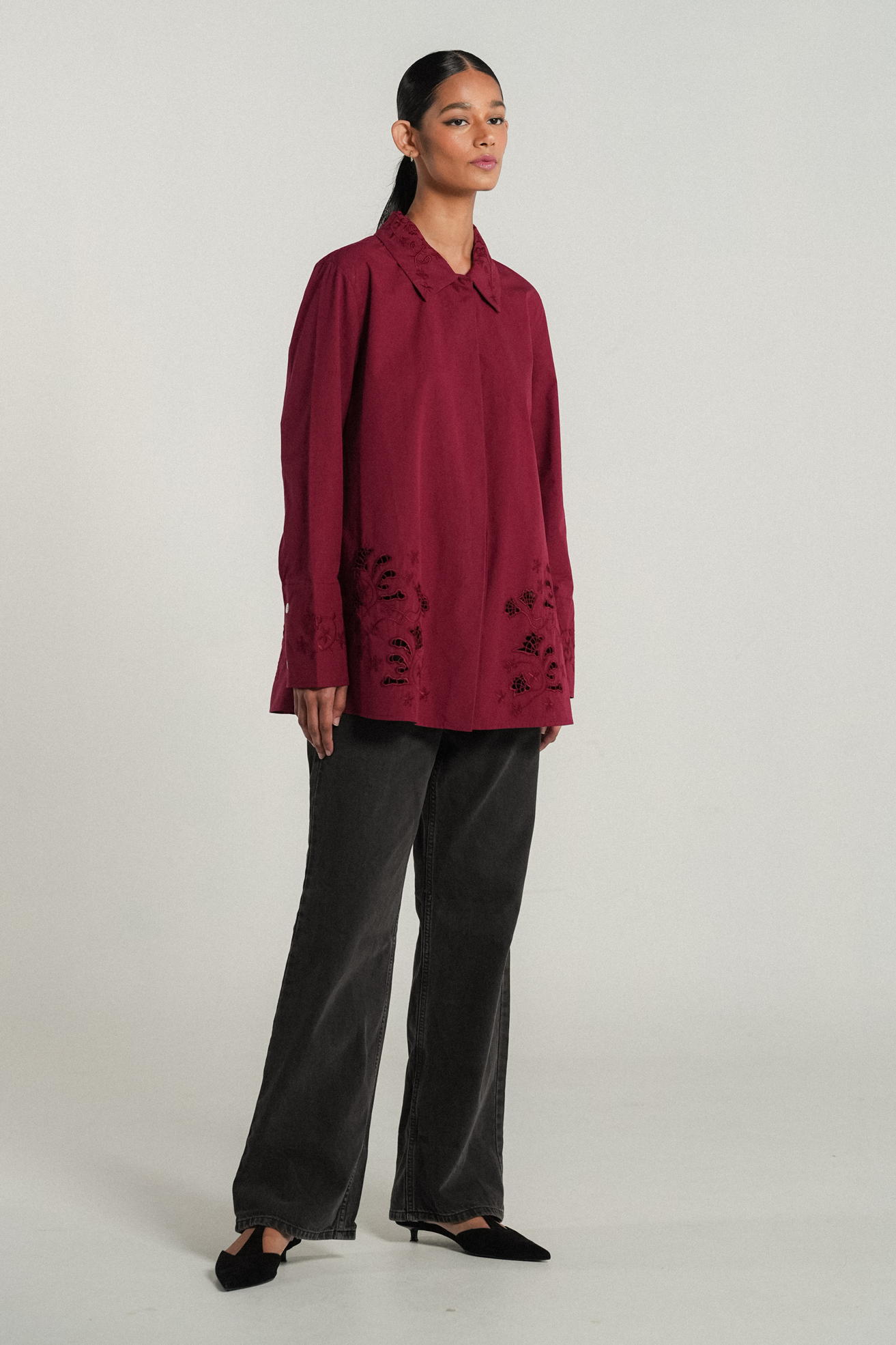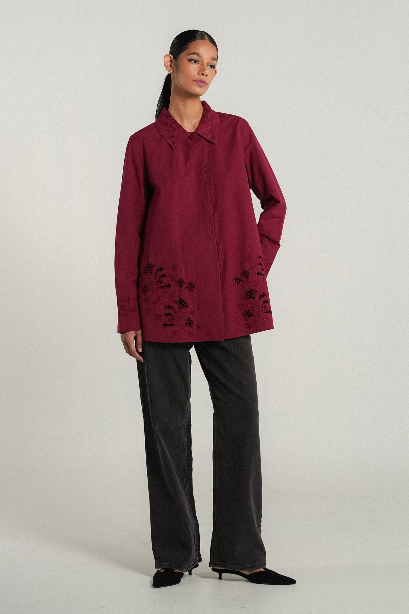 A crisp shirt, rendered in cotton. A relaxed fit with side slits that features delicate flower embroidery on the pointed collar. Intricate eyelet embroidery both front and back, finished with embroidered cuffs on slim-cut sleeves.