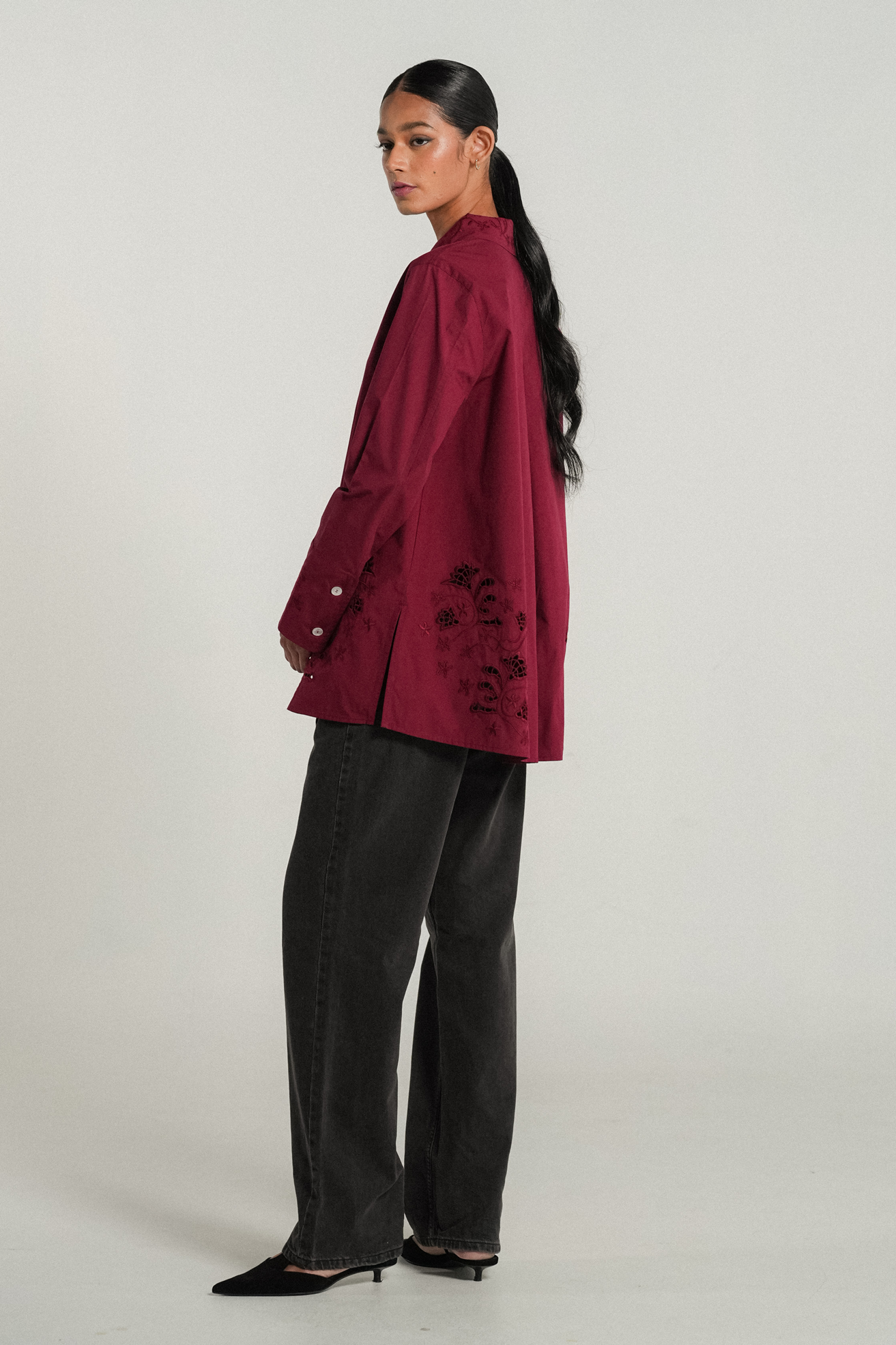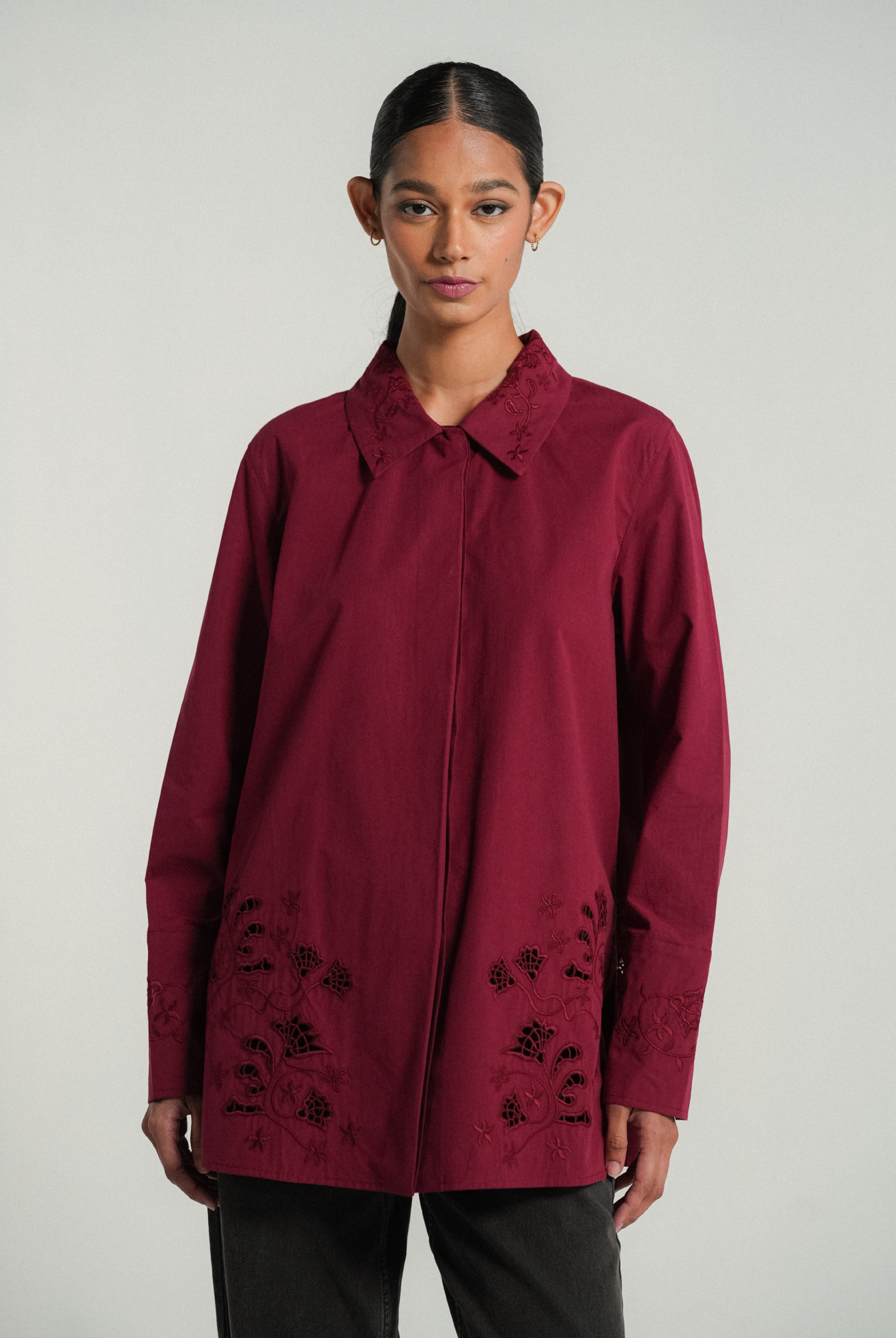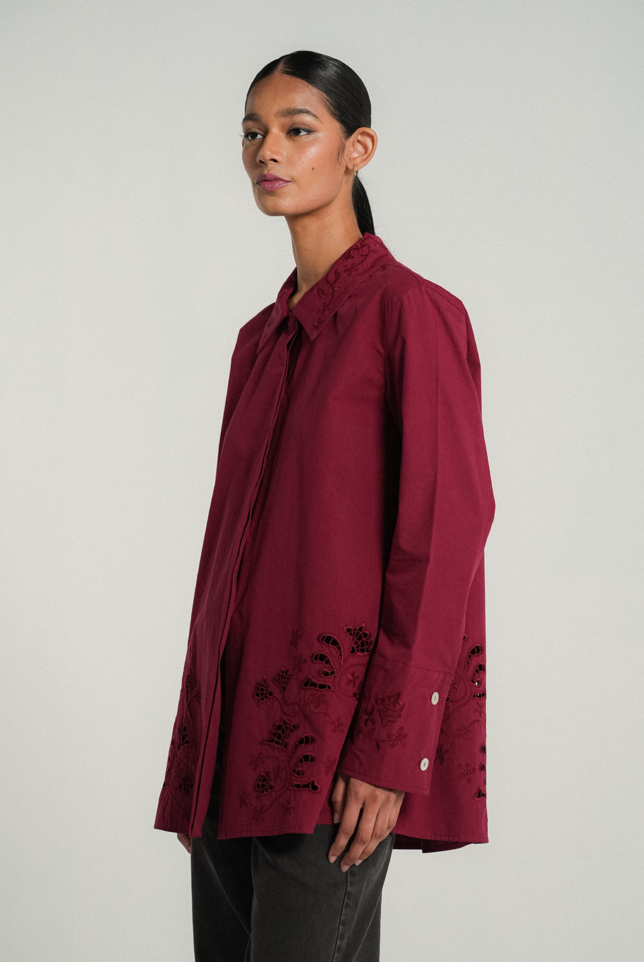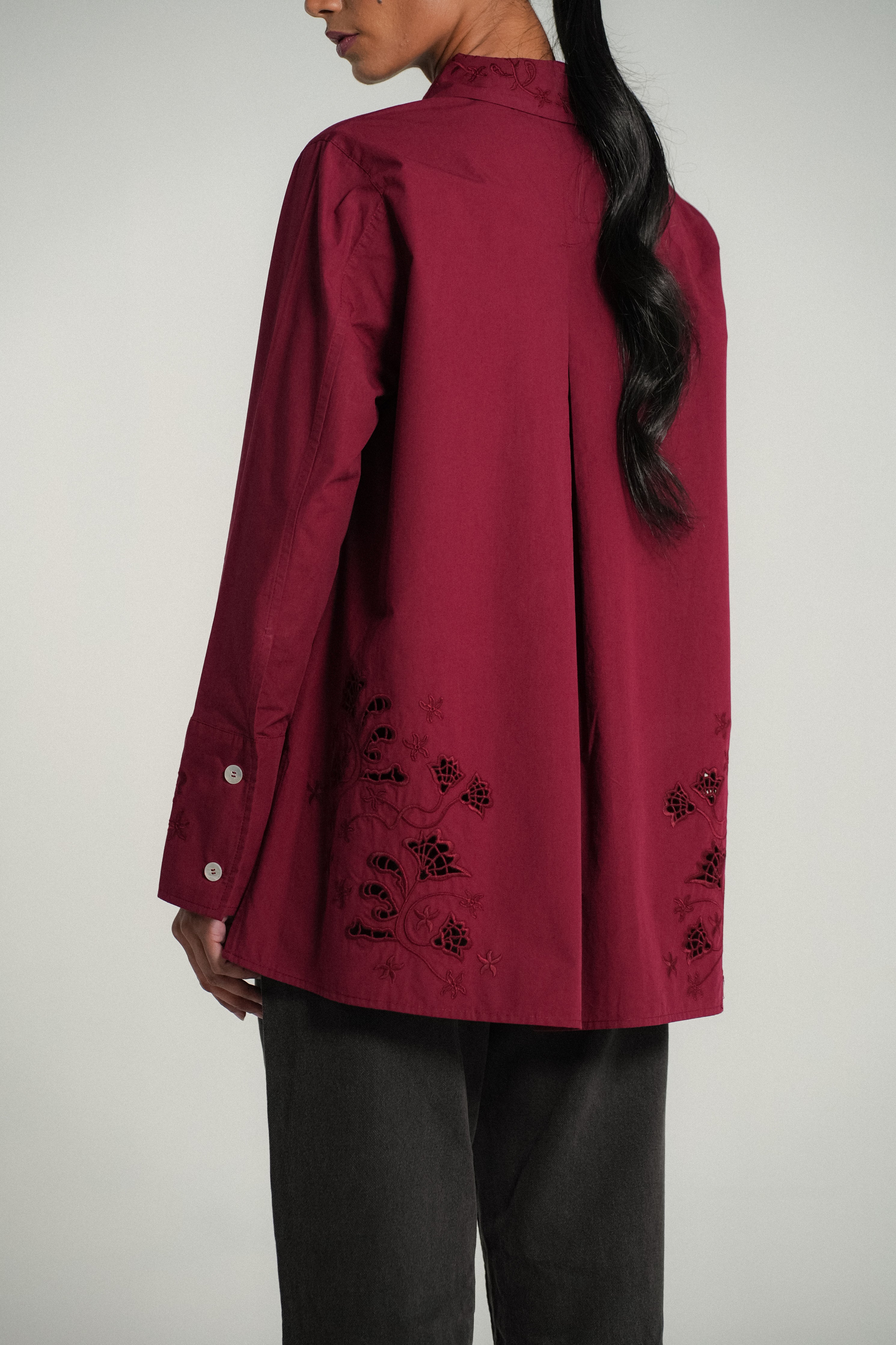 A crisp shirt, rendered in cotton. A relaxed fit with side slits that features delicate flower embroidery on the pointed collar. Intricate eyelet embroidery both front and back, finished with embroidered cuffs on slim-cut sleeves.