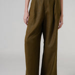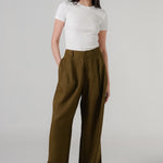High-waisted trousers, with front pleats. A full-length relaxed fit. Rendered in 100% linen. Featuring side pockets, and finished with a back welt pocket.