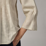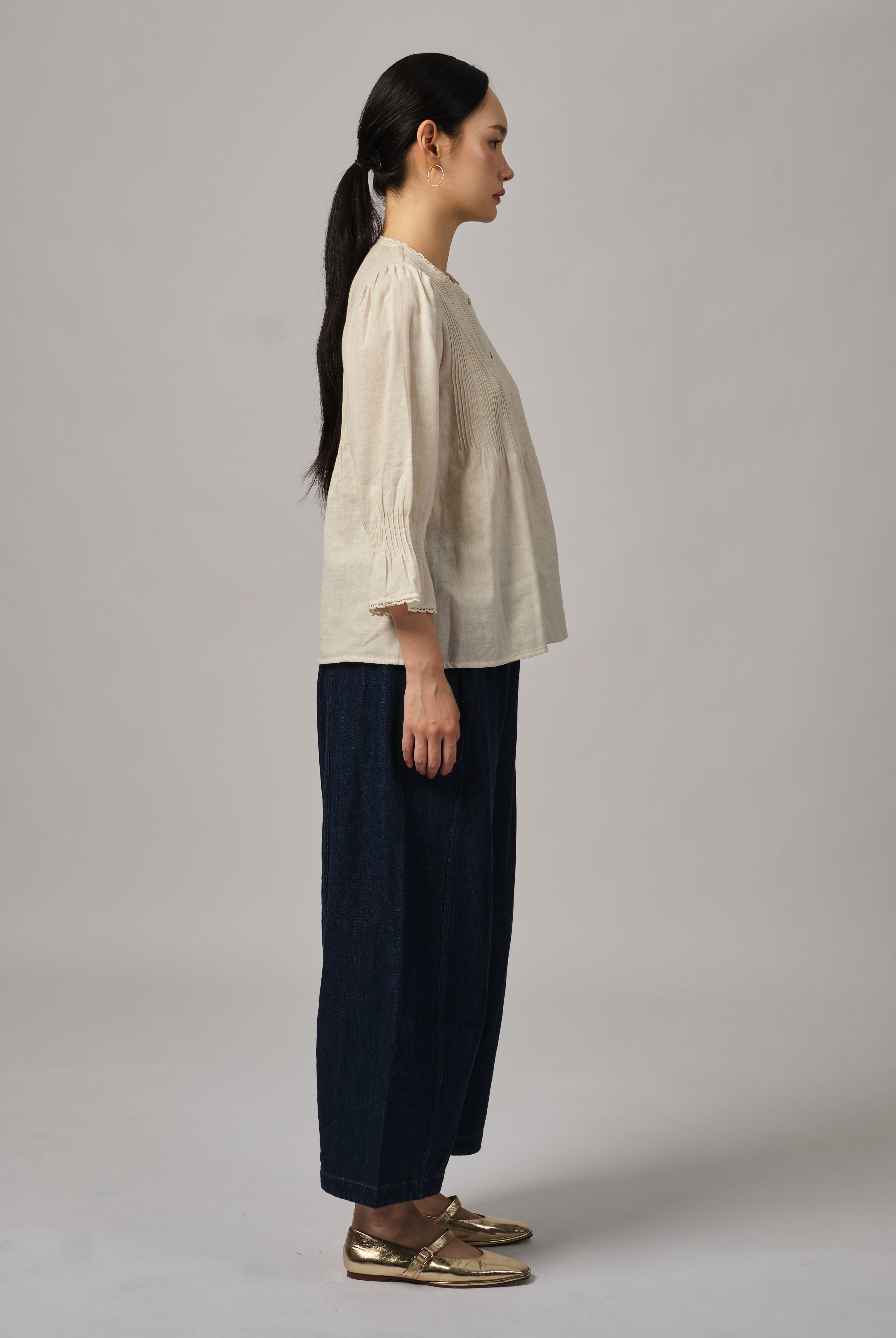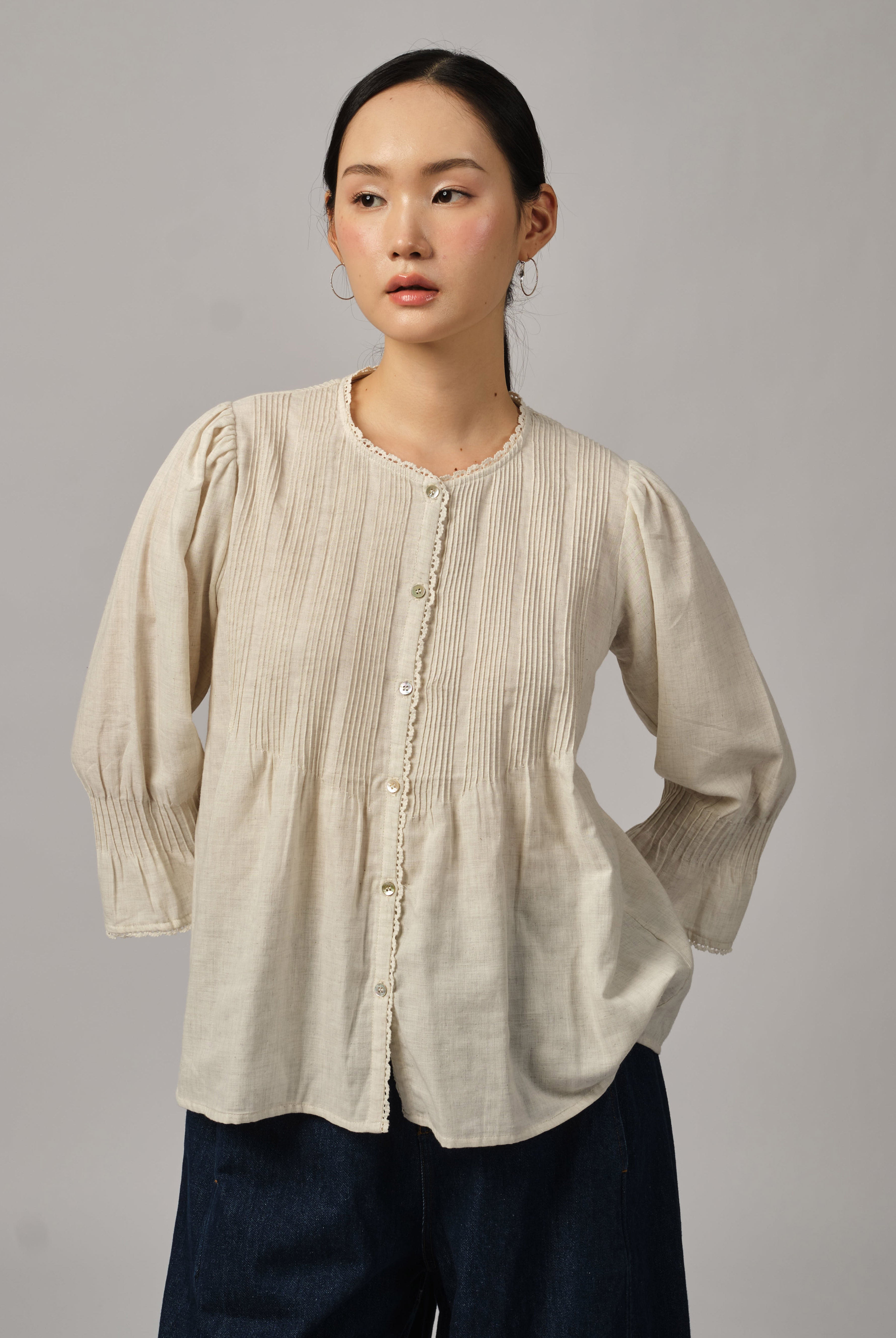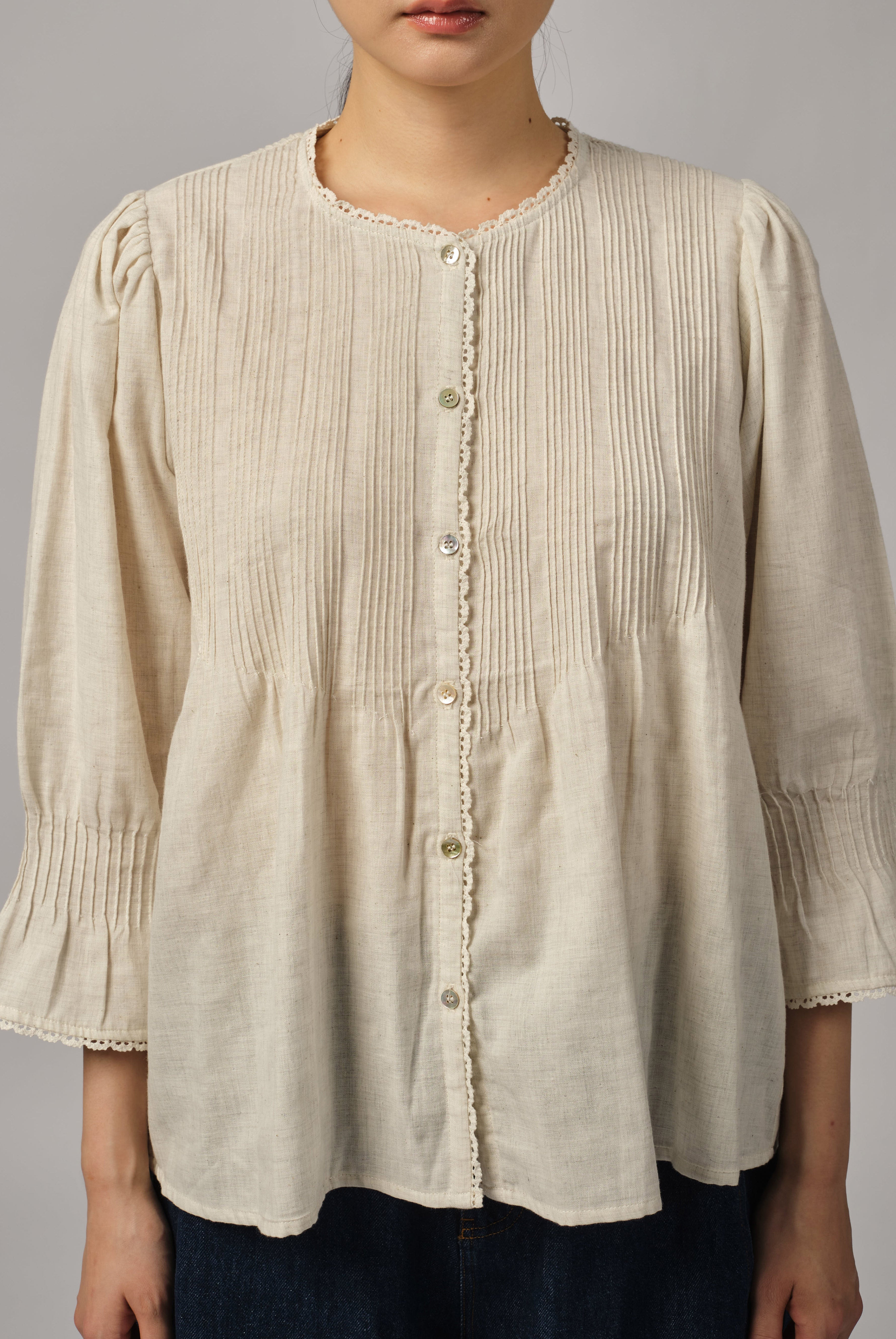 A relaxed, feminine silhouette in cotton. Features micro pintuck detailing and a round neck with lace-trimmed button opening. Finished with bracelet-length sleeves.