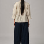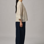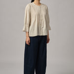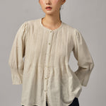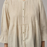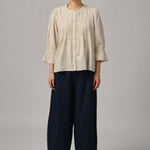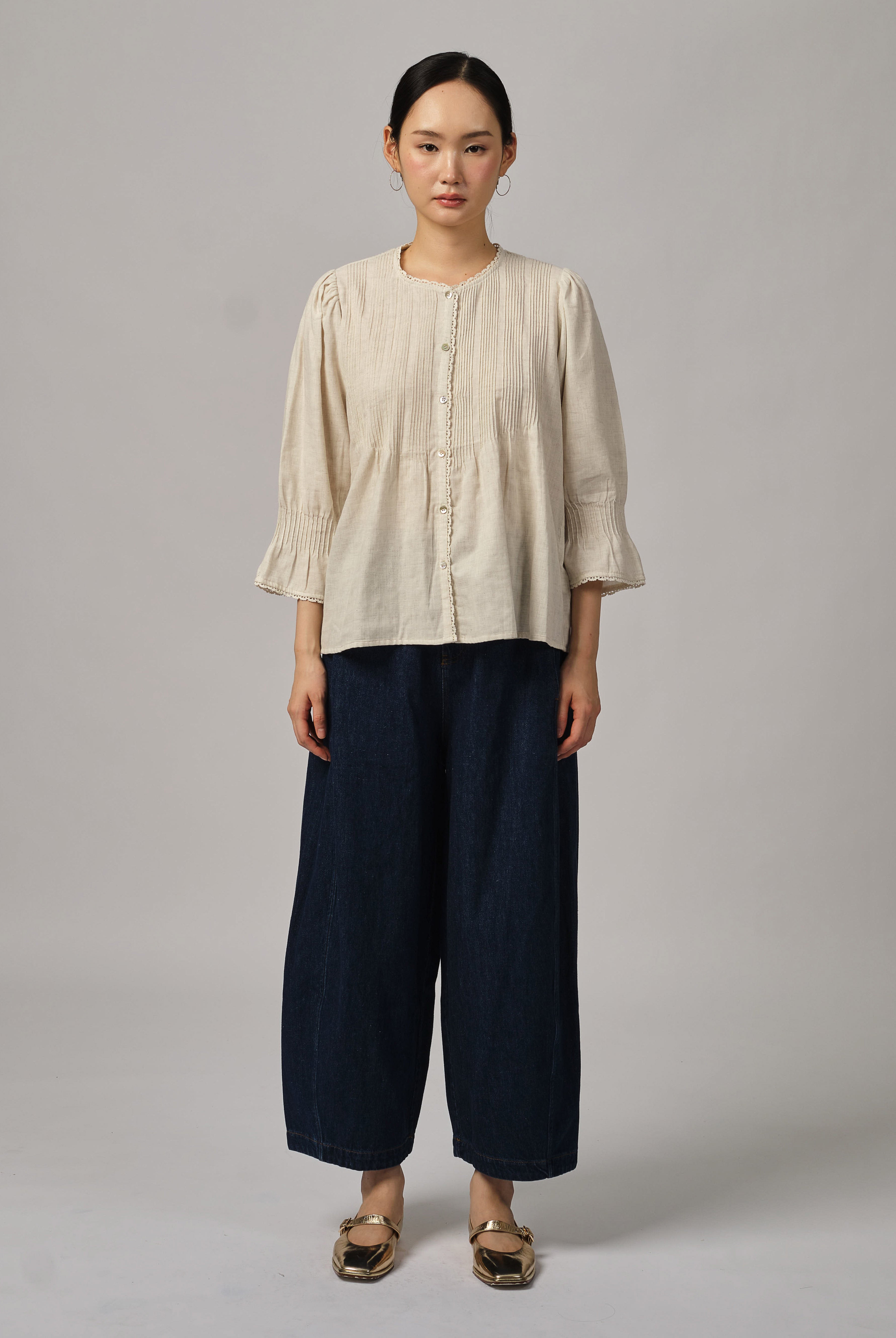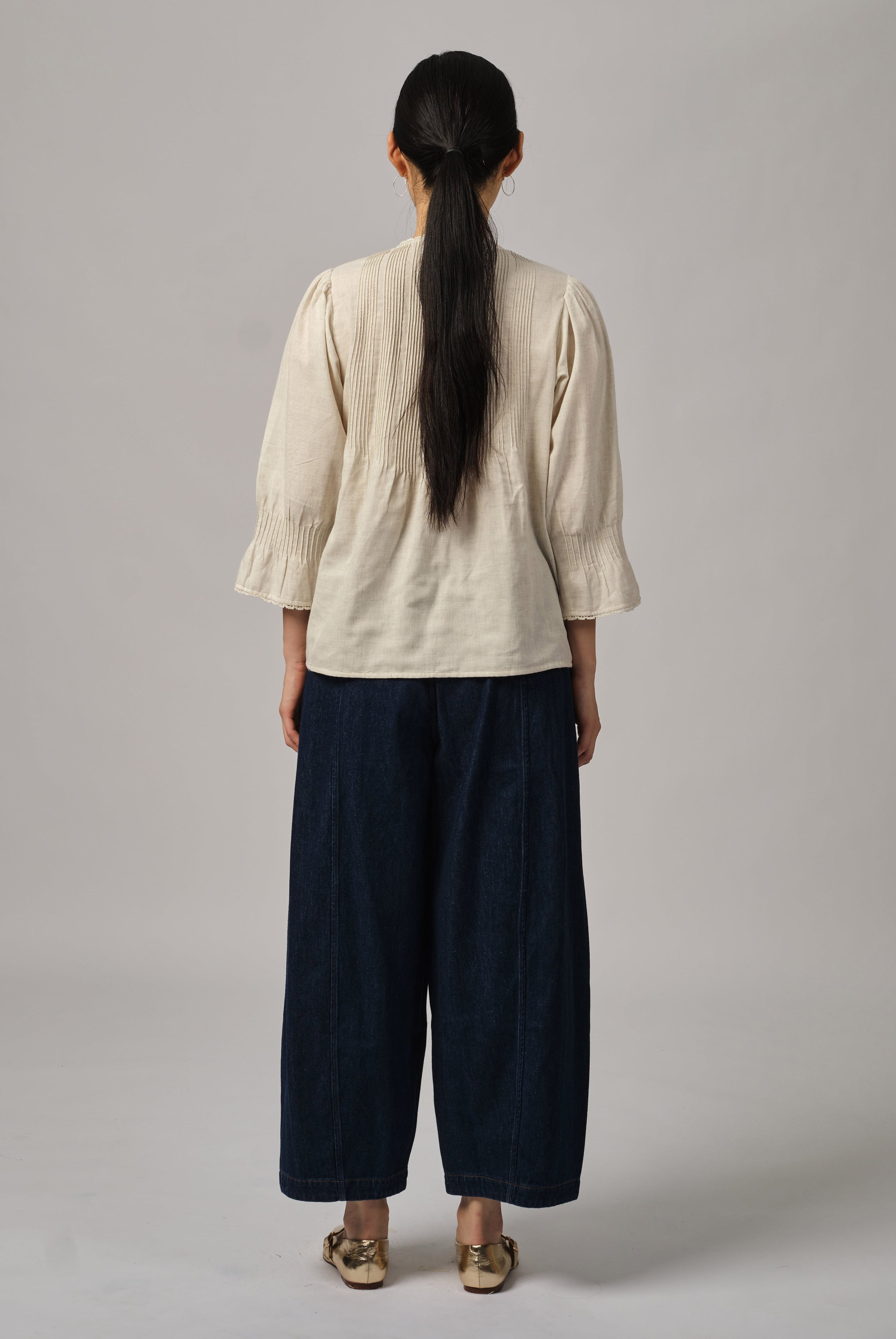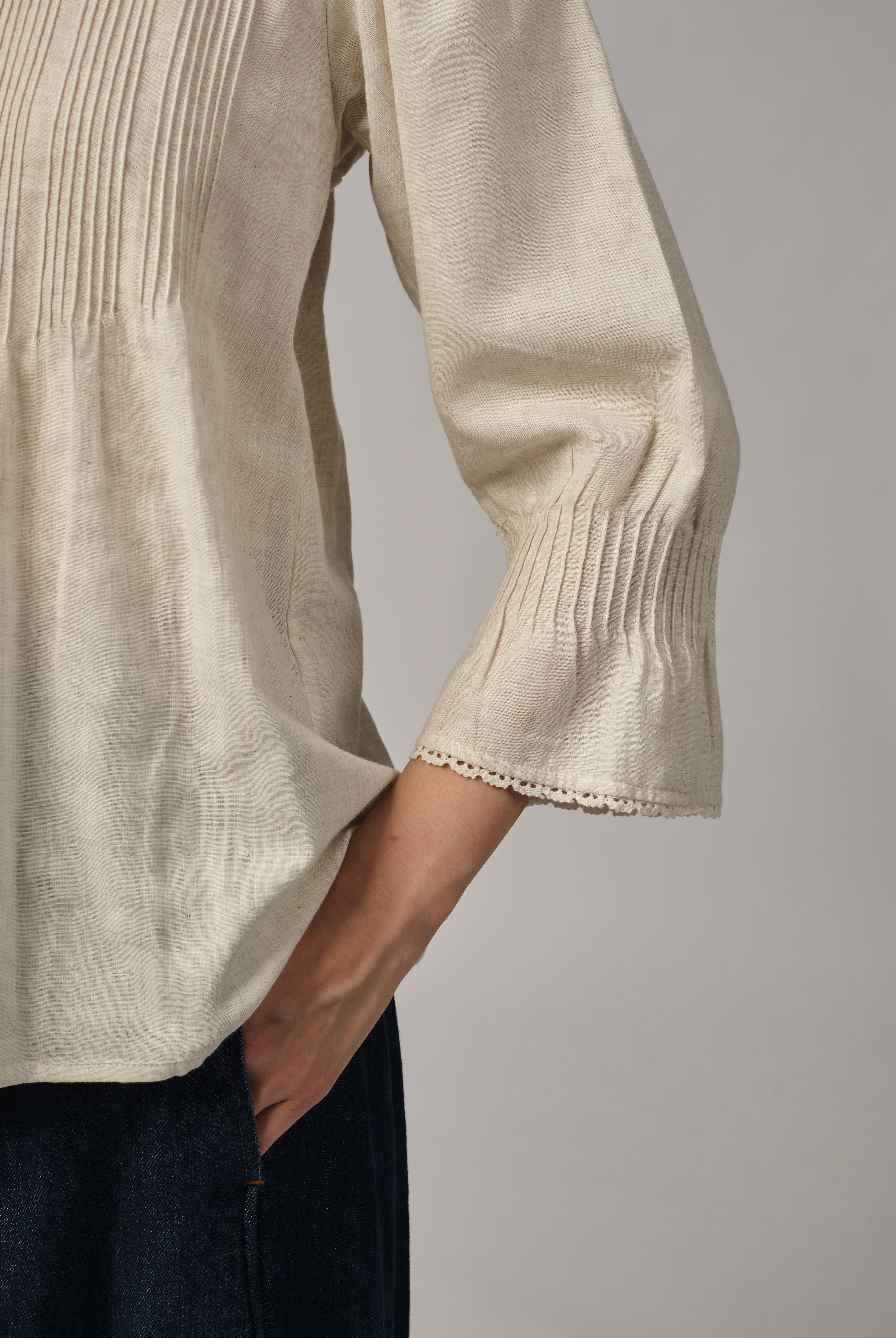 A relaxed, feminine silhouette in cotton. Features micro pintuck detailing and a round neck with lace-trimmed button opening. Finished with bracelet-length sleeves.