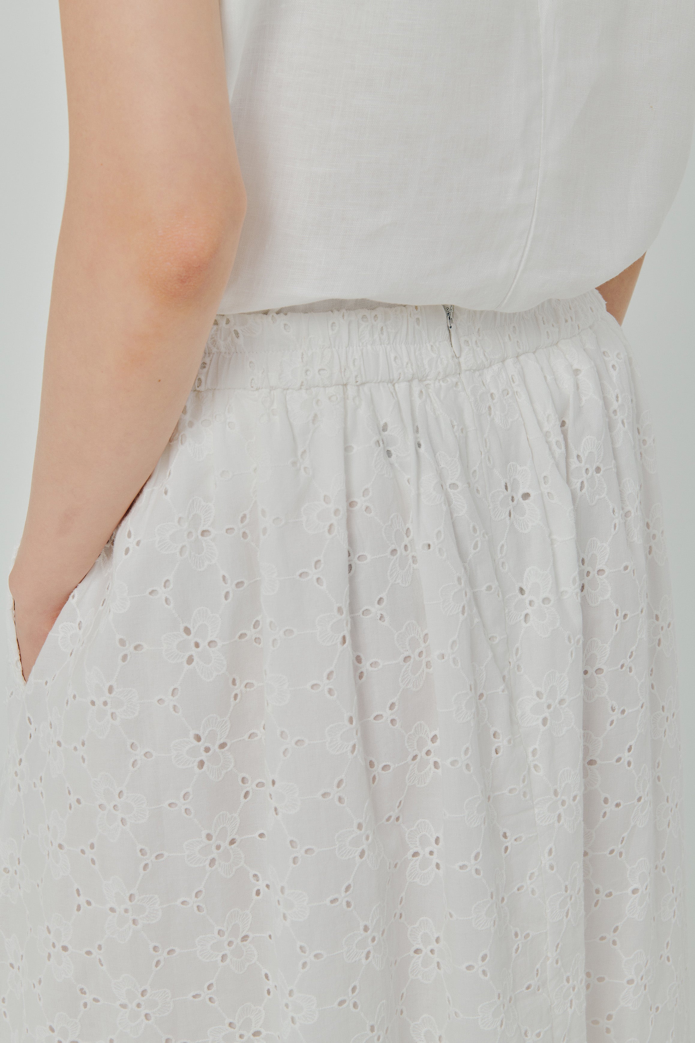 A-line midi skirt, with box pleat details. Features a half-elastic waistband and side pockets Rendered in cotton broderie, and lined in cotton.