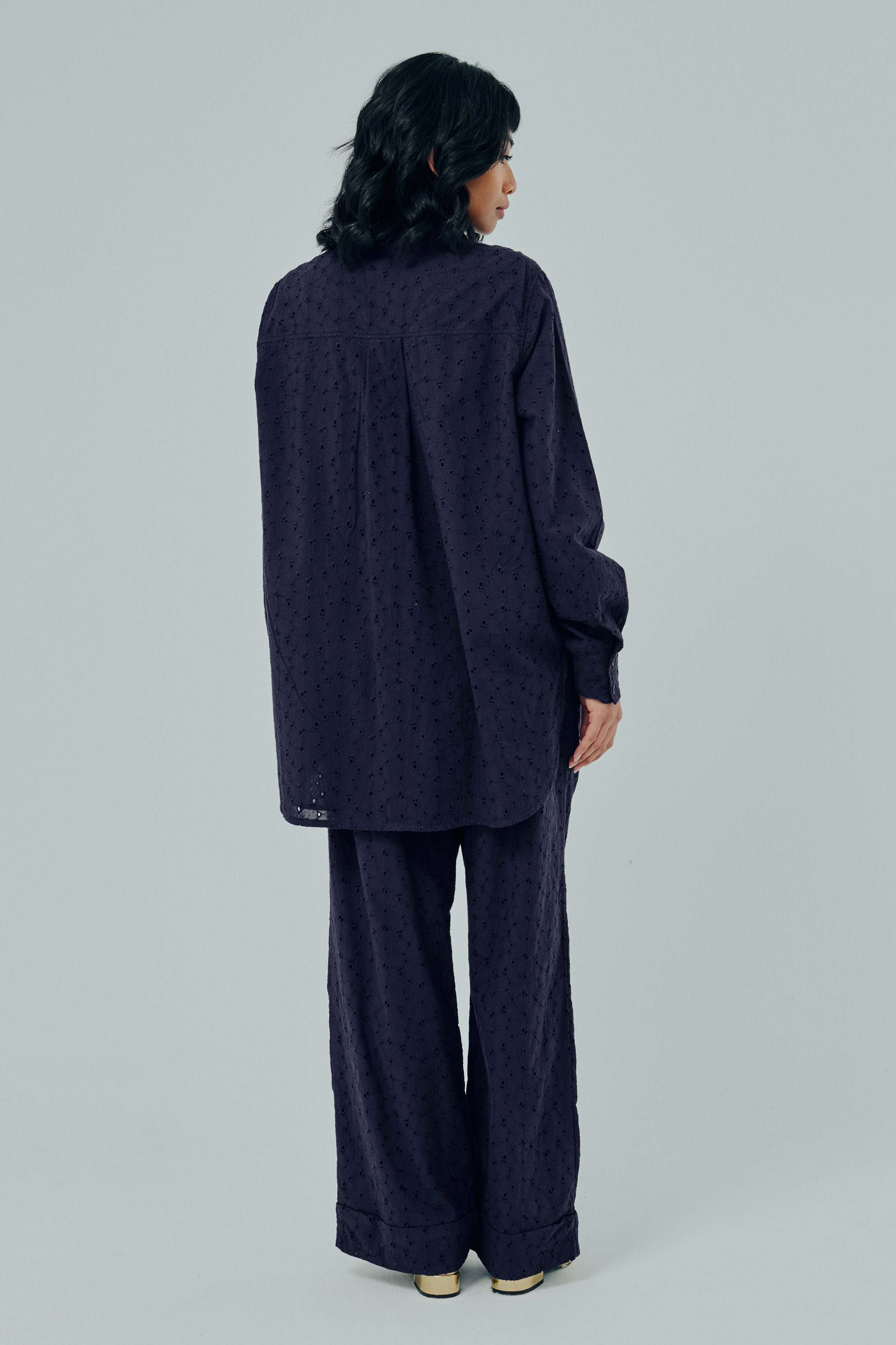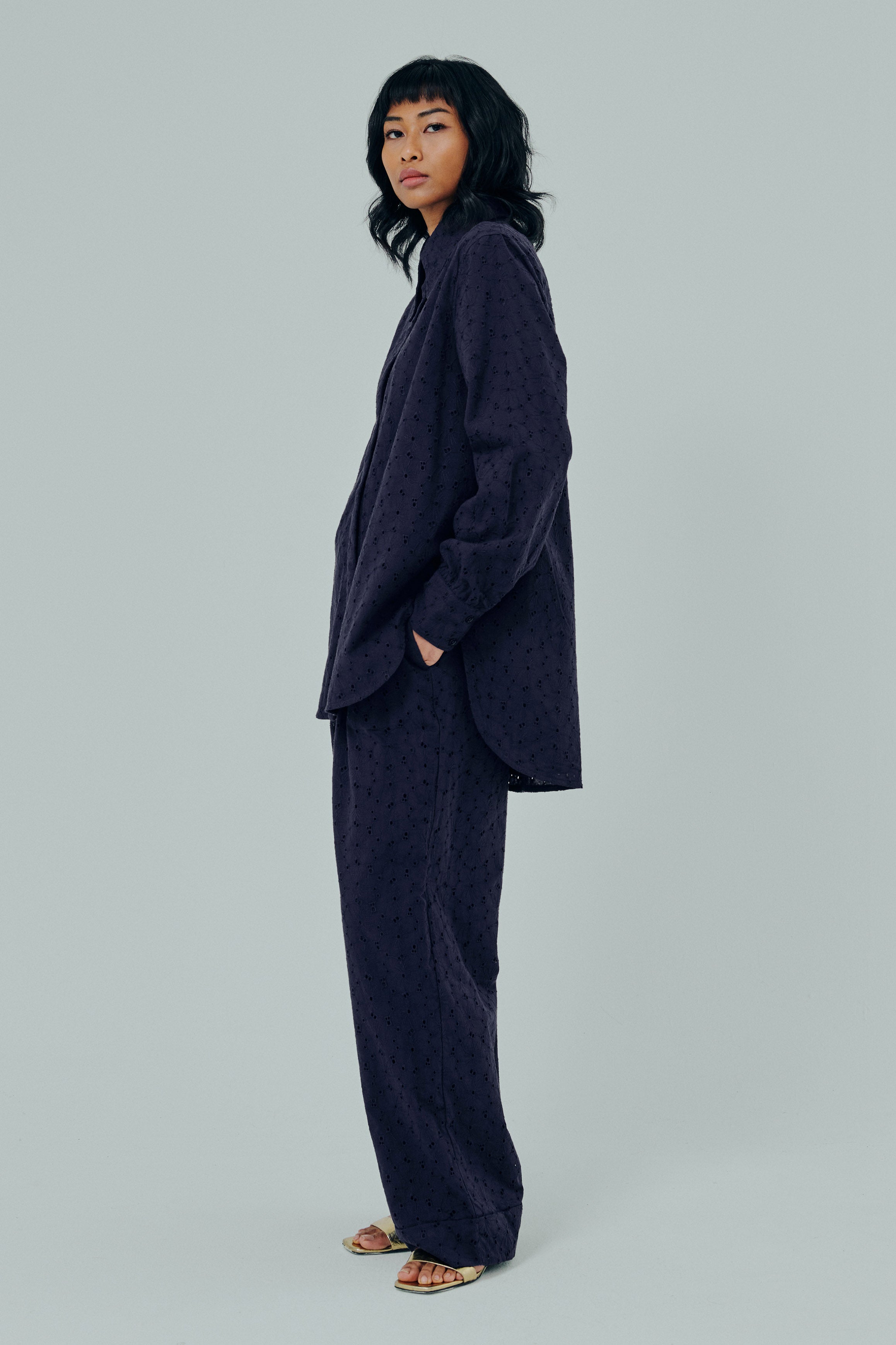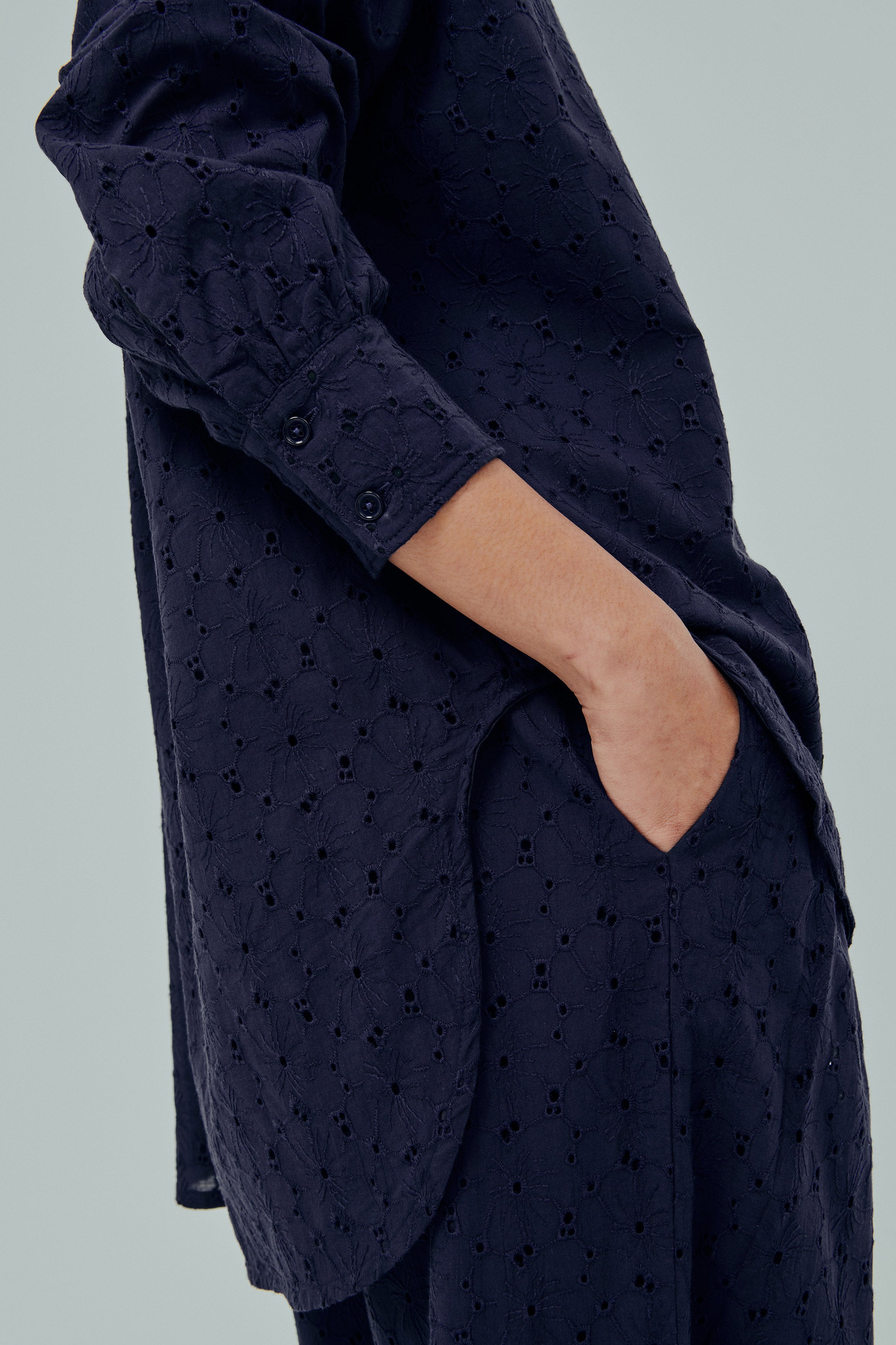 A relaxed fit rendered in cotton broderie, with a high-low hem. Finished with a concealed placket, buttoned cuffs, and full cotton lining.