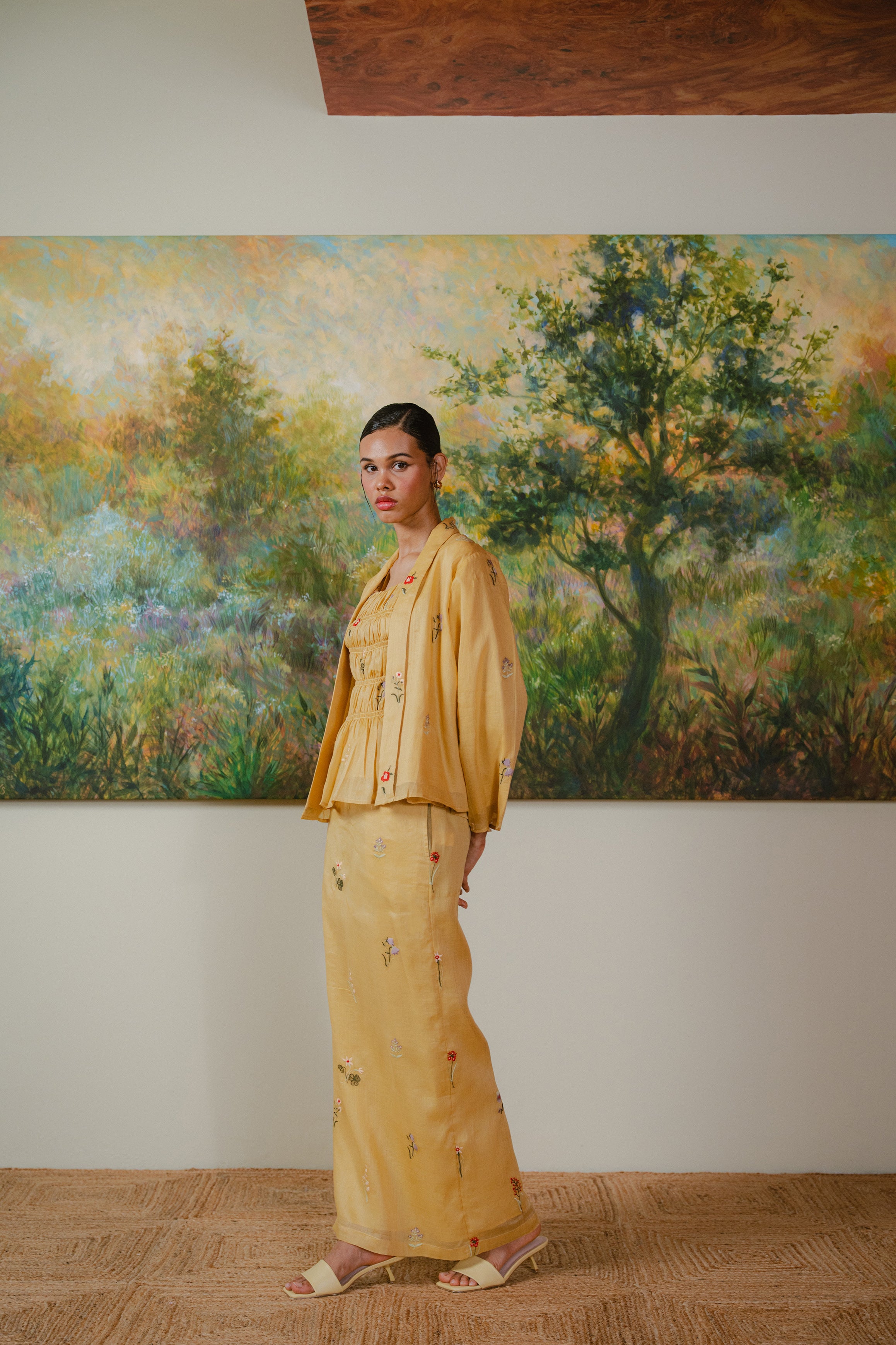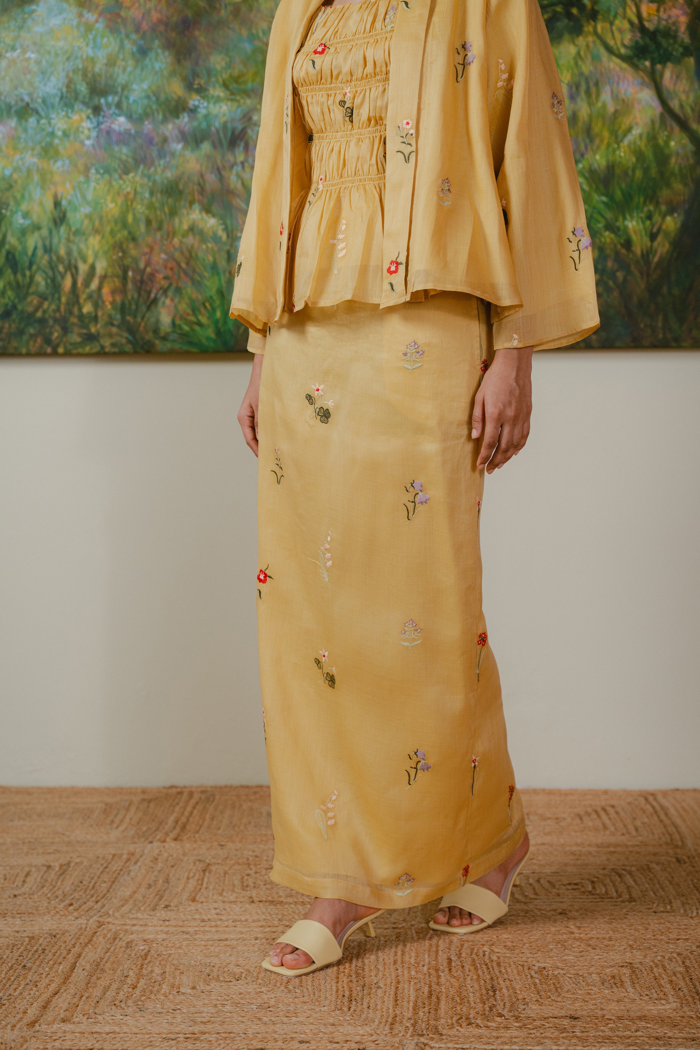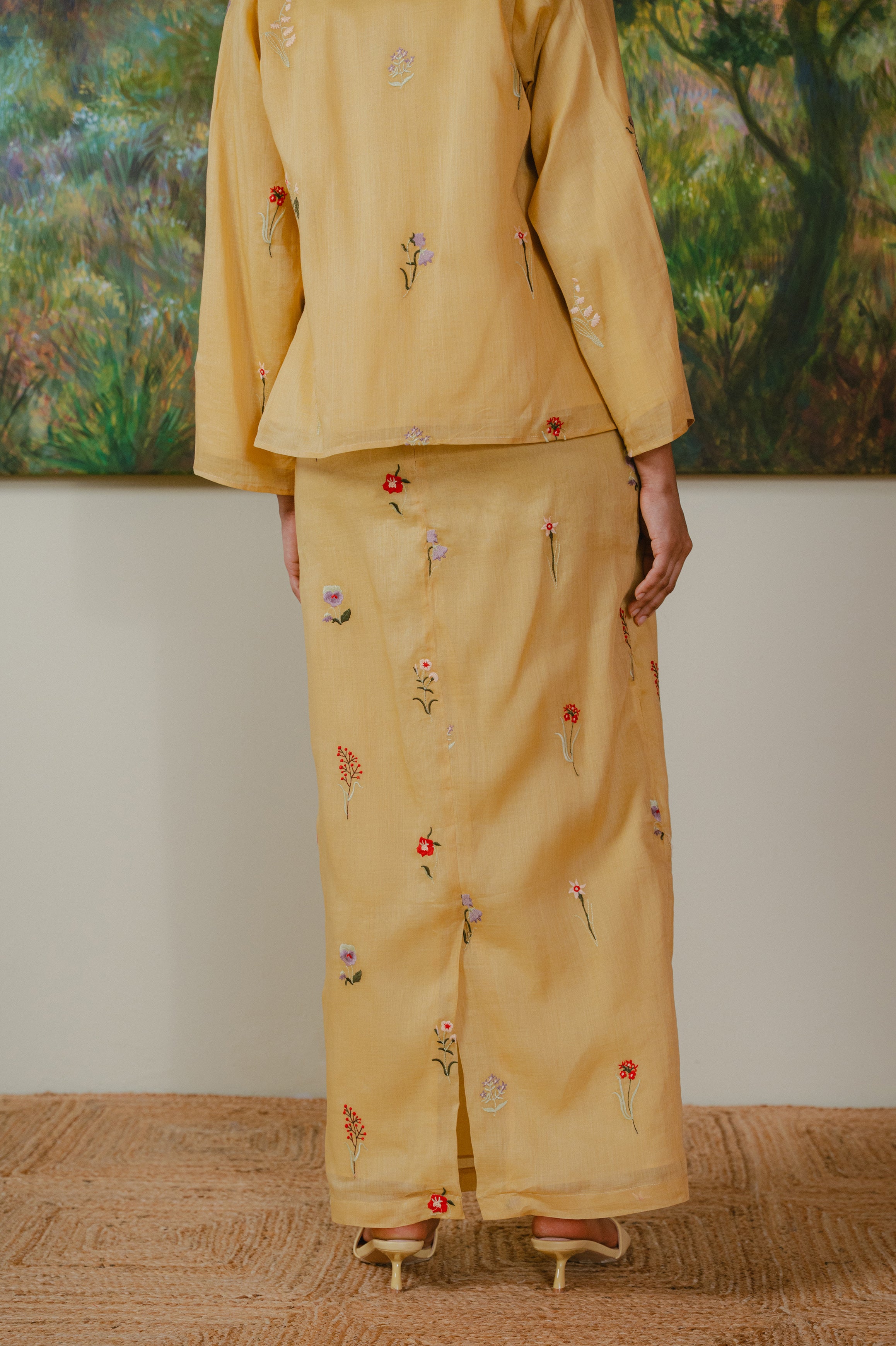 A pencil skirt, rendered ramie with intricate embroidered blossoms, and lined with cotton. Features a half-elastic waistband, side pockets, and an inverted back pleat for movement.
