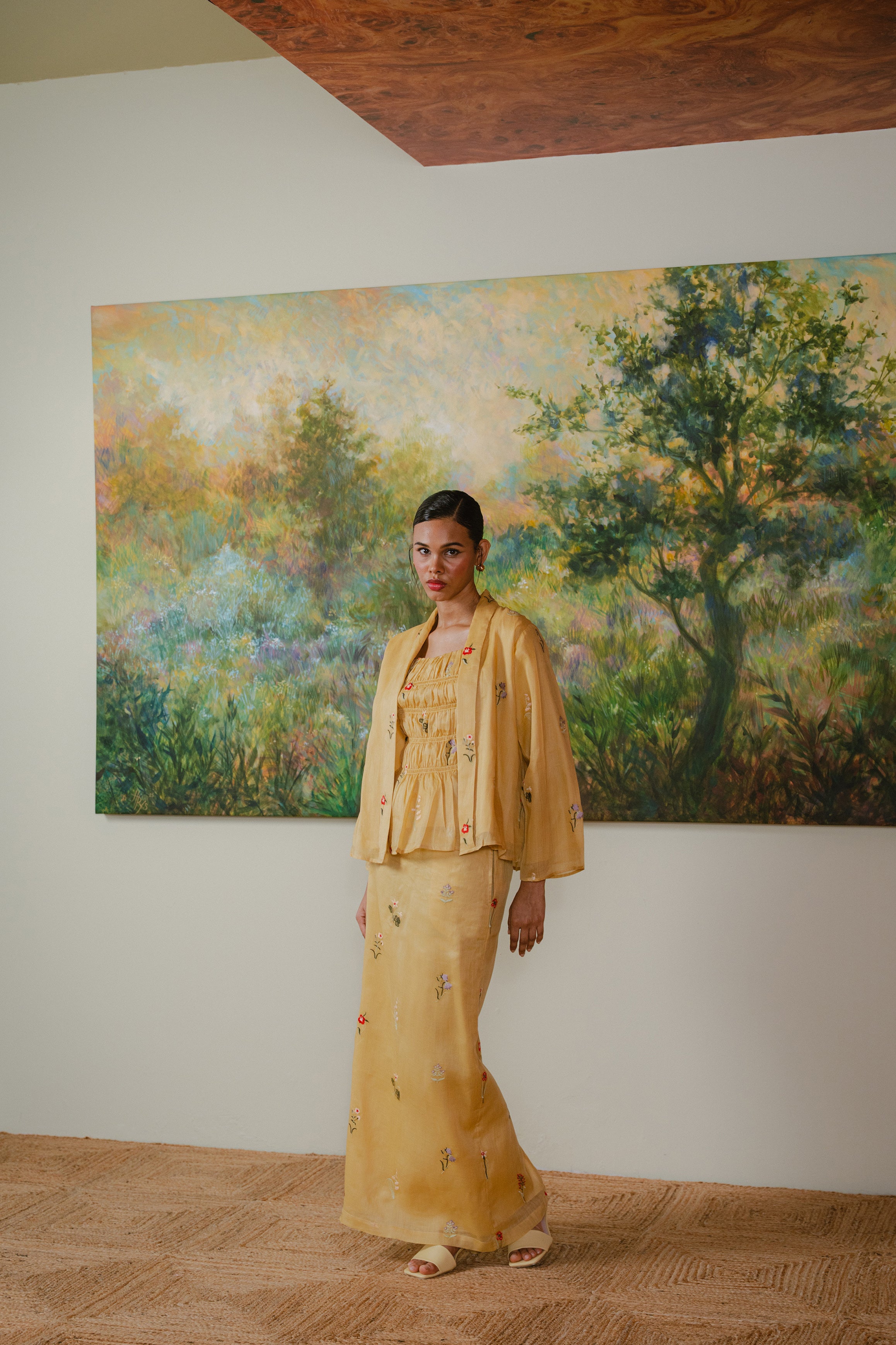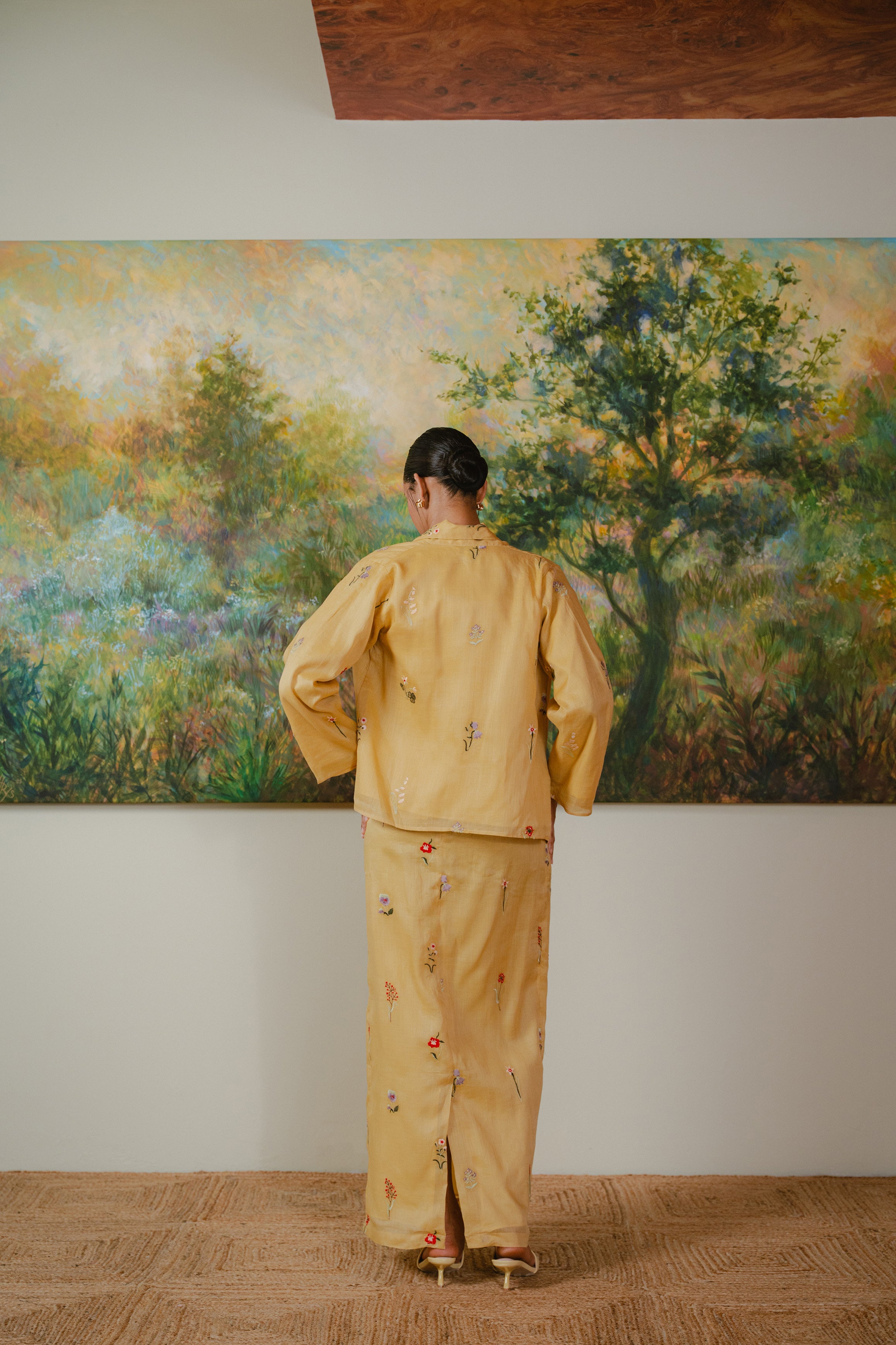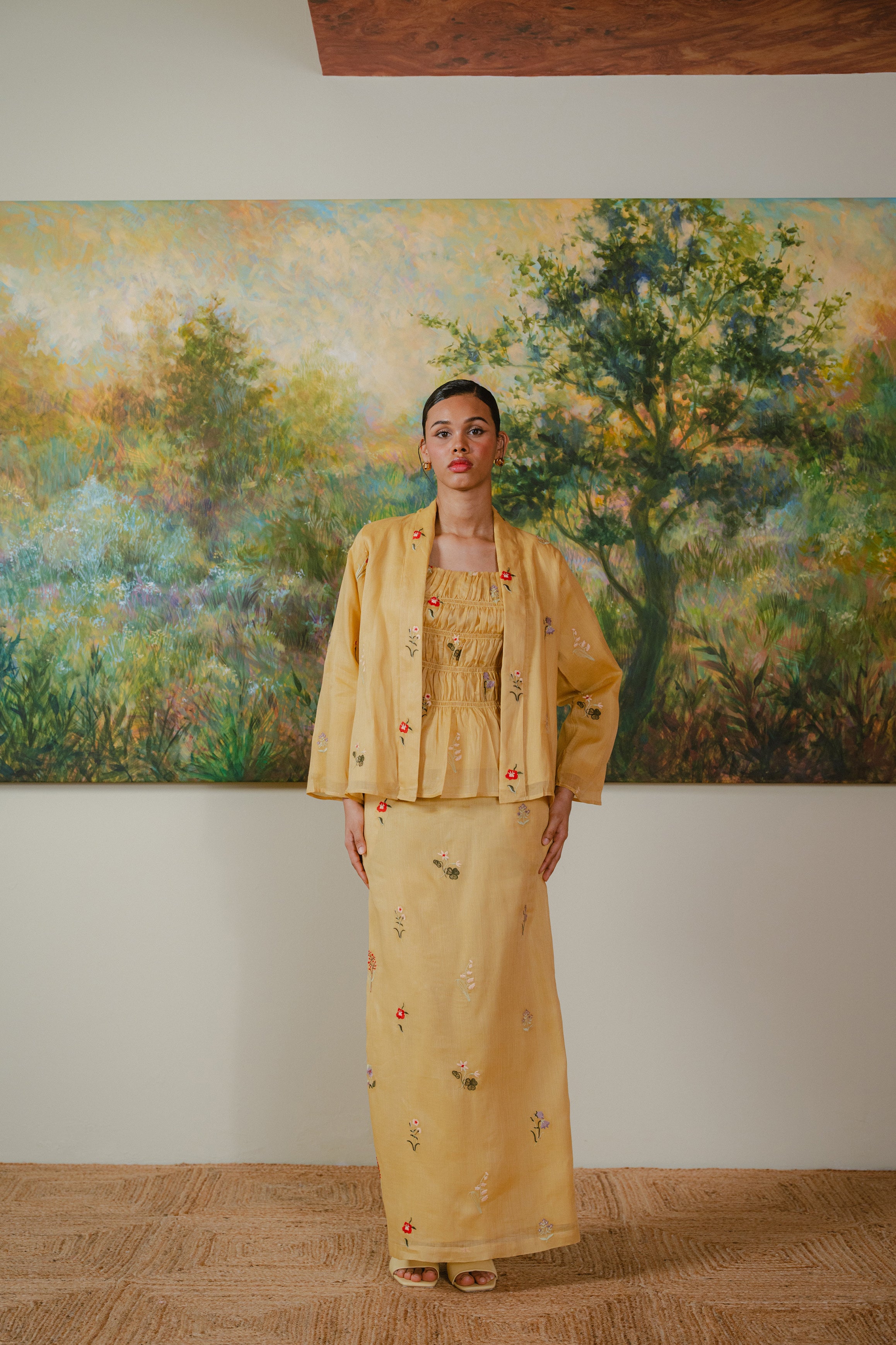 A pencil skirt, rendered ramie with intricate embroidered blossoms, and lined with cotton. Features a half-elastic waistband, side pockets, and an inverted back pleat for movement.