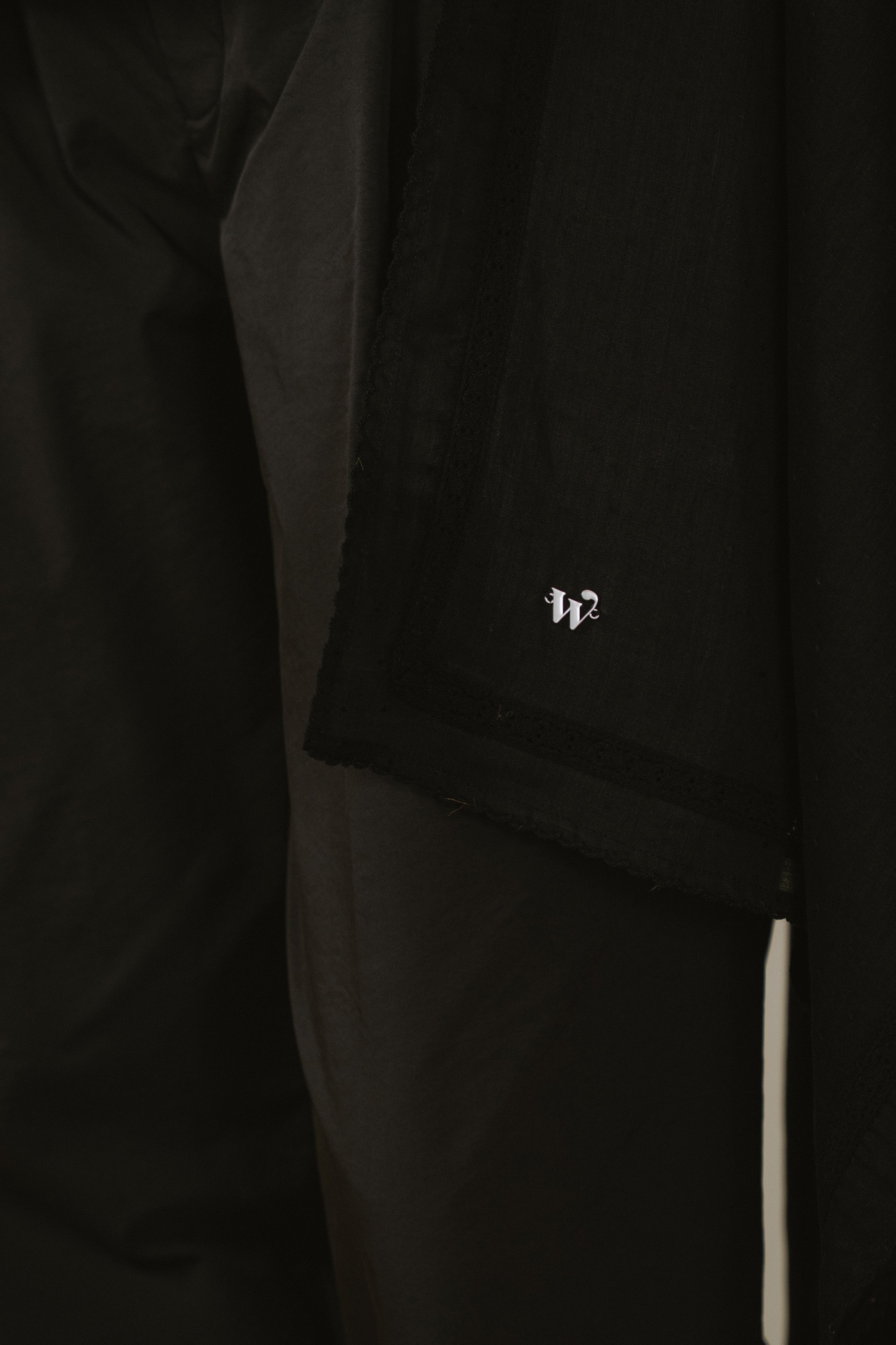 A refined essential, rendered in 100% ramie. This selendang is framed with intricate crochet trimming and finished with a subtle W metal logo. Wear it on your shoulder, or in a headscarf style to show it off to full effect.