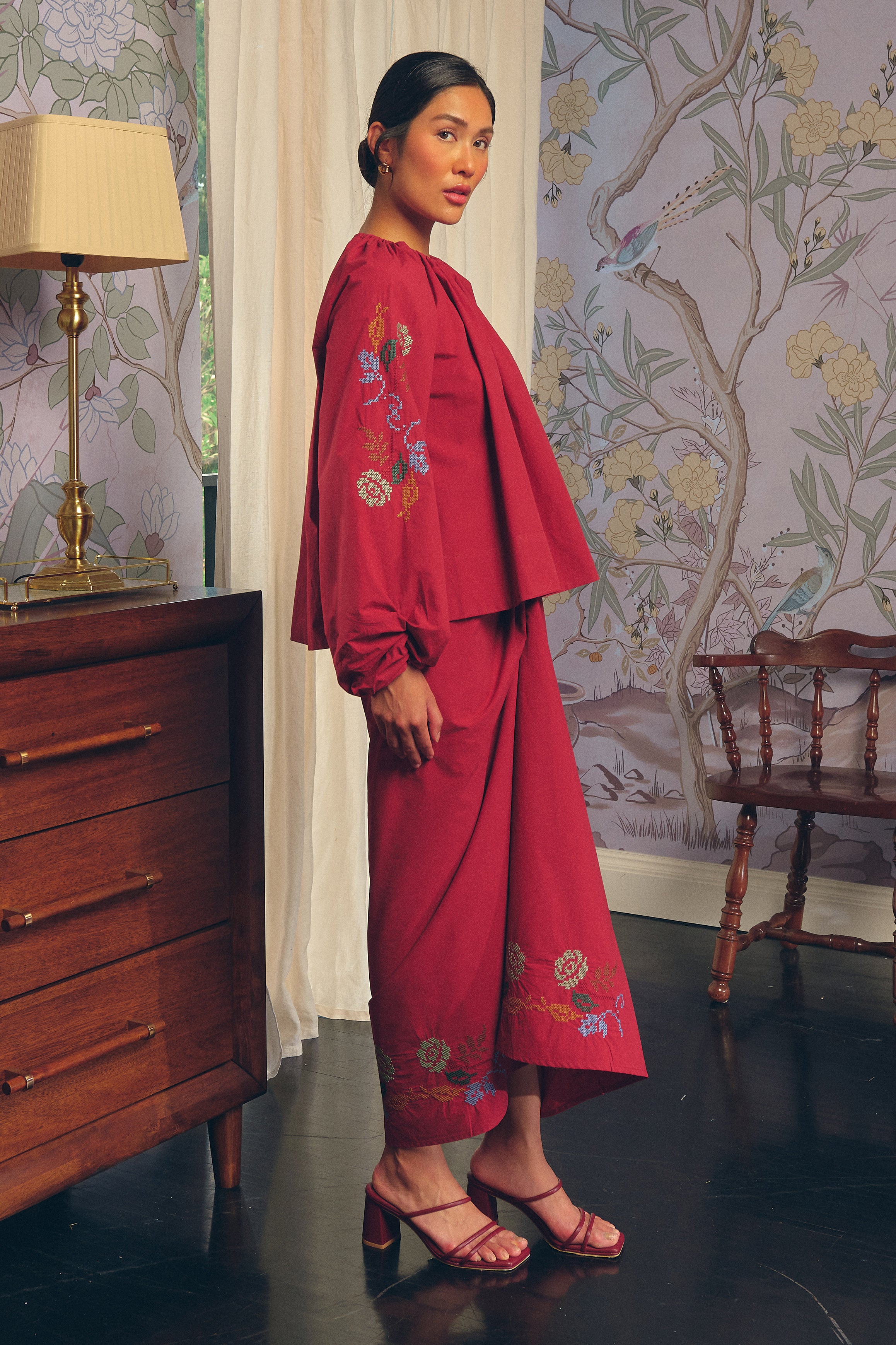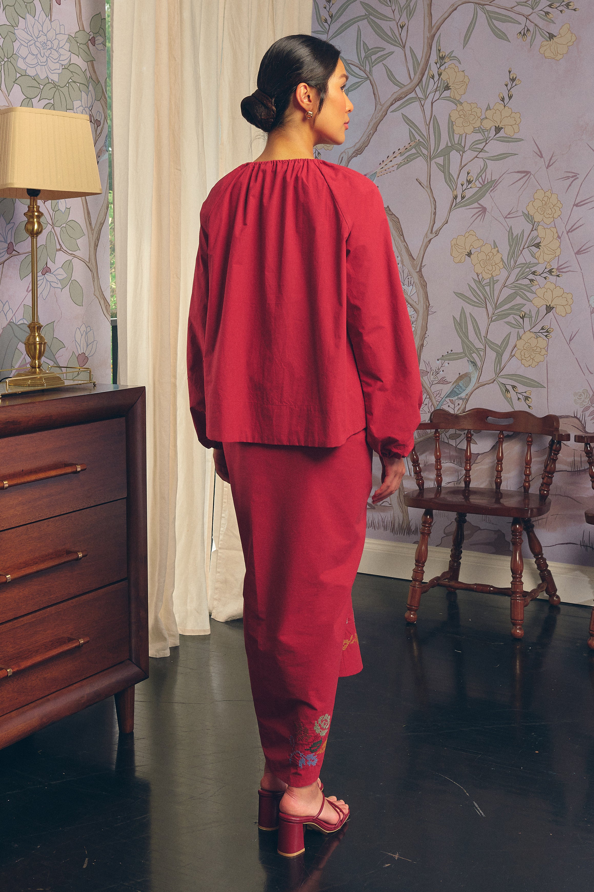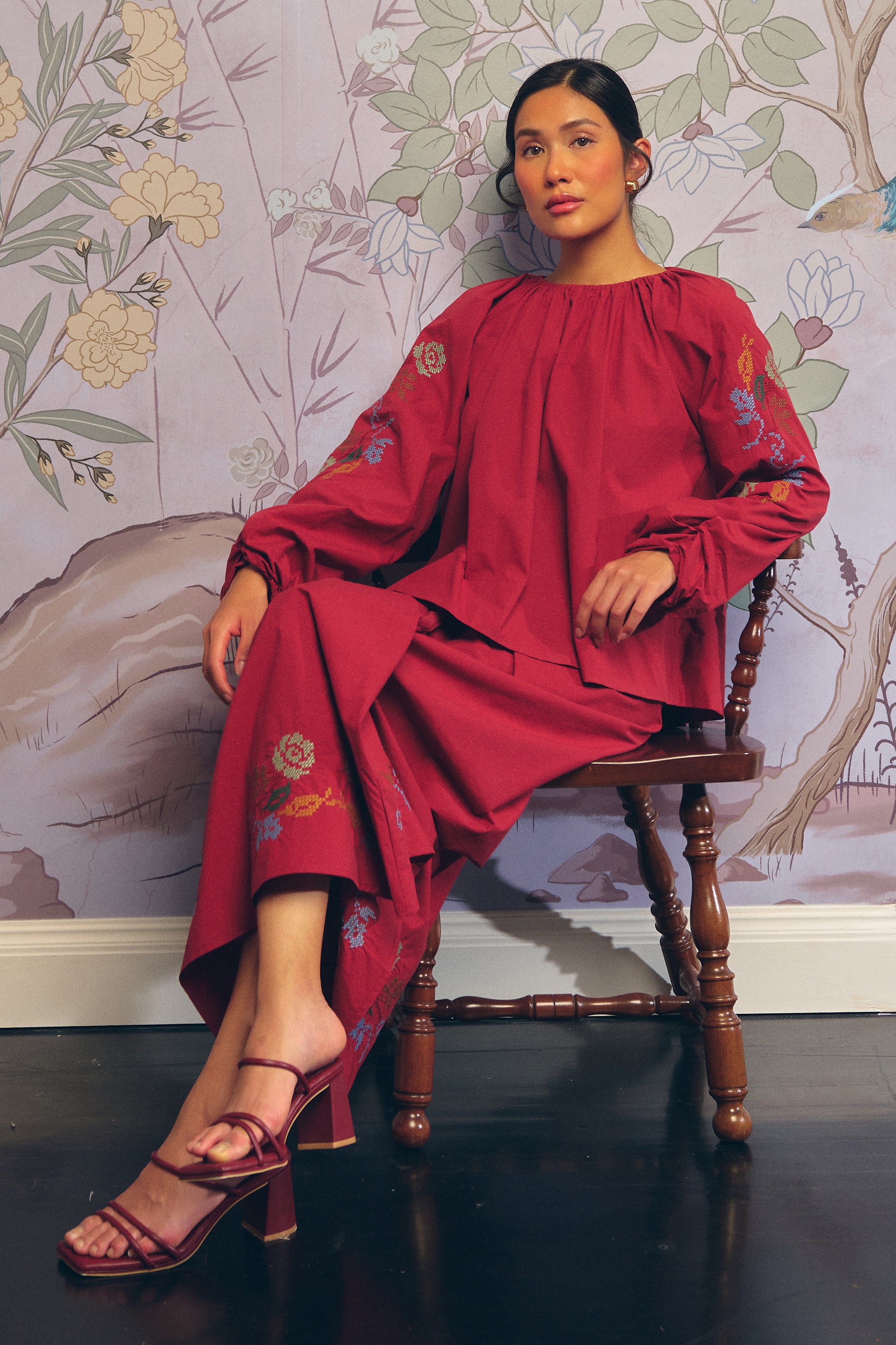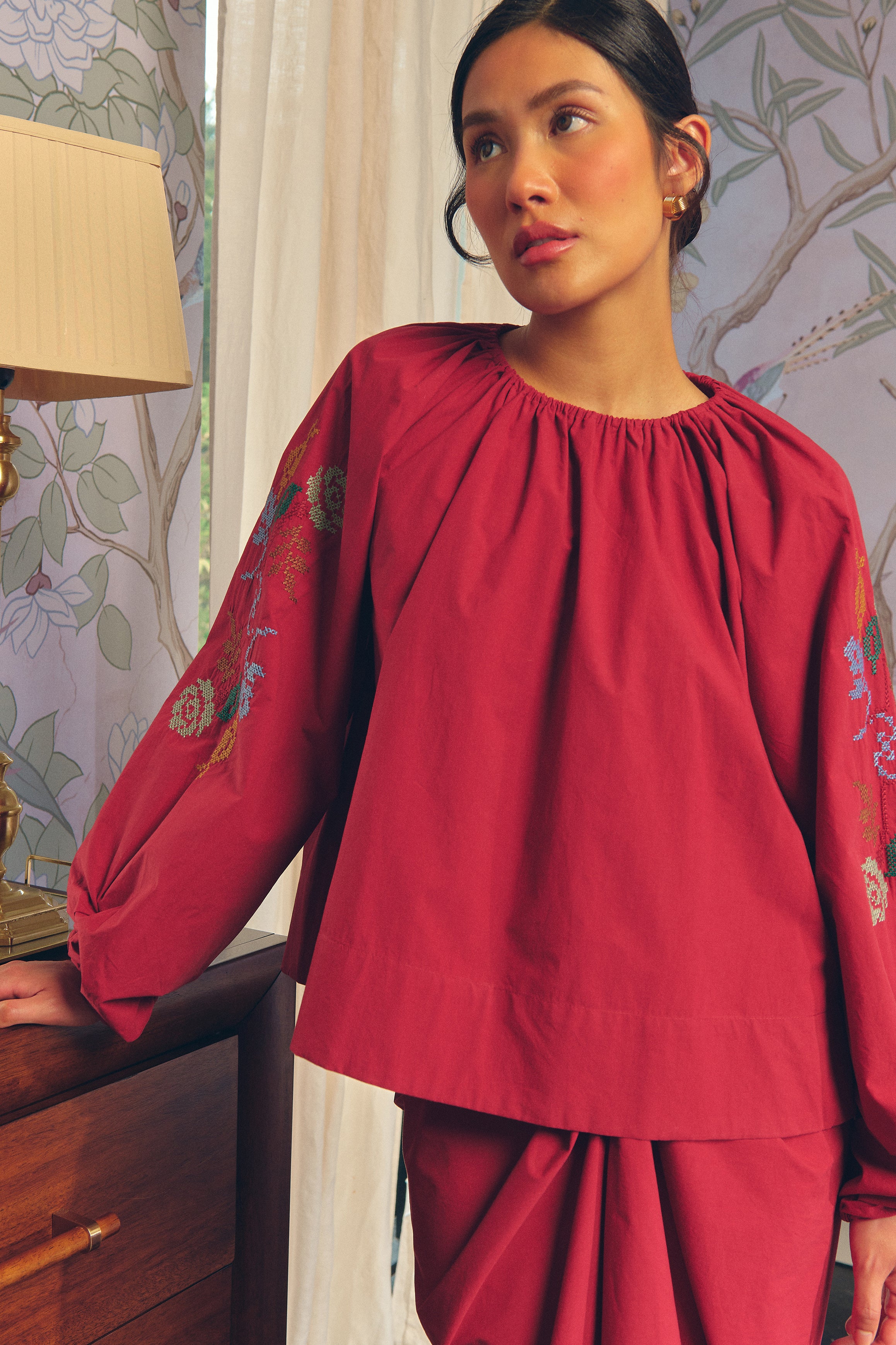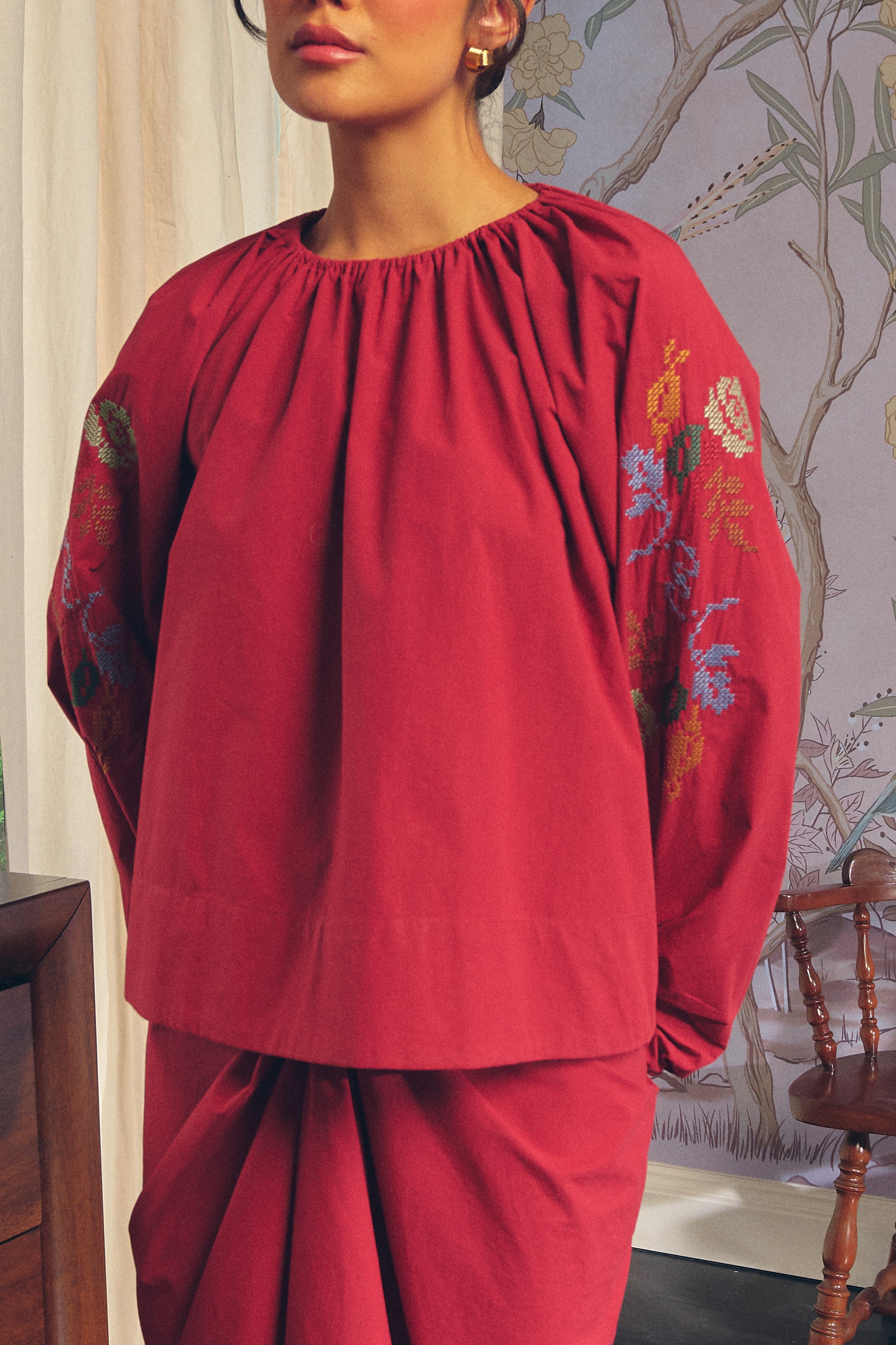 A raglan blouse with a gathered neckline and statement sleeves featuring multicoloured cross stitch detailing. Rendered in Cotton Poplin.