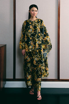An iteration of the classic Kedah fit, rendered in ramie and lined with cotton. The set includes a top with intricate multi-tone floral embroidery, finished with tulip-cut sleeves, side slits, and a front button closure. Finished with a matching, slip-on knot skirt.