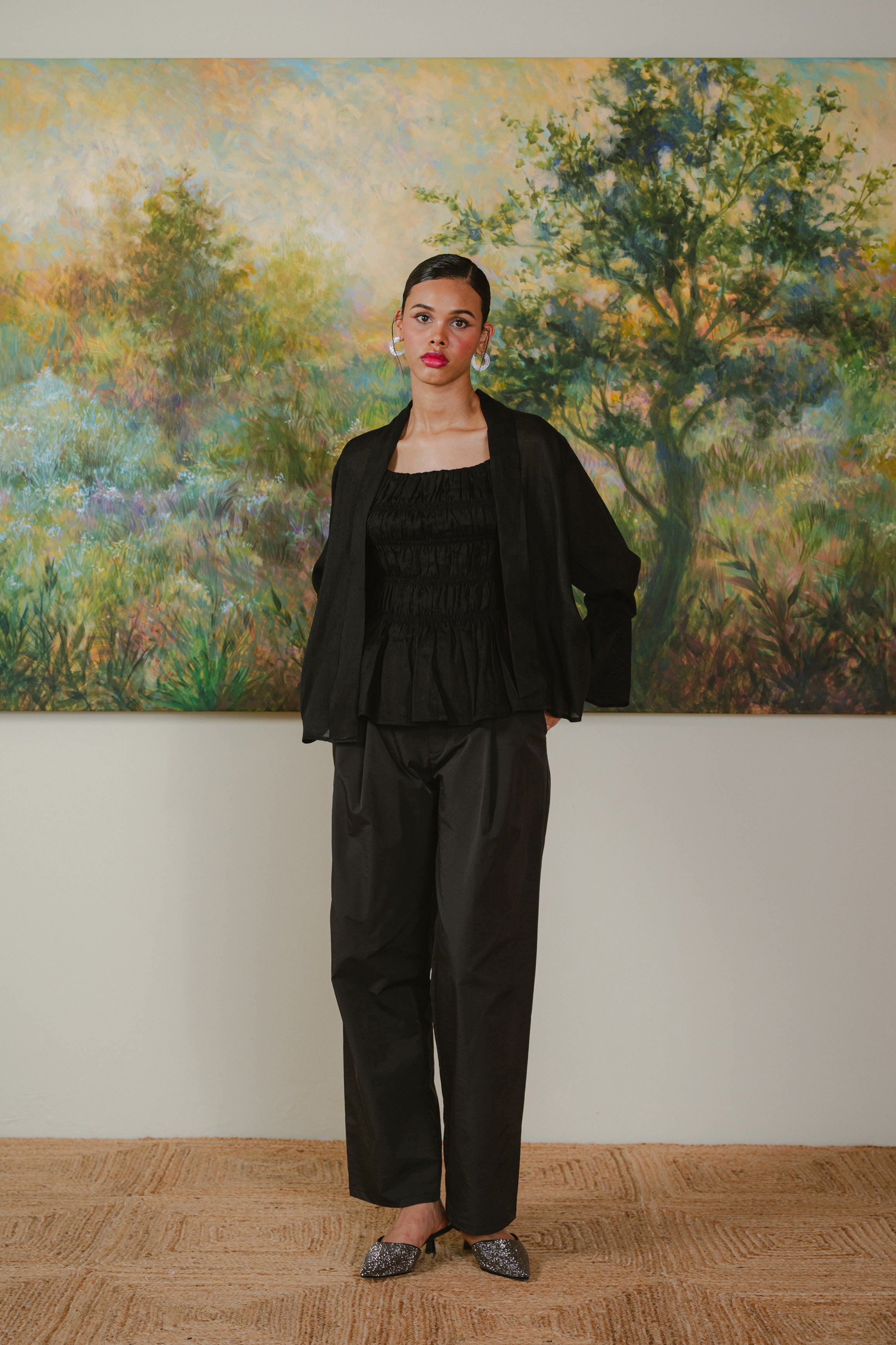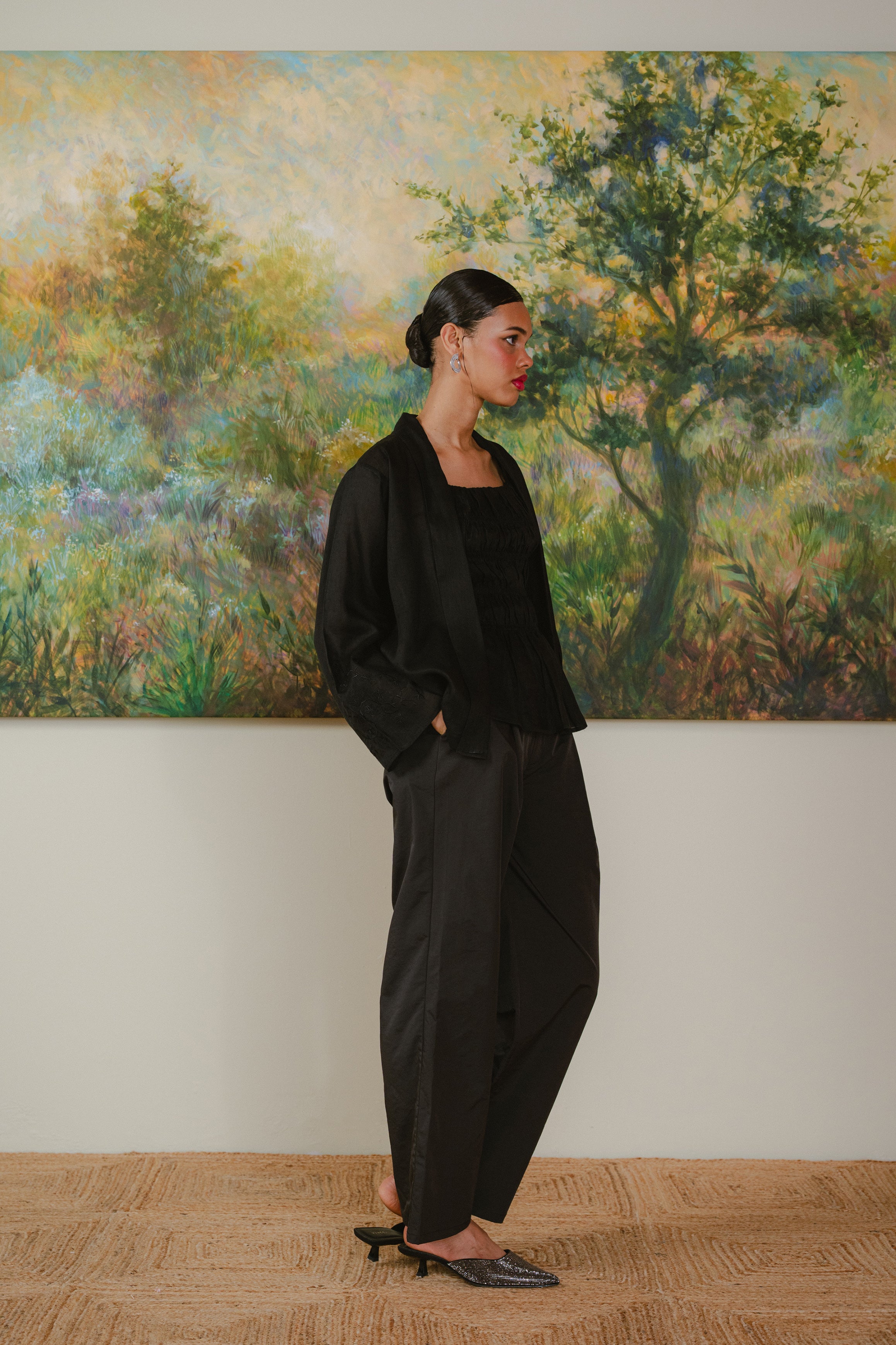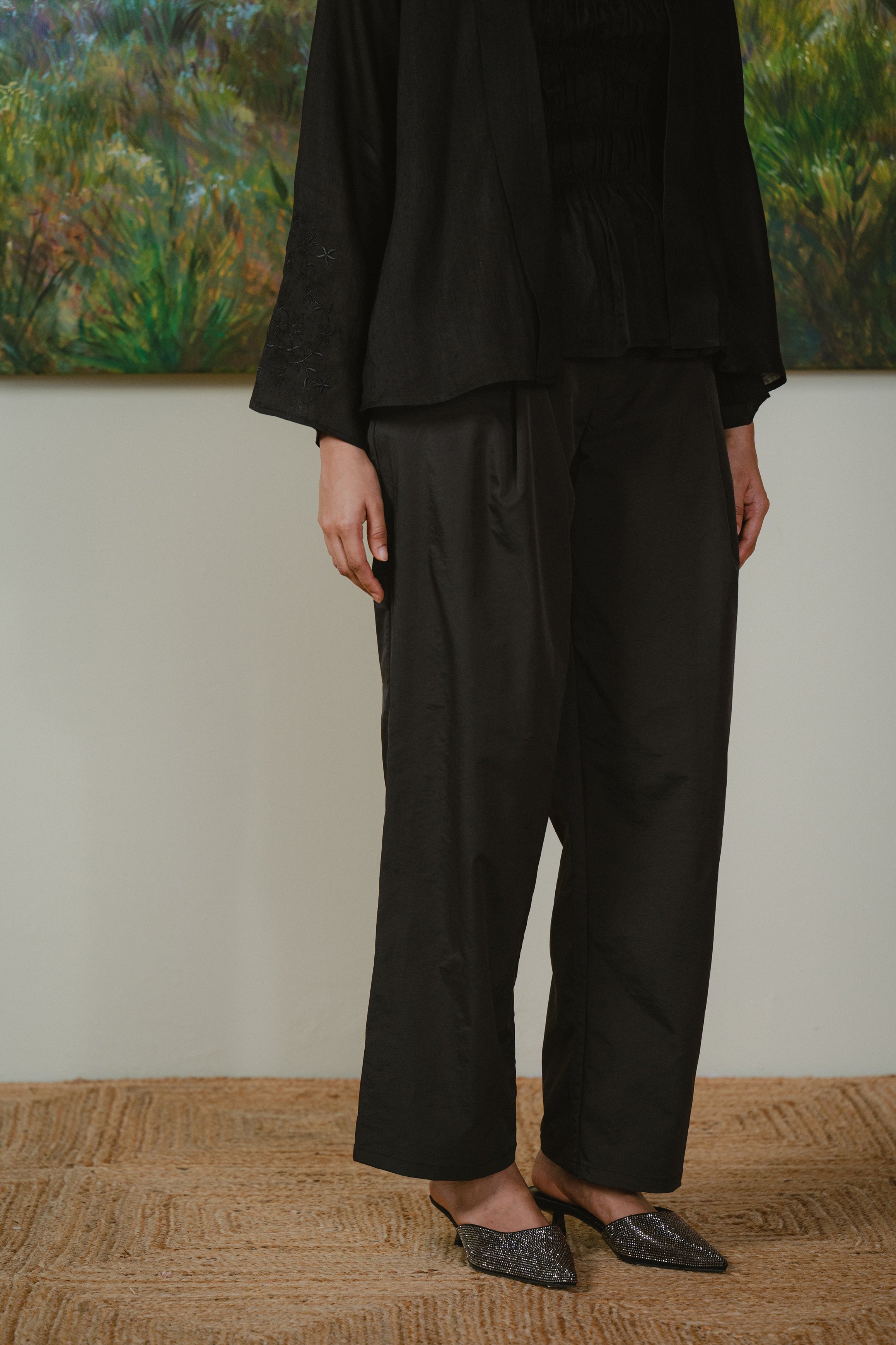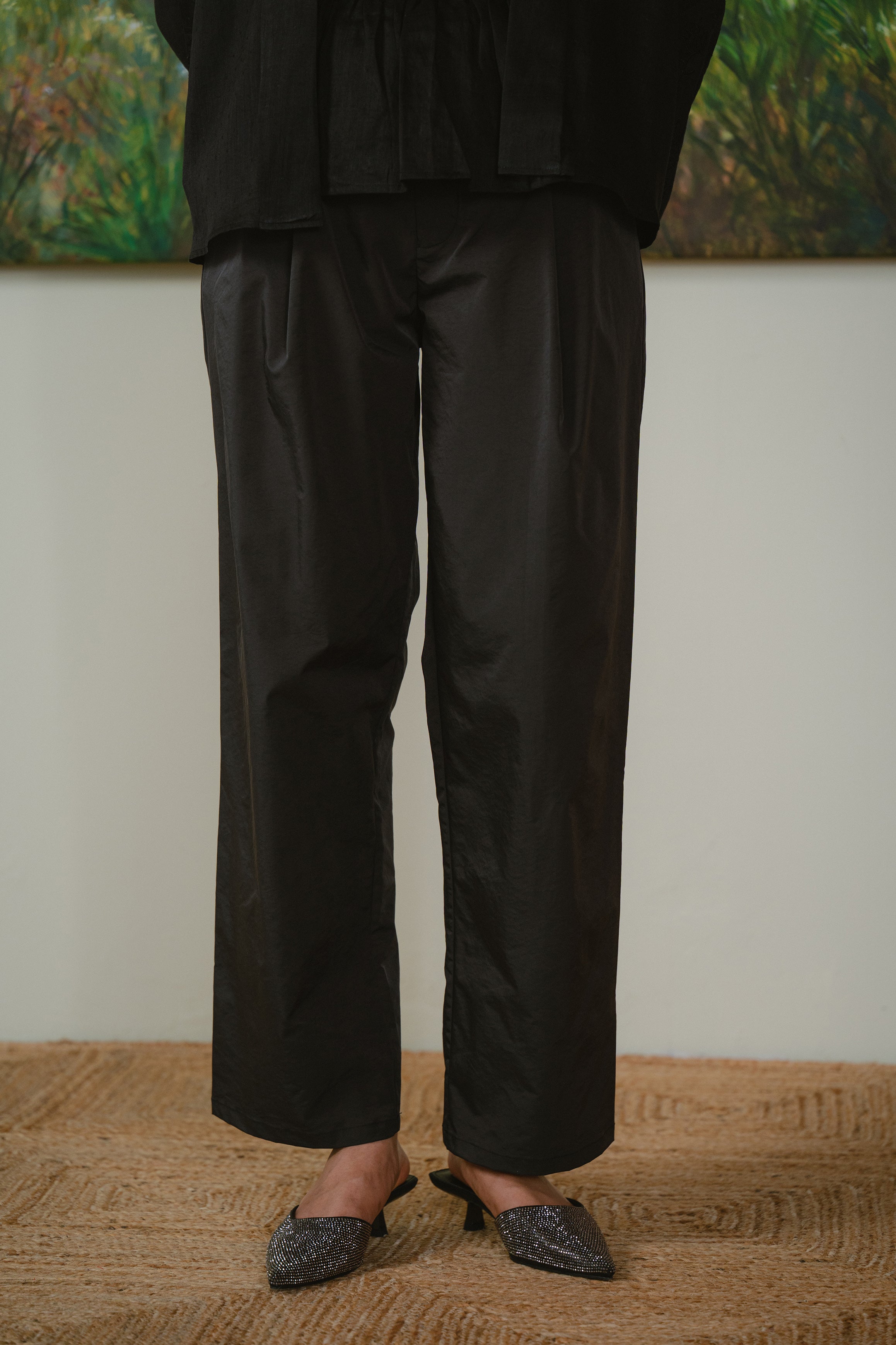 Tailored with a subtle sheen and shantung texture, with a gently tapered silhouette. Features front side pockets, back welt pocket, and an elasticised back waistband for a flexible fit.