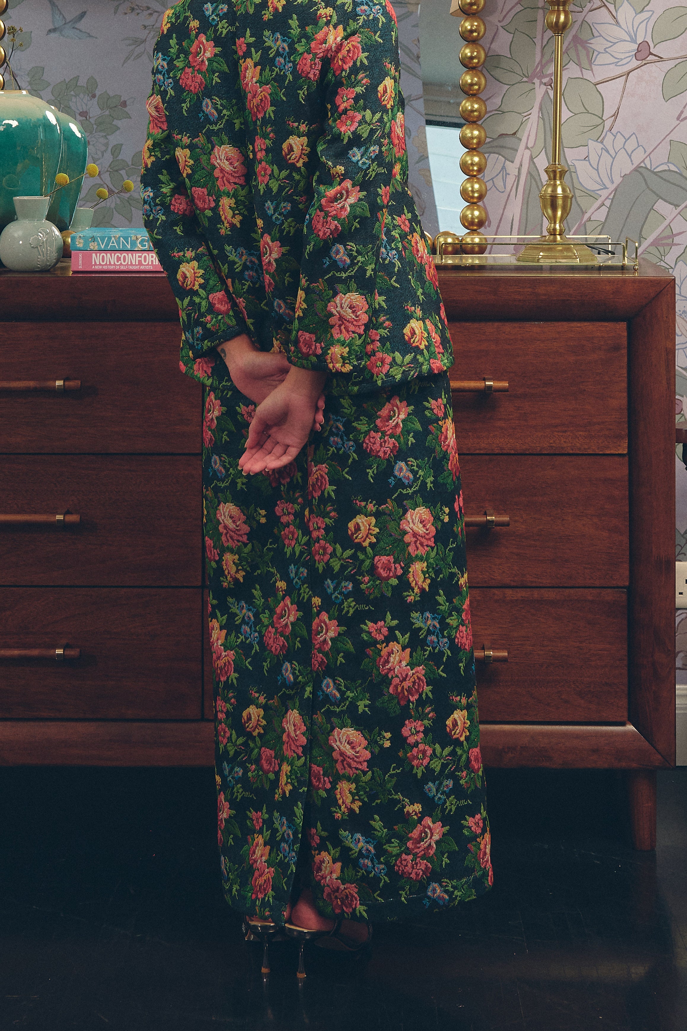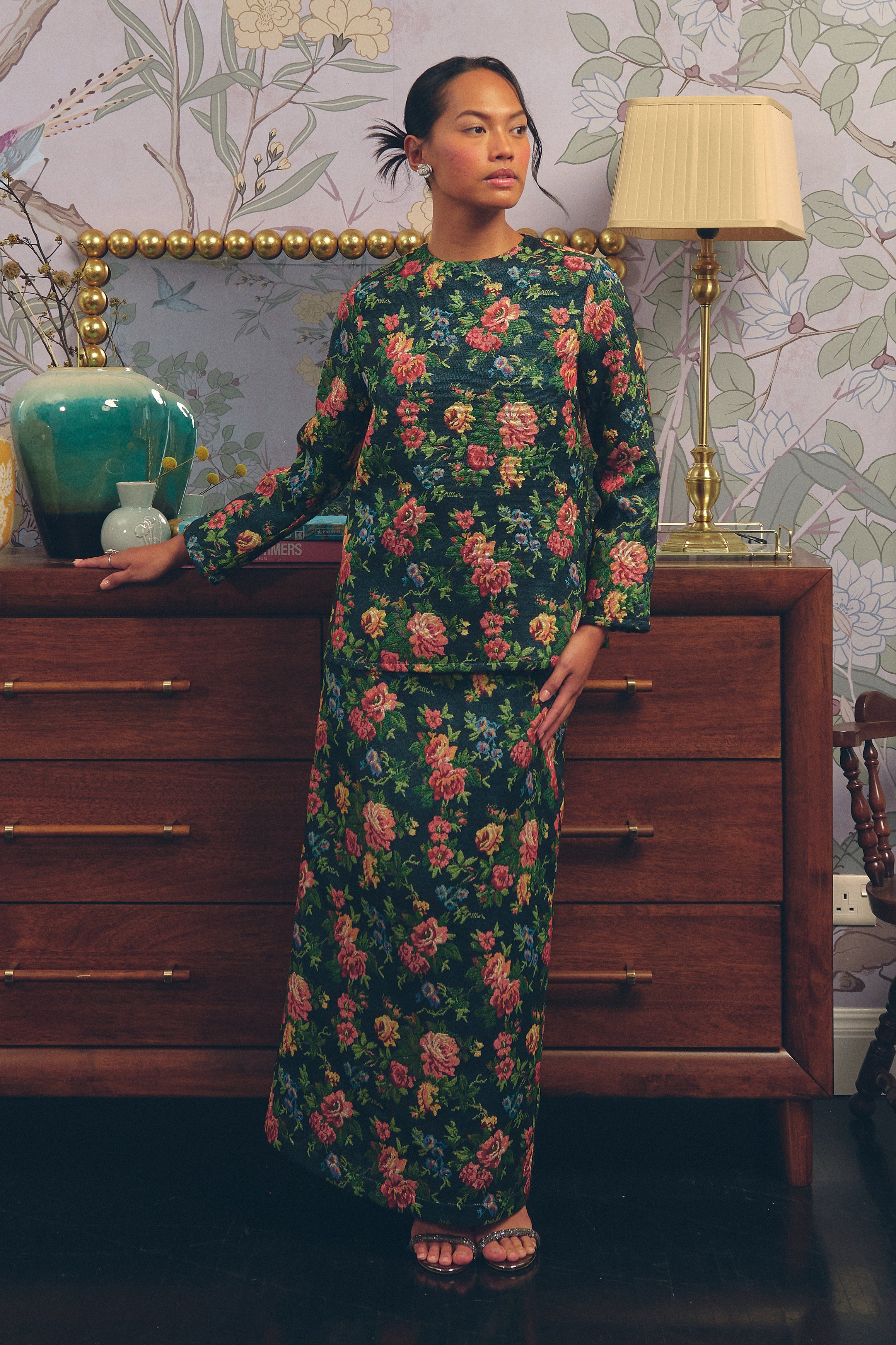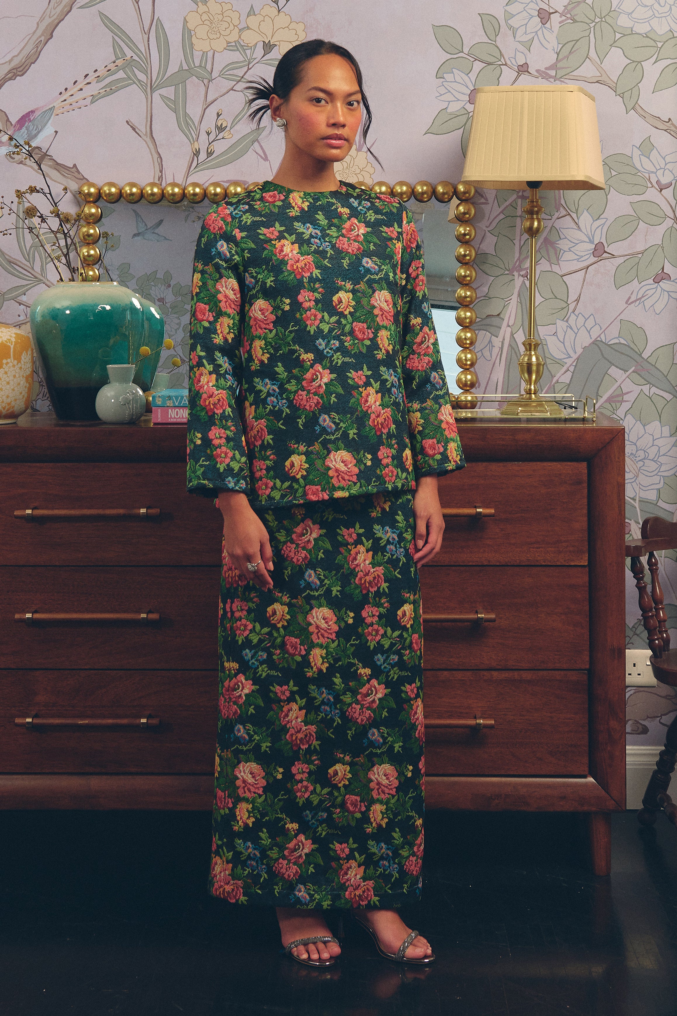 A Cotton Brocade pencil skirt. Designed with a back slit, a concealed back zip closure, and a half-elastic waistband for ease.