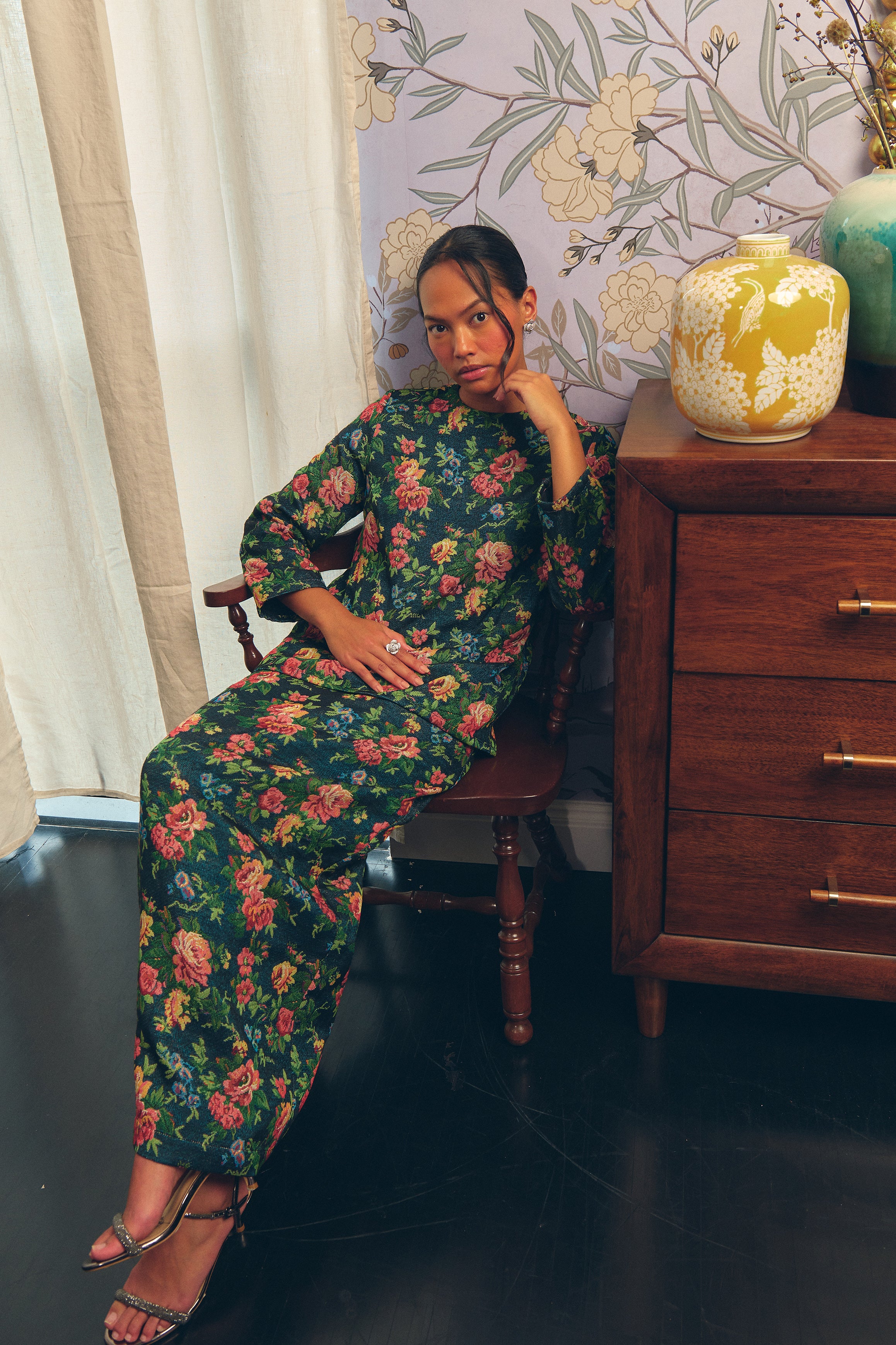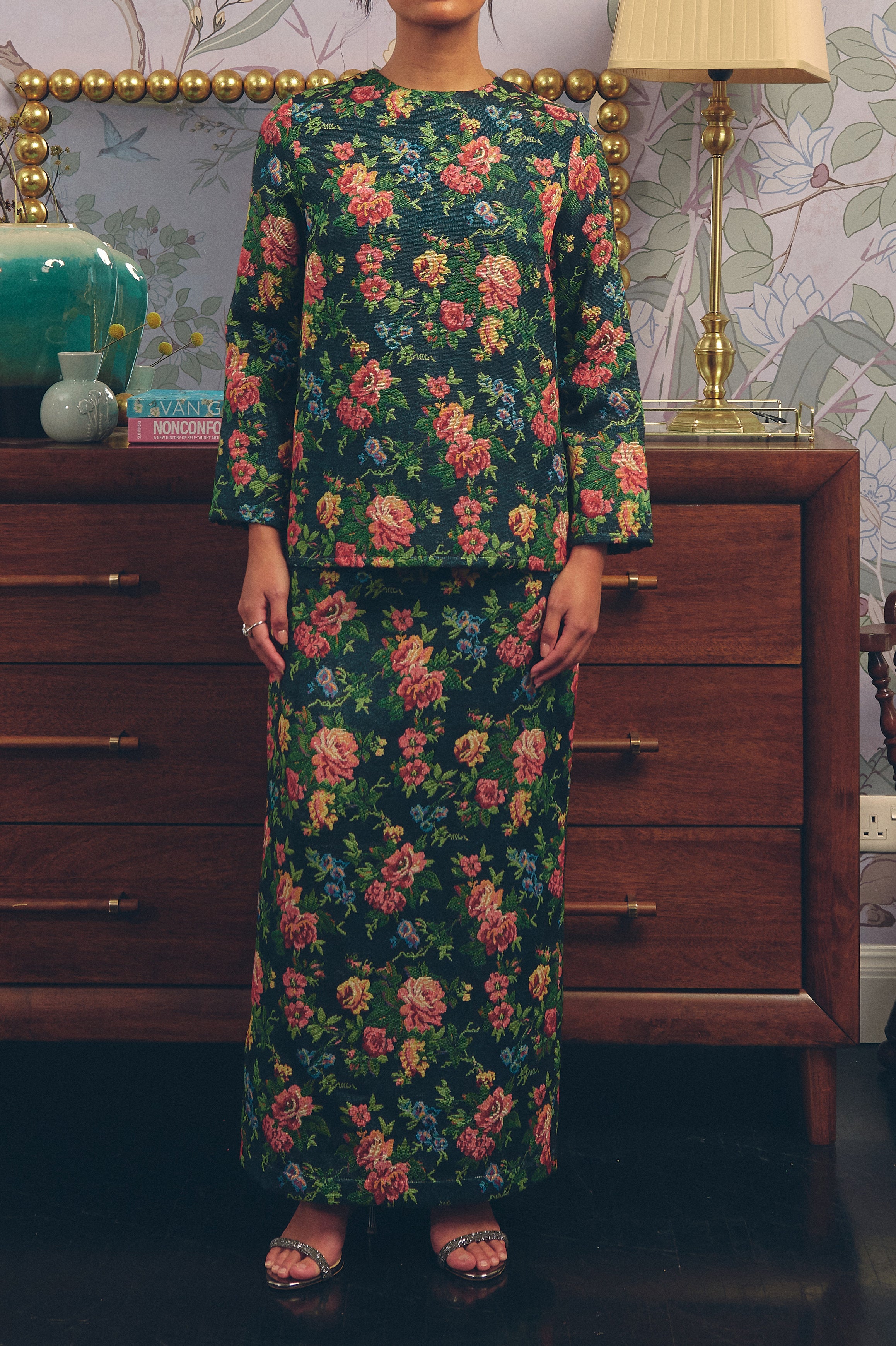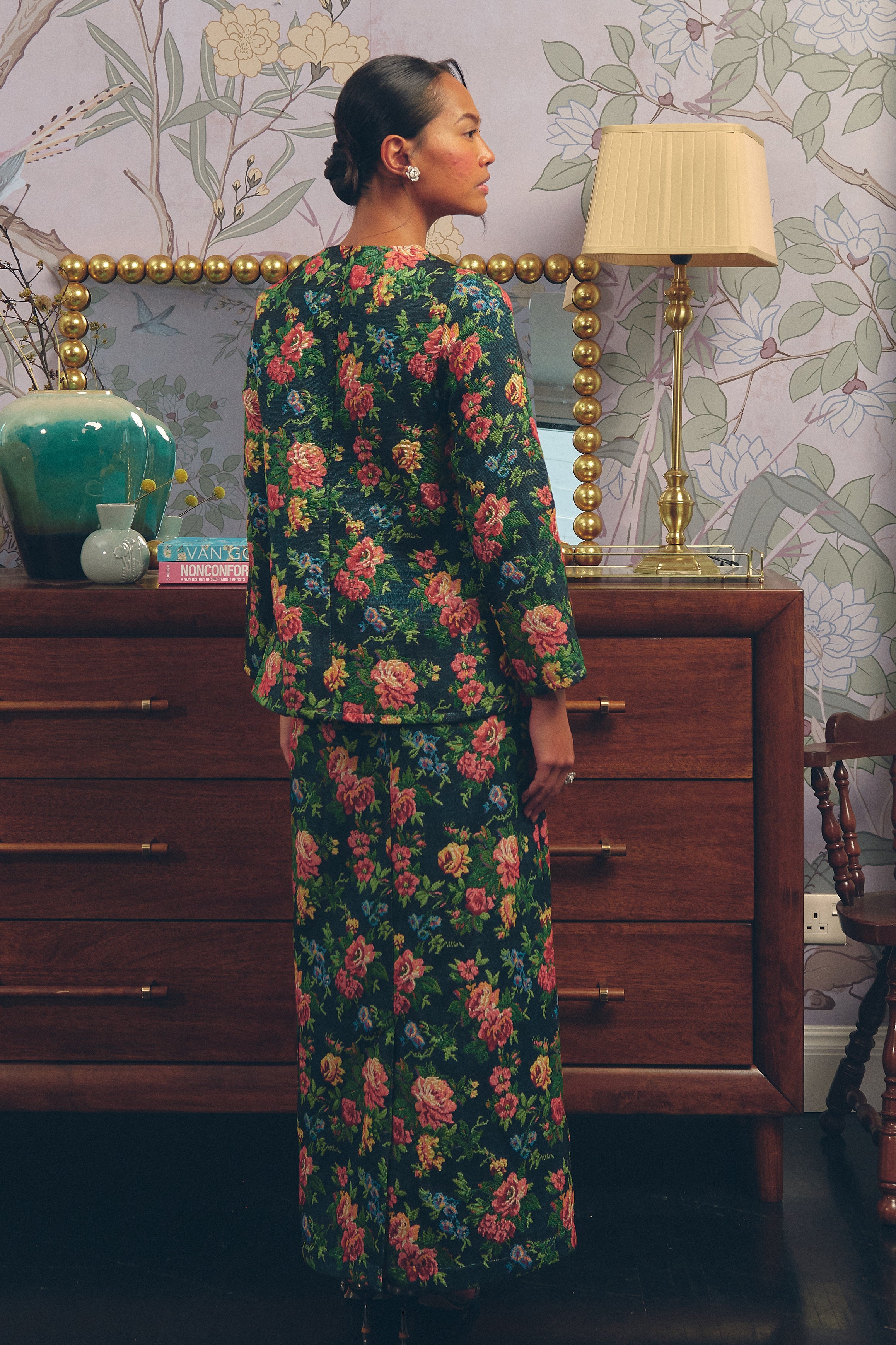 A Cotton Brocade pencil skirt. Designed with a back slit, a concealed back zip closure, and a half-elastic waistband for ease.