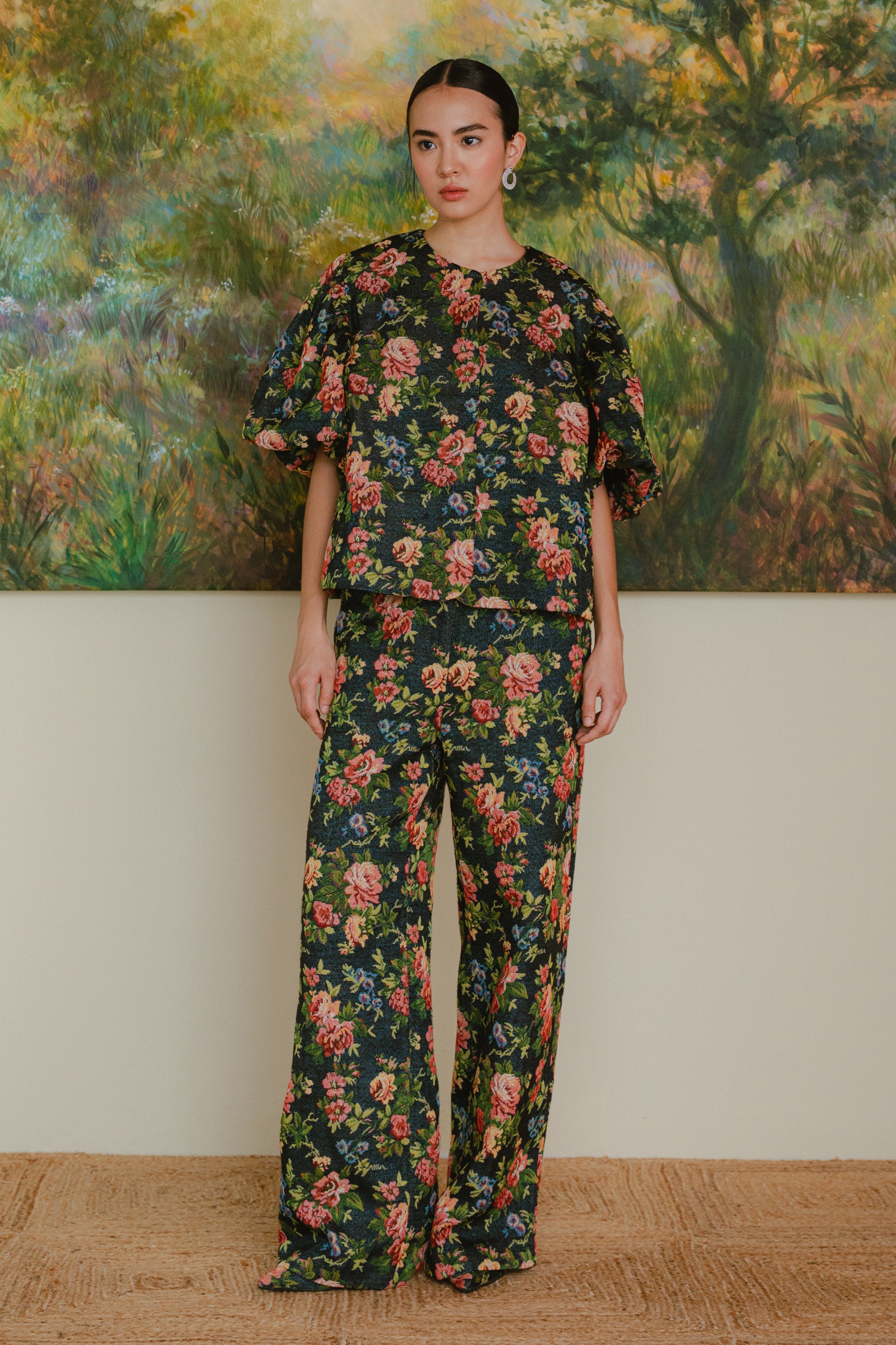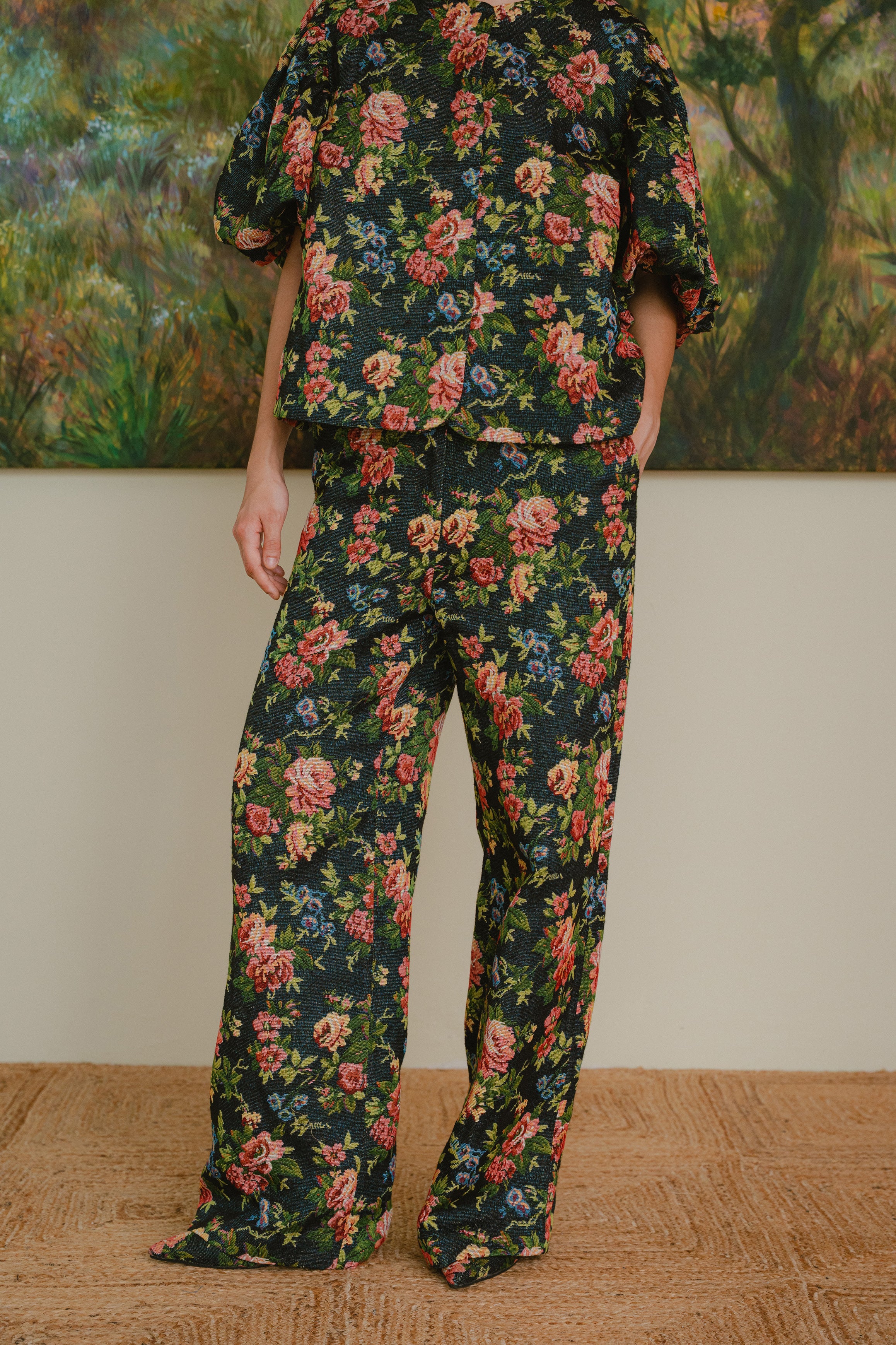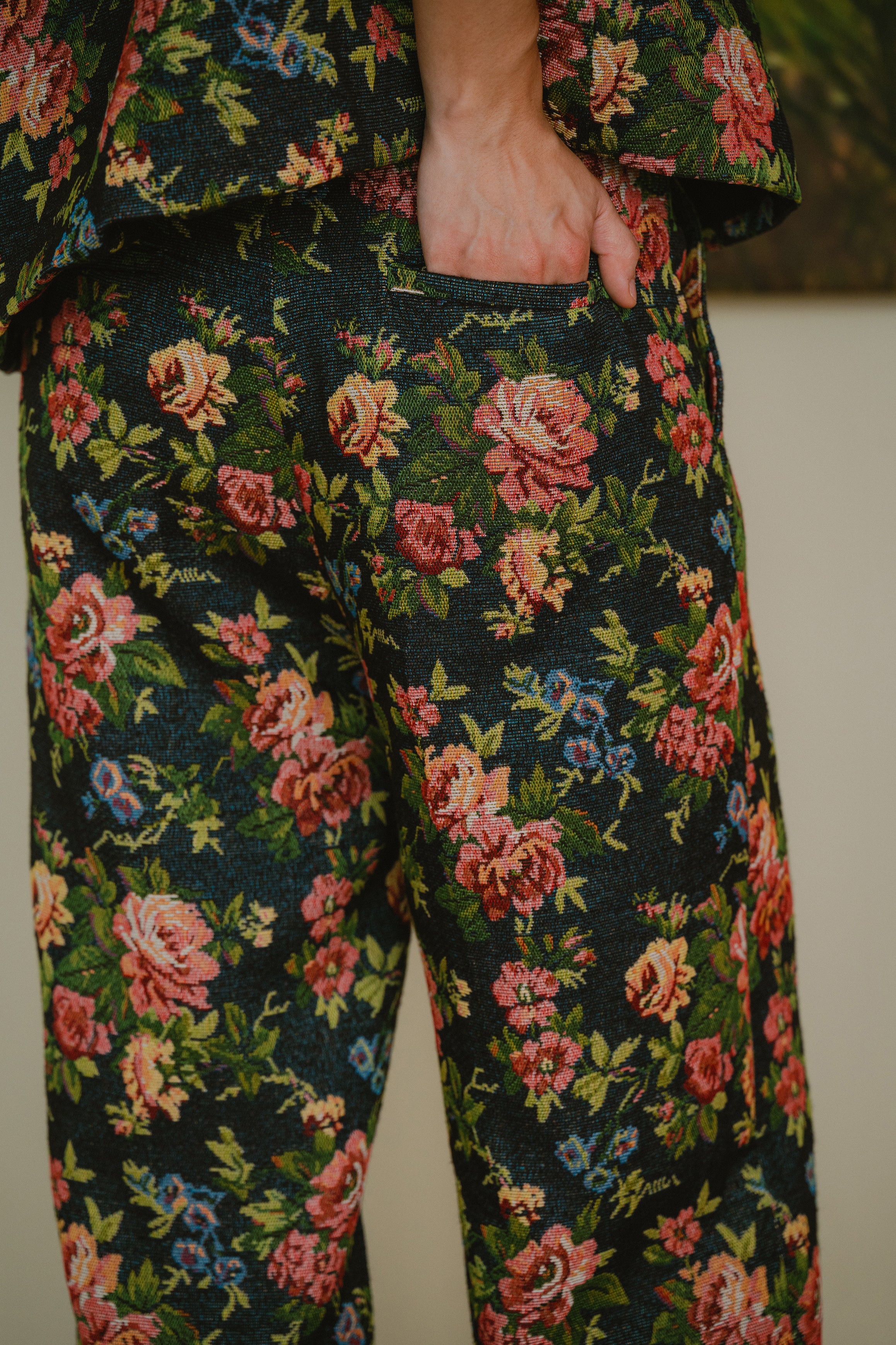 High-waisted trousers, rendered in Cotton Brocade. Features front pleats and a back welt pocket. A relaxed fit.
