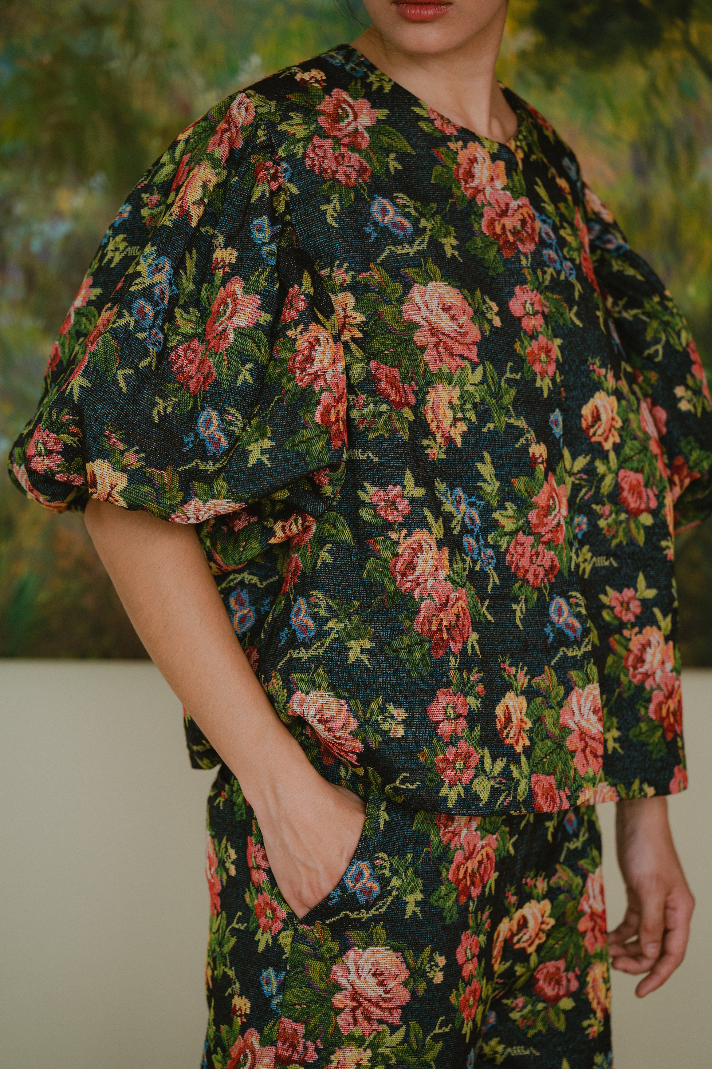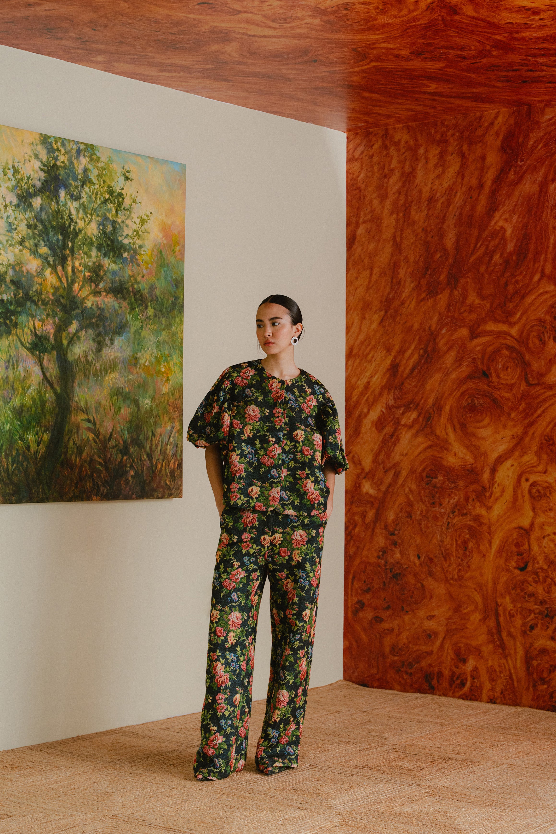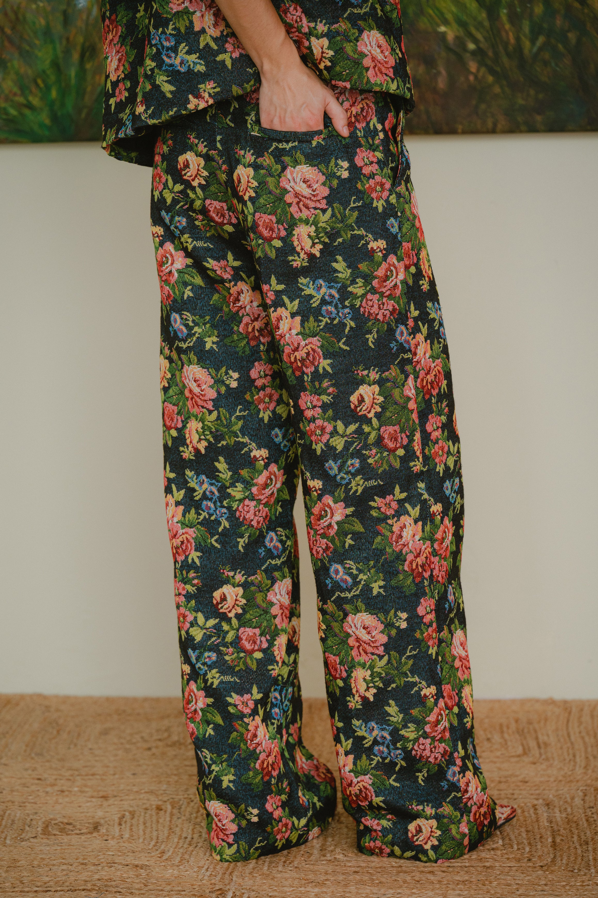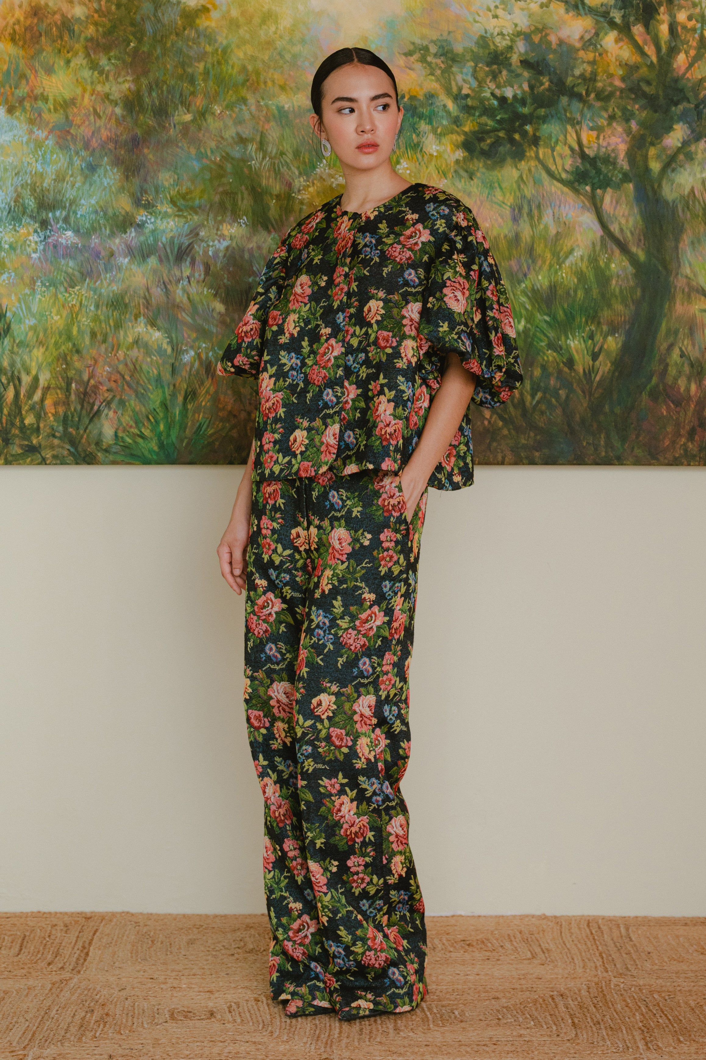 High-waisted trousers, rendered in Cotton Brocade. Features front pleats and a back welt pocket. A relaxed fit.