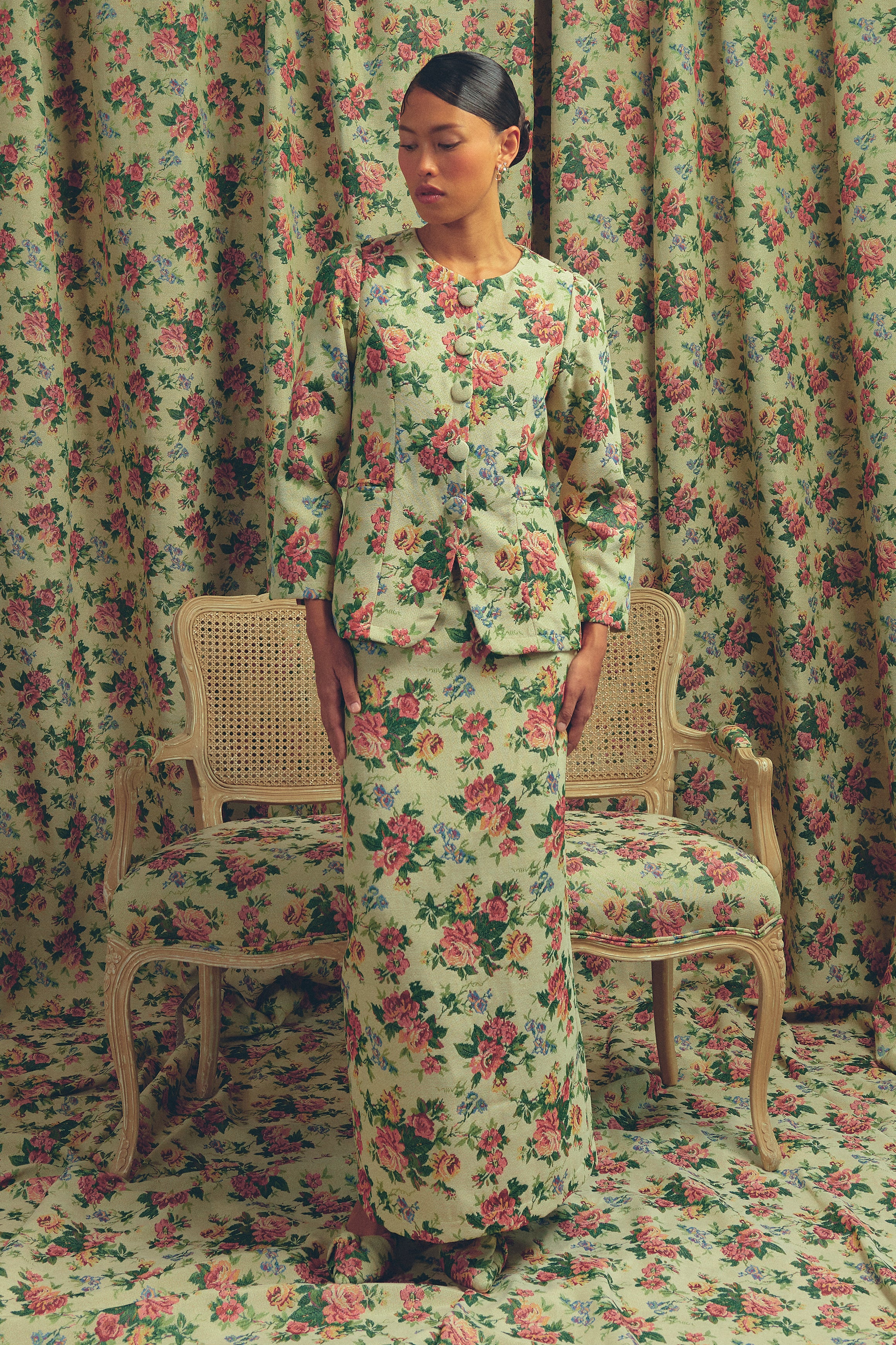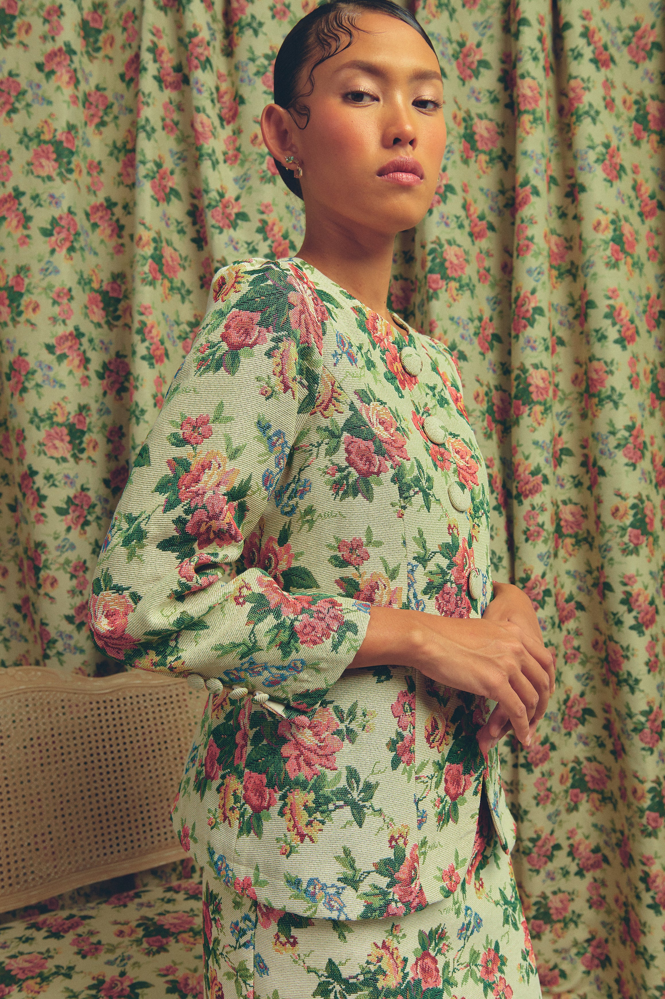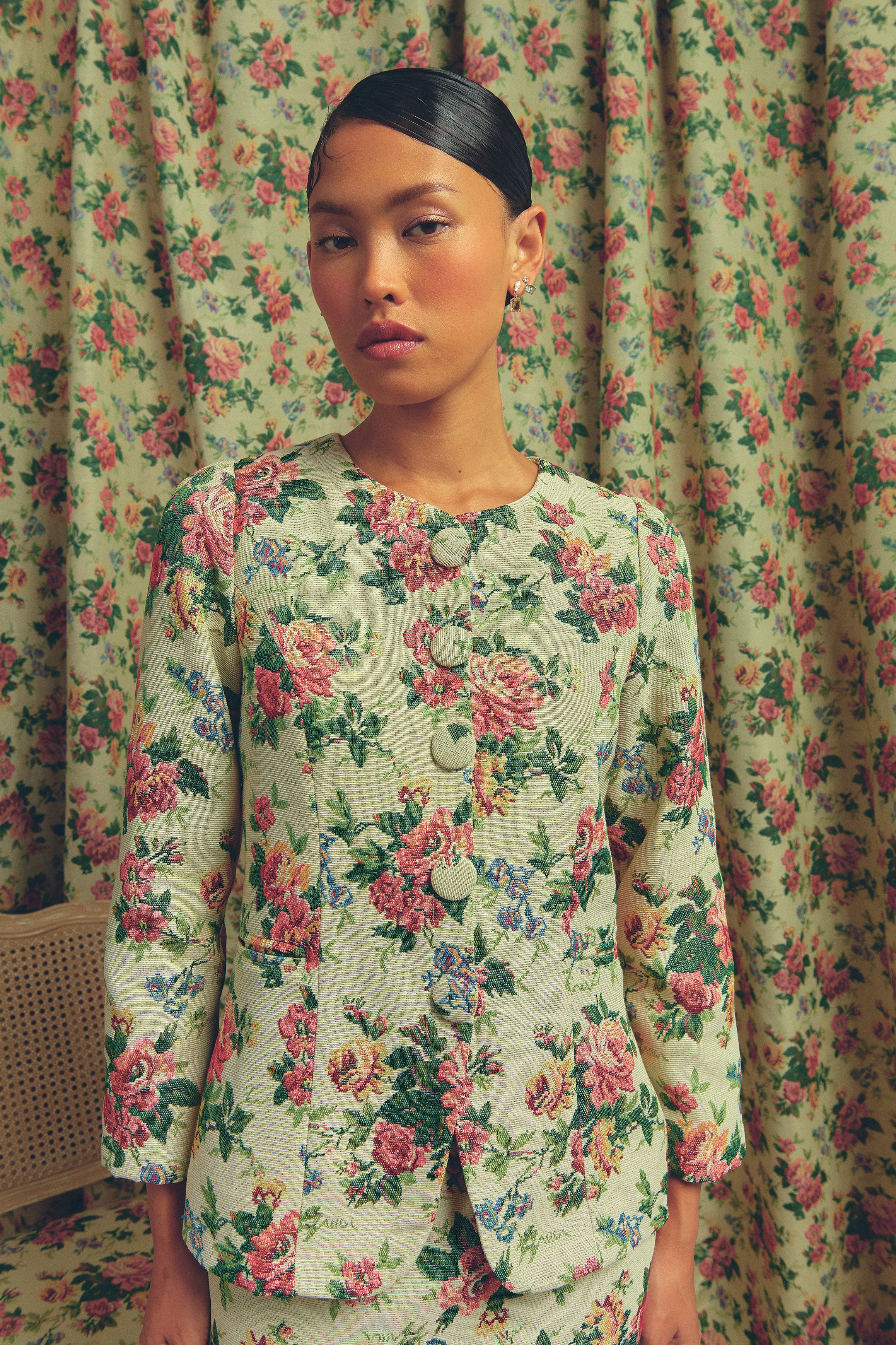 A contemporary take on a classic waistcoat. A tulip-cut button-down that creates a defined silhouette. Rendered in Cotton Brocade.