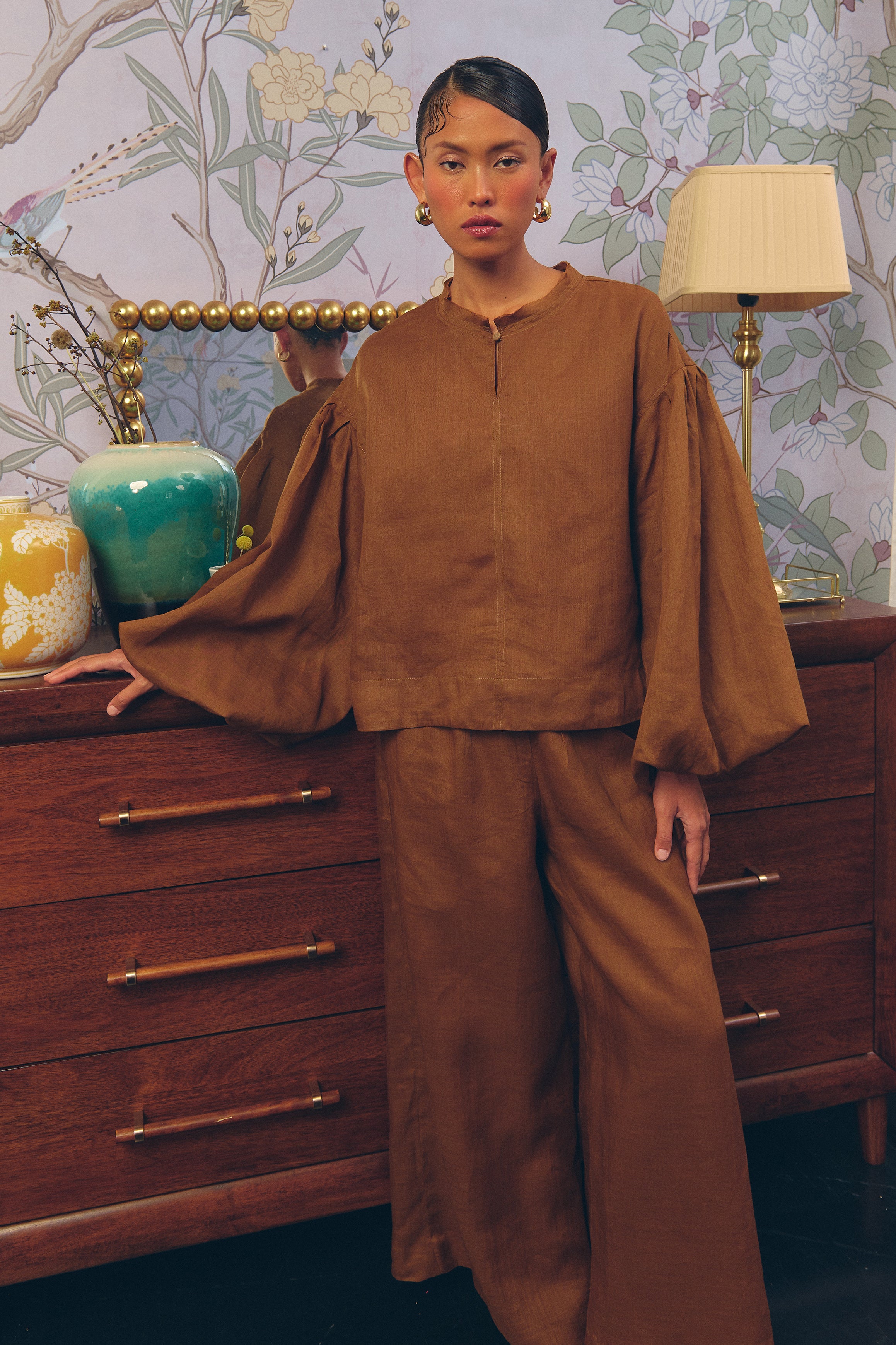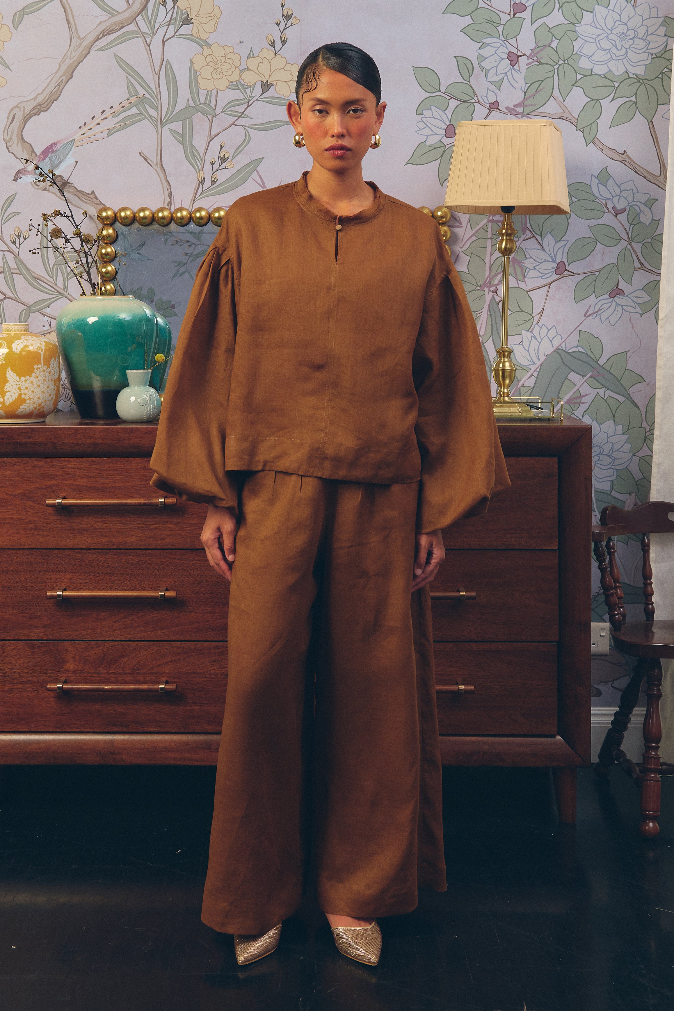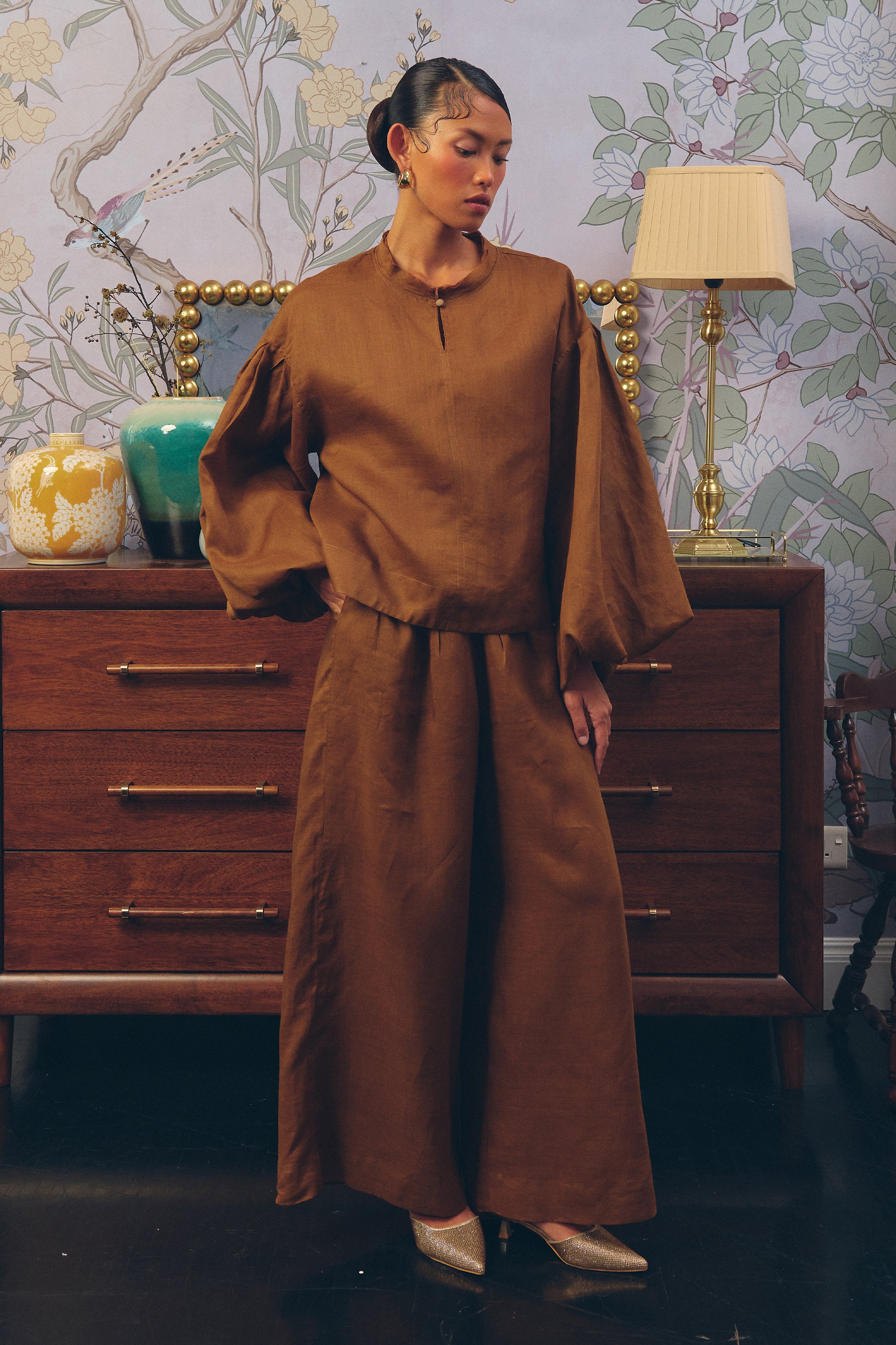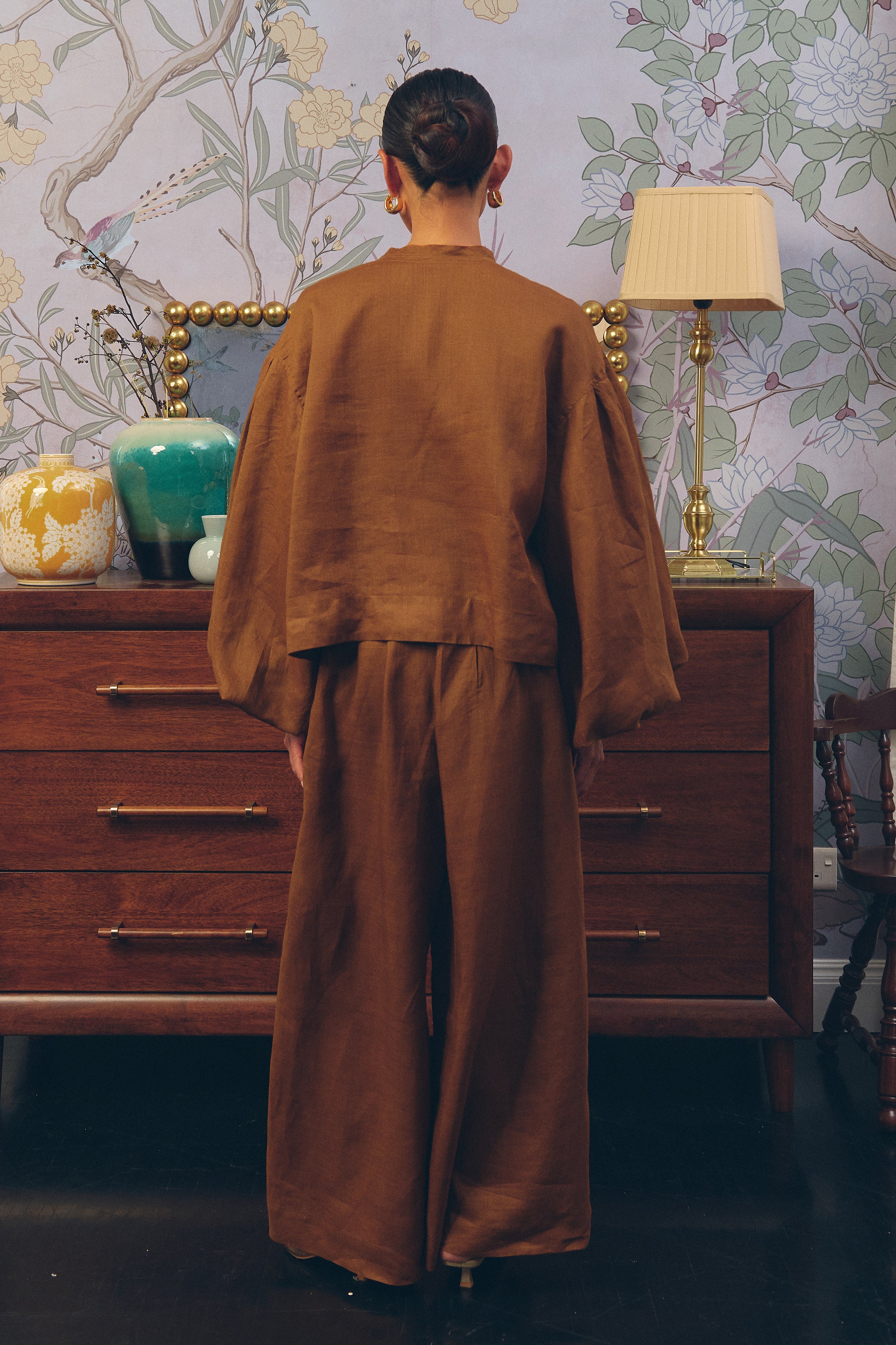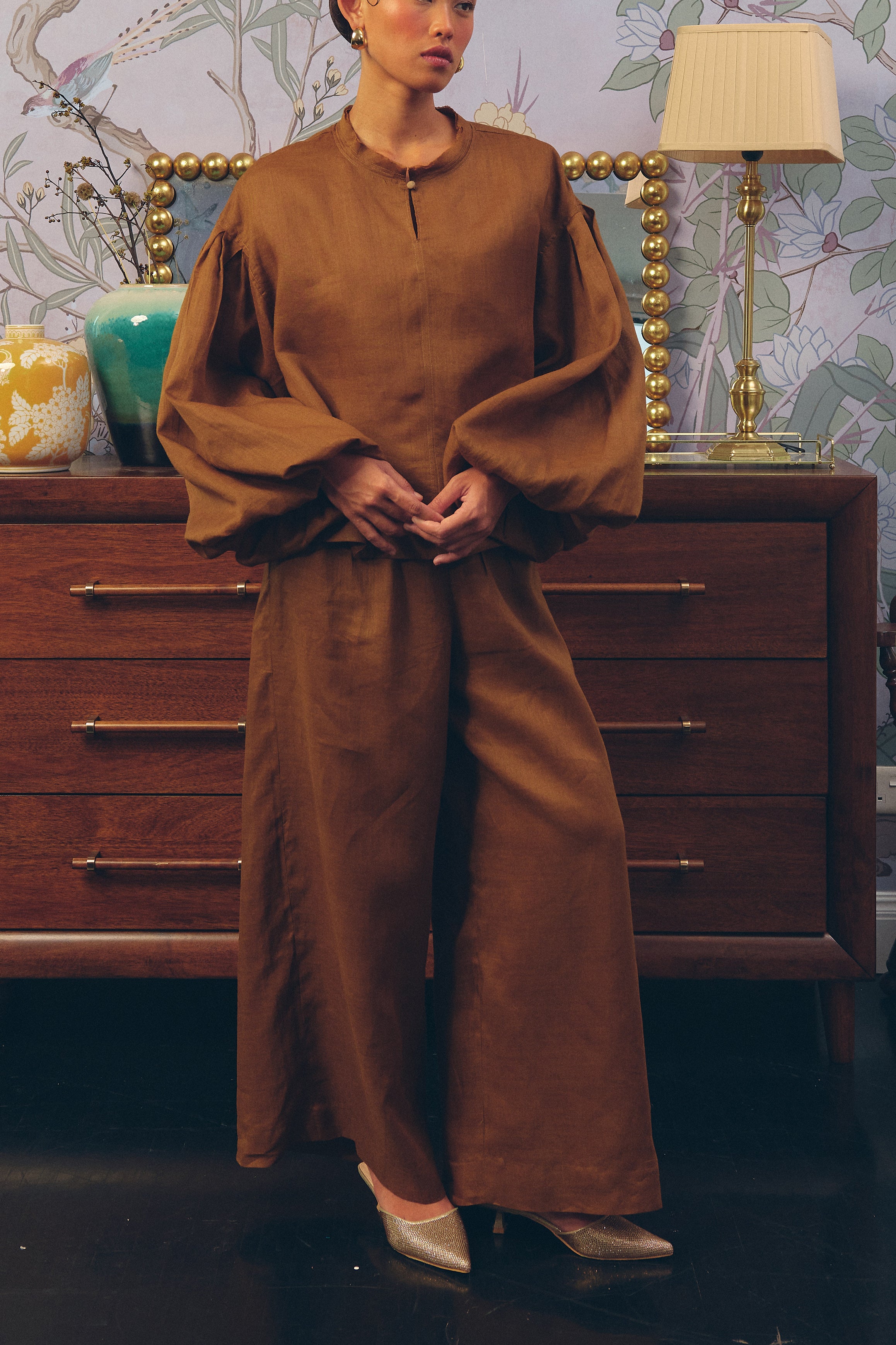Flared high-waisted trousers, rendered in Ramie. Fully lined in cotton. Finished with side pockets, and a side zip closure.