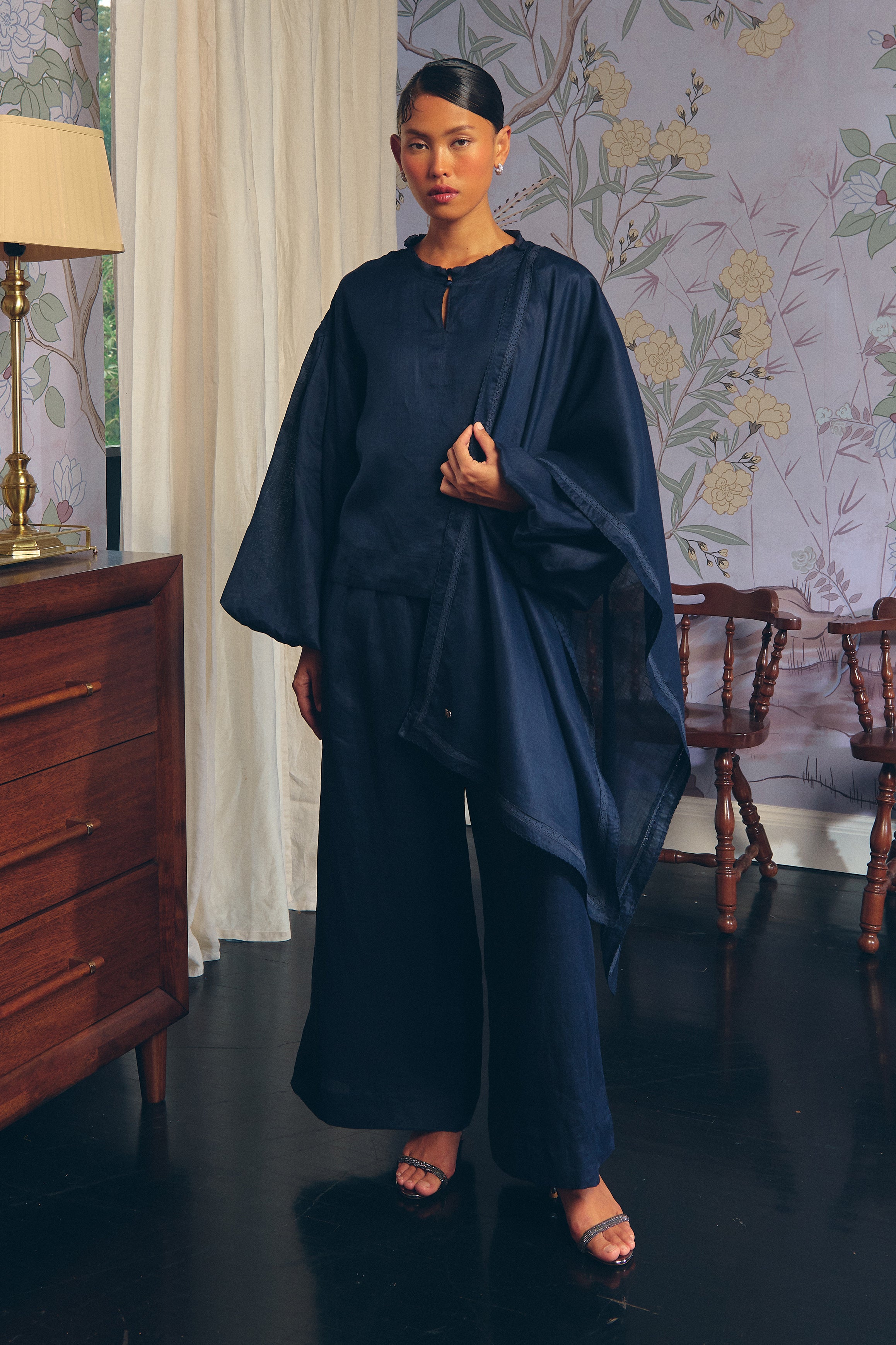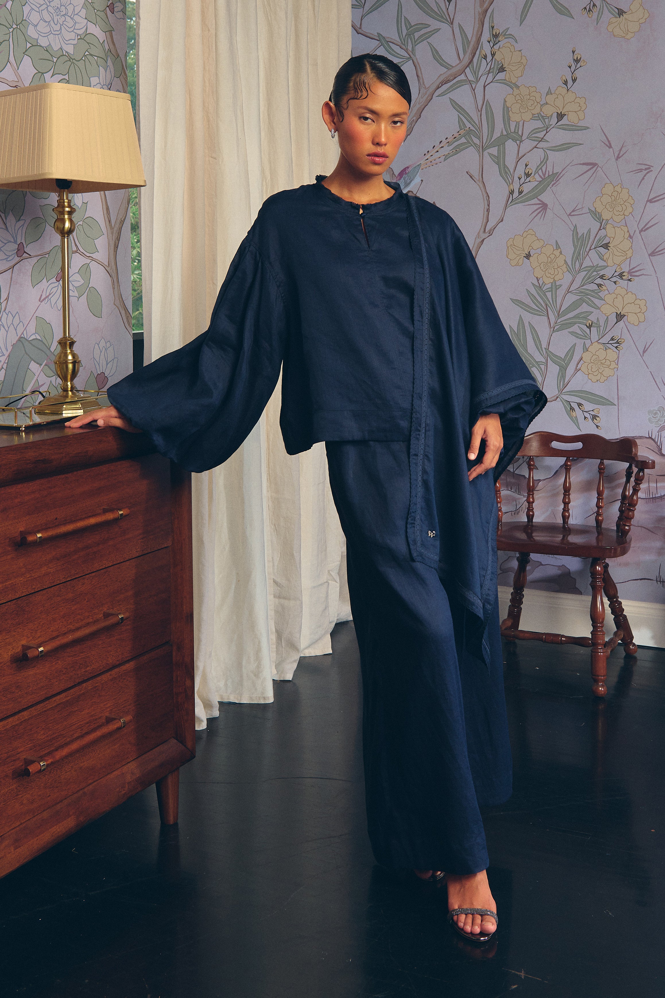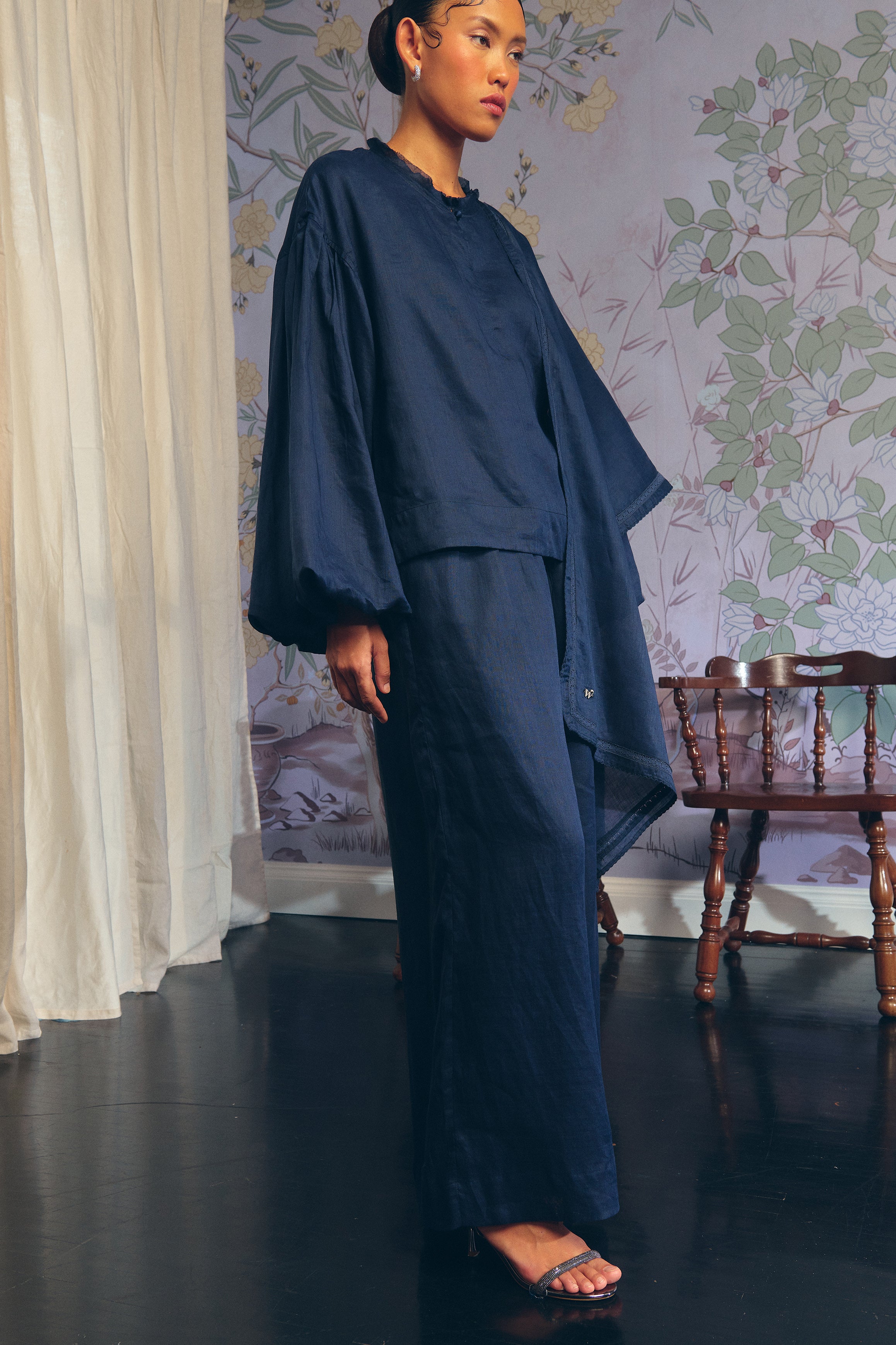 Flared high-waisted trousers, rendered in Ramie. Fully lined in cotton. Finished with side pockets, and a side zip closure.