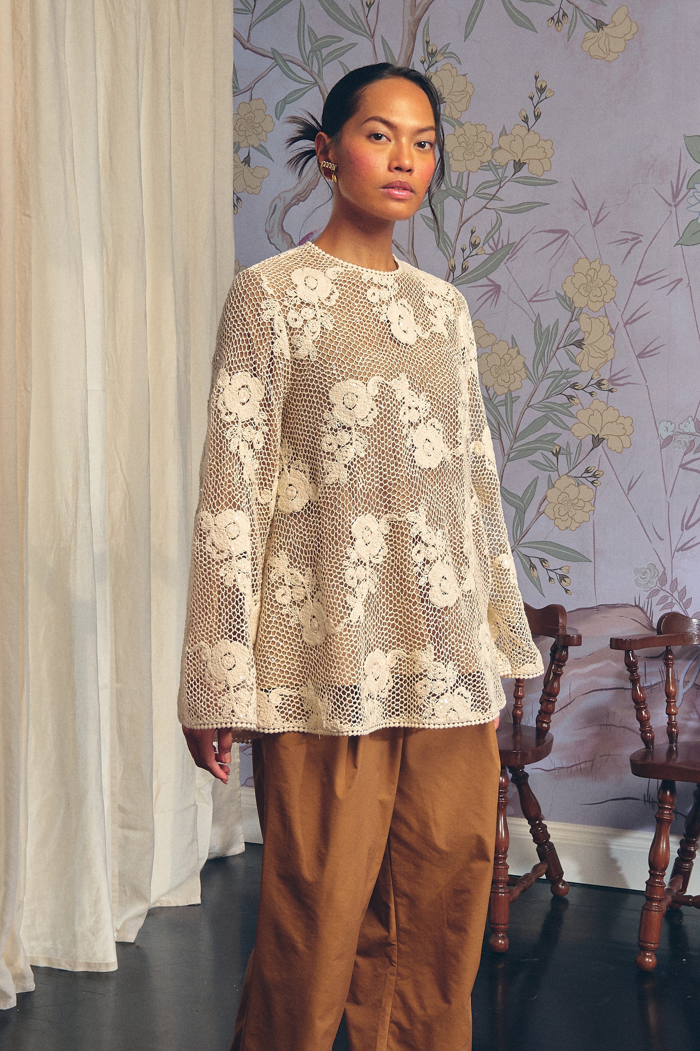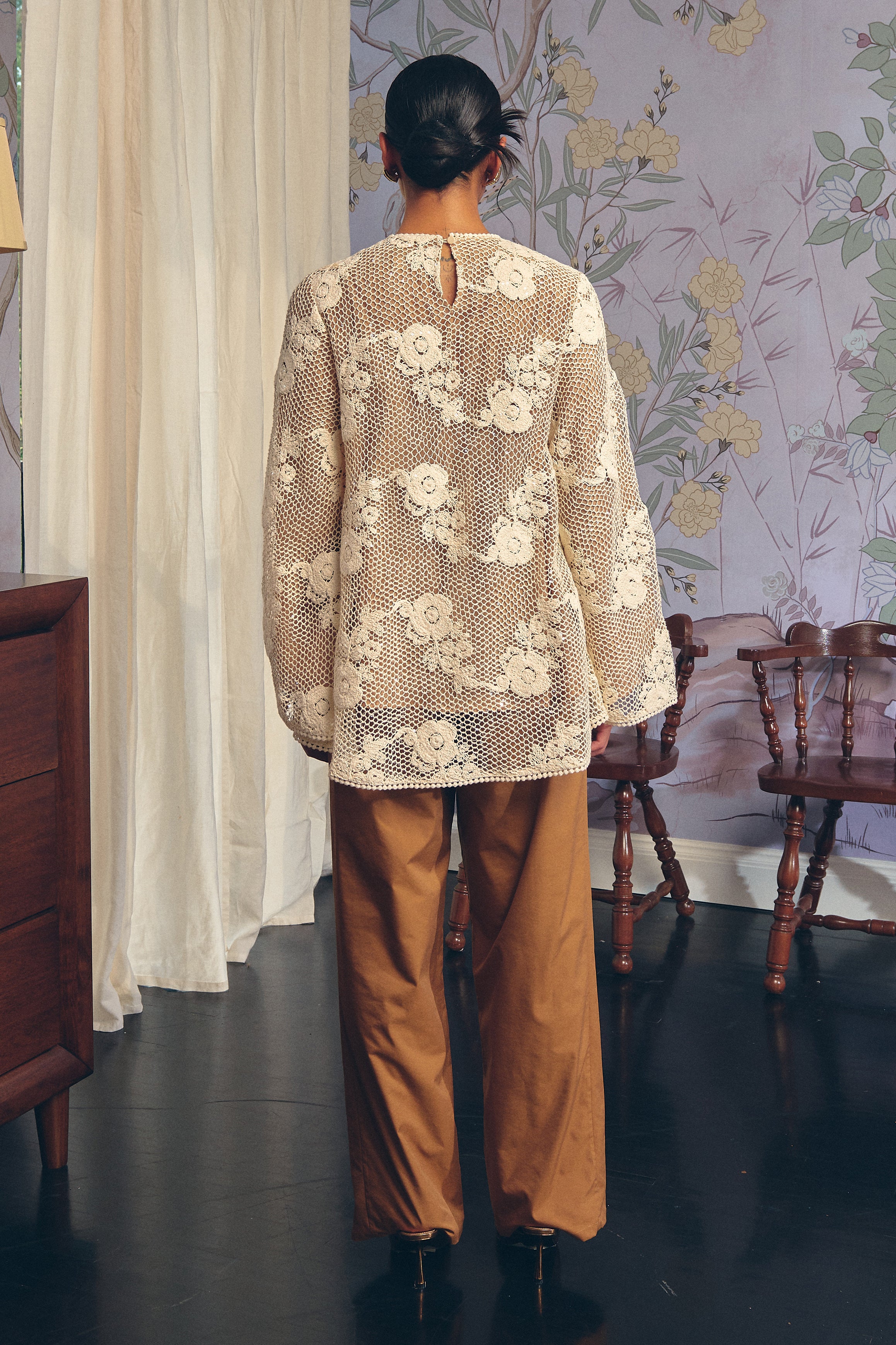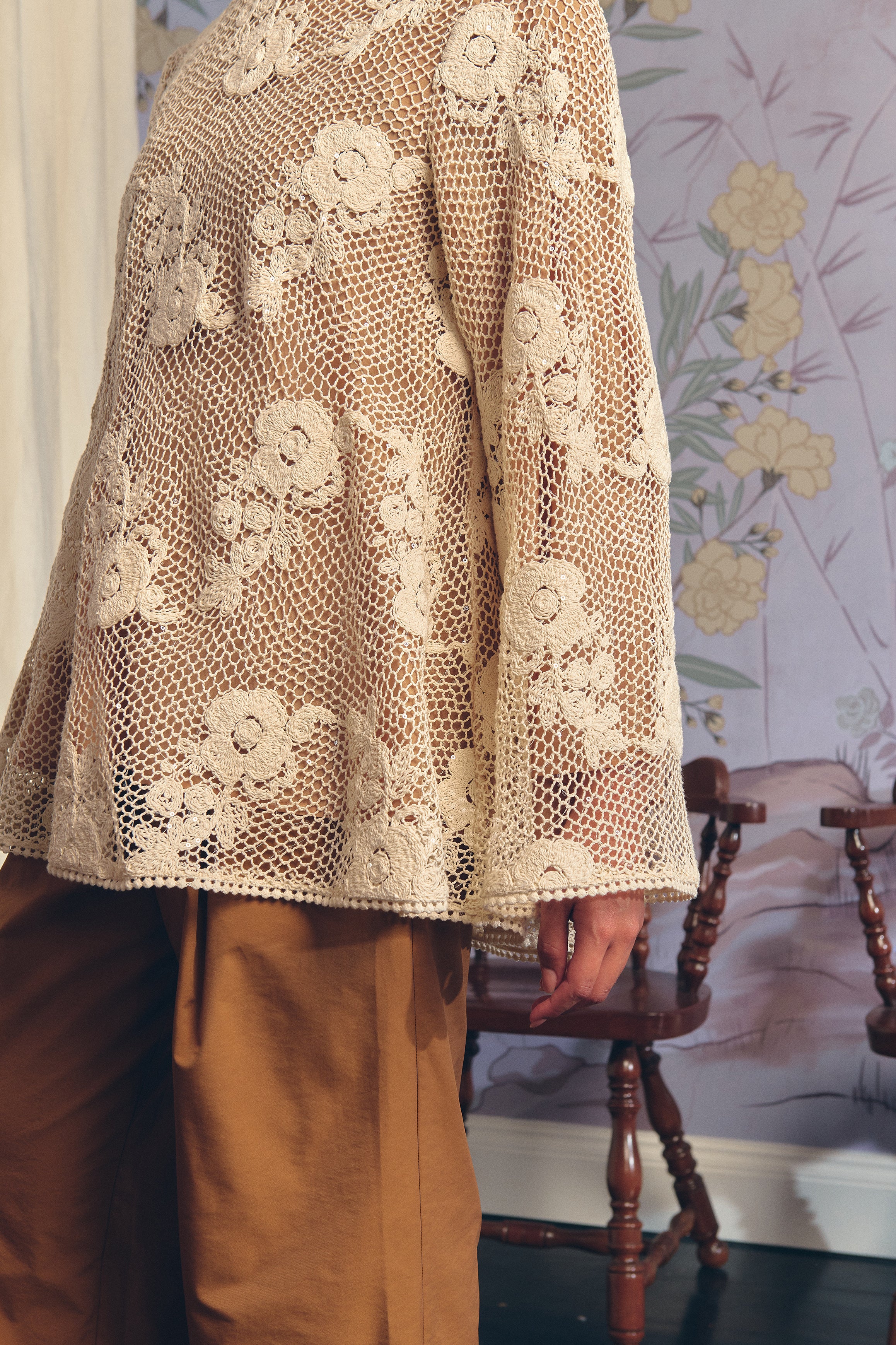 An A-line fit, crafted from intricate crochet lace layered over a ramie base. Features delicate sequin embellishments with floral motifs. Finished with full sleeves.