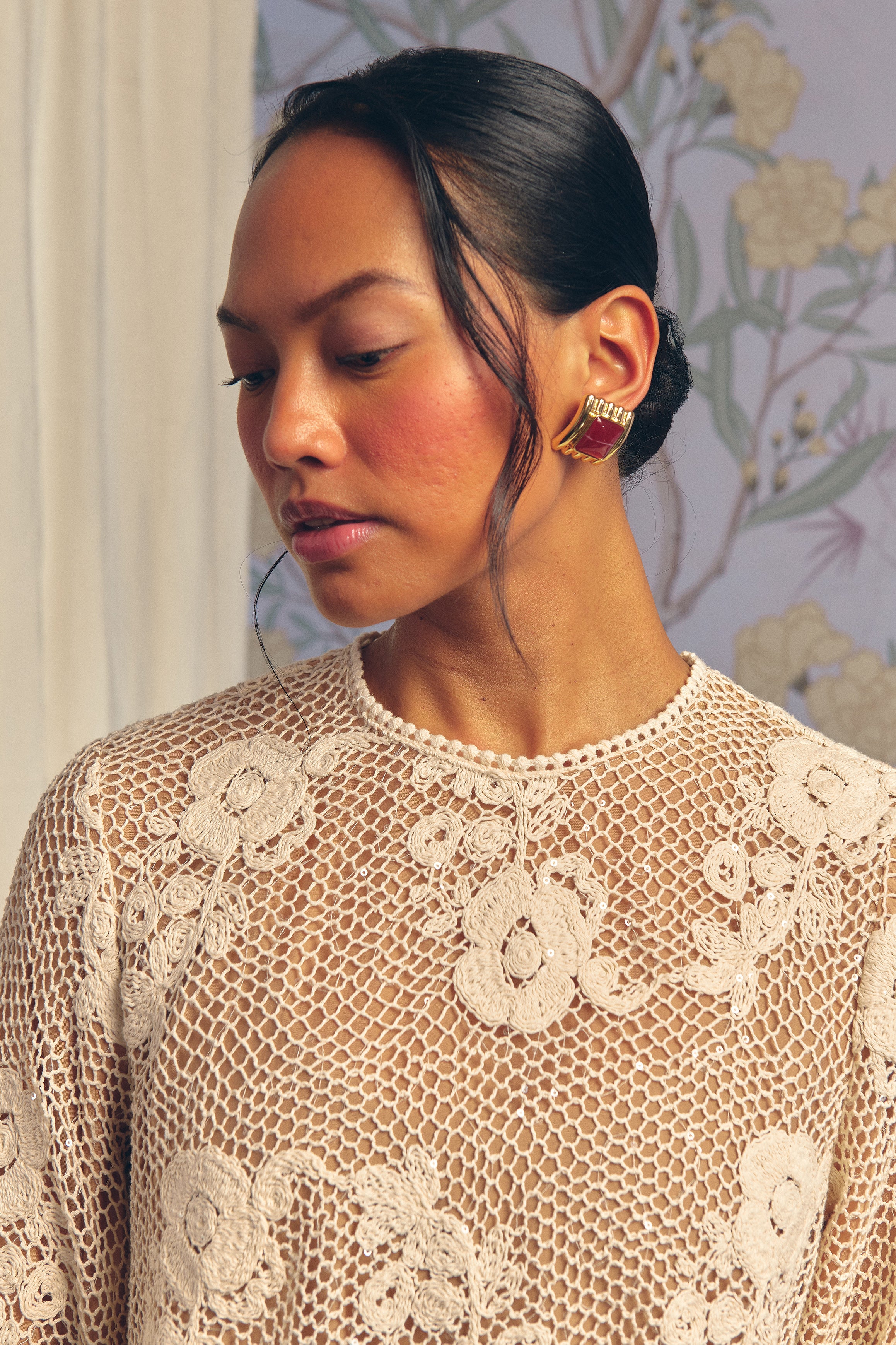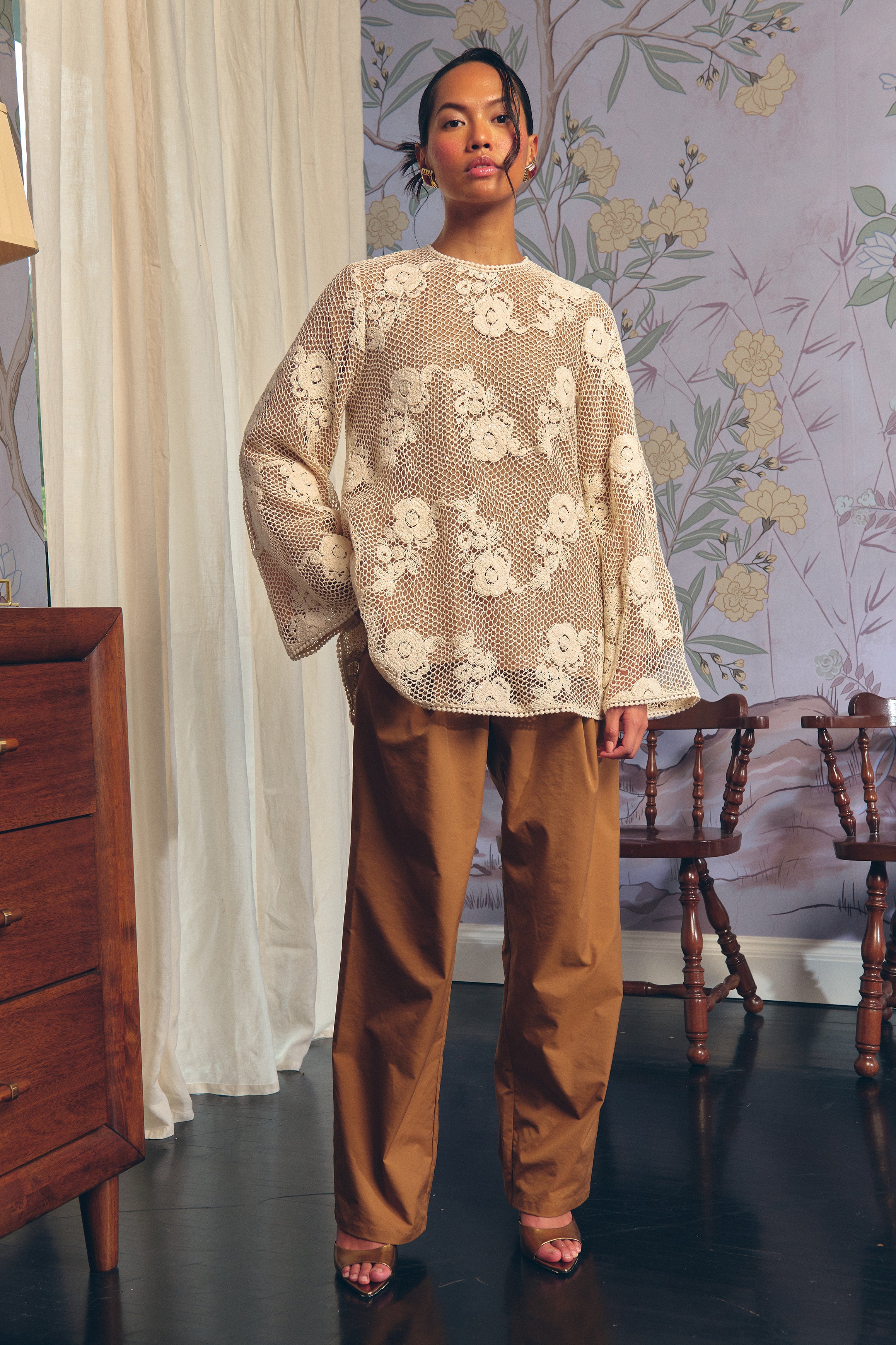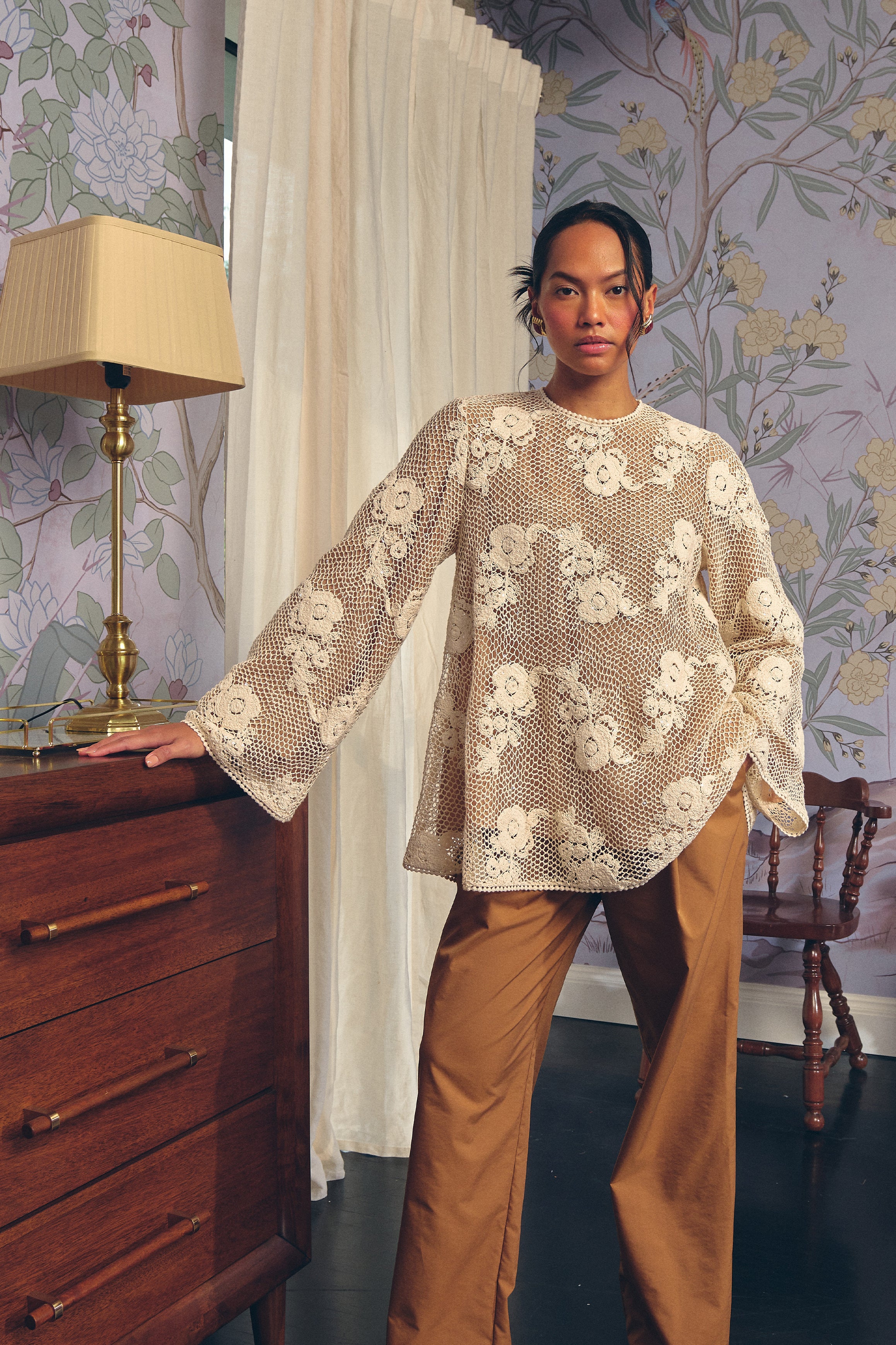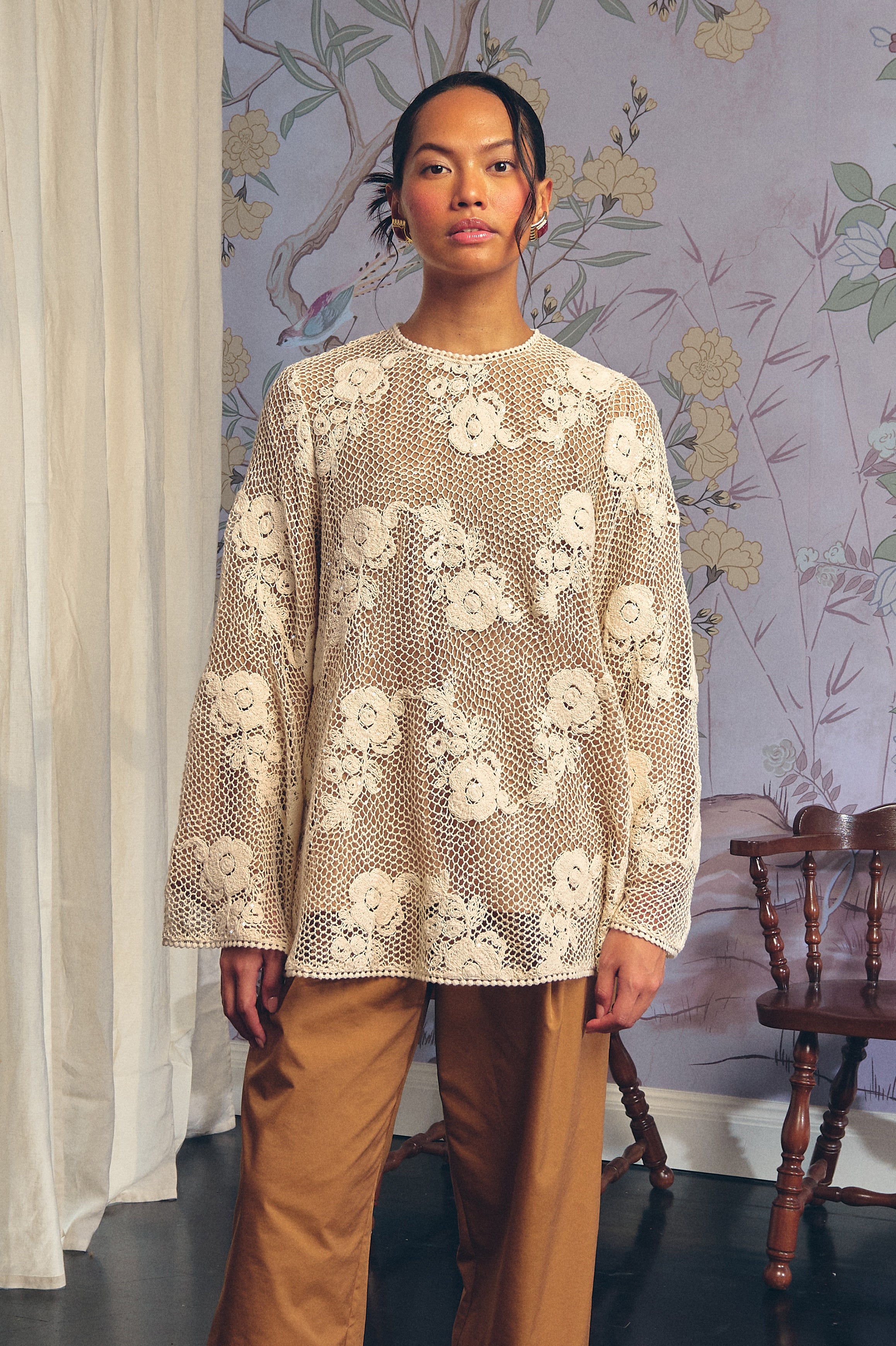 An A-line fit, crafted from intricate crochet lace layered over a ramie base. Features delicate sequin embellishments with floral motifs. Finished with full sleeves.