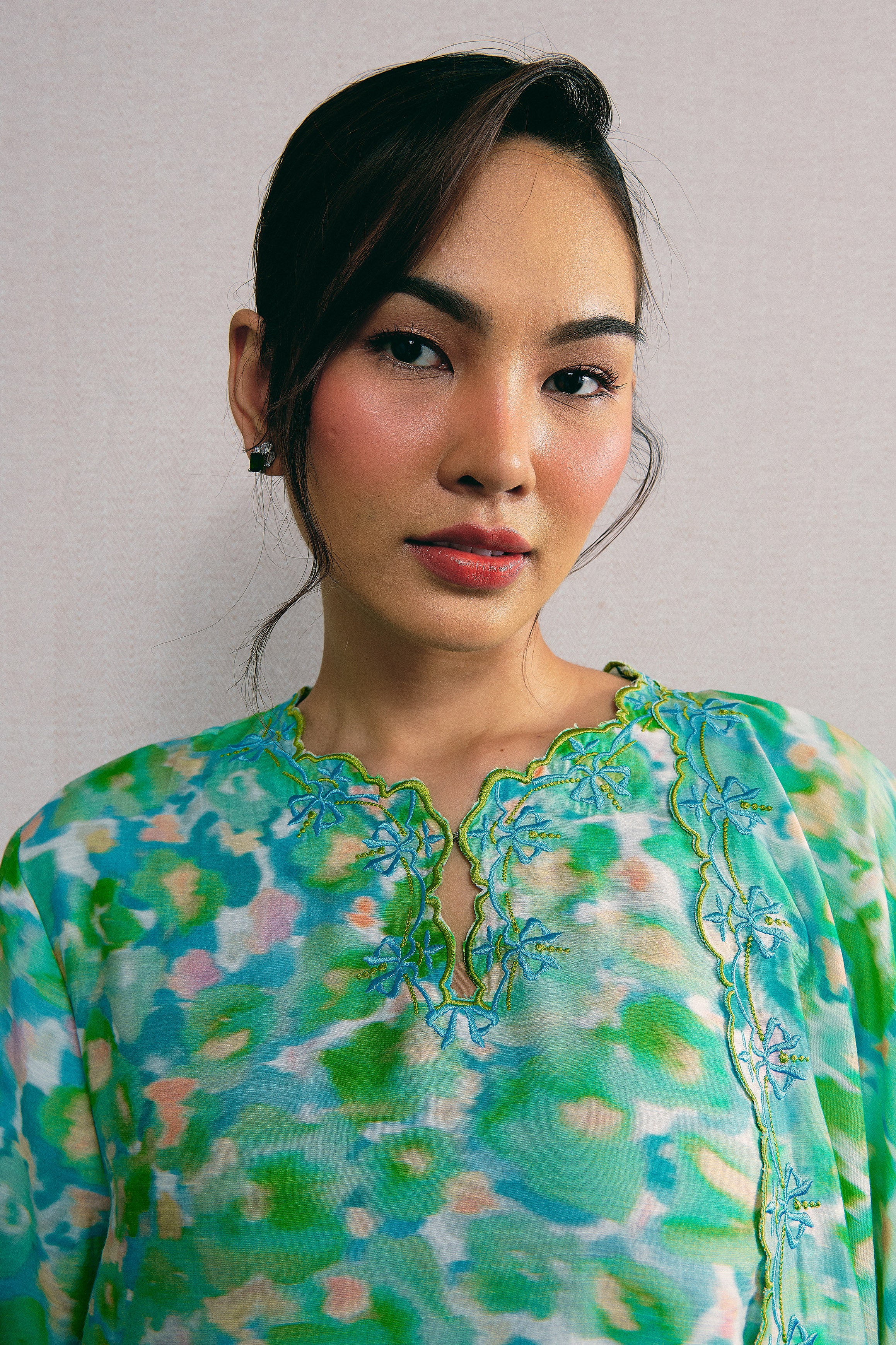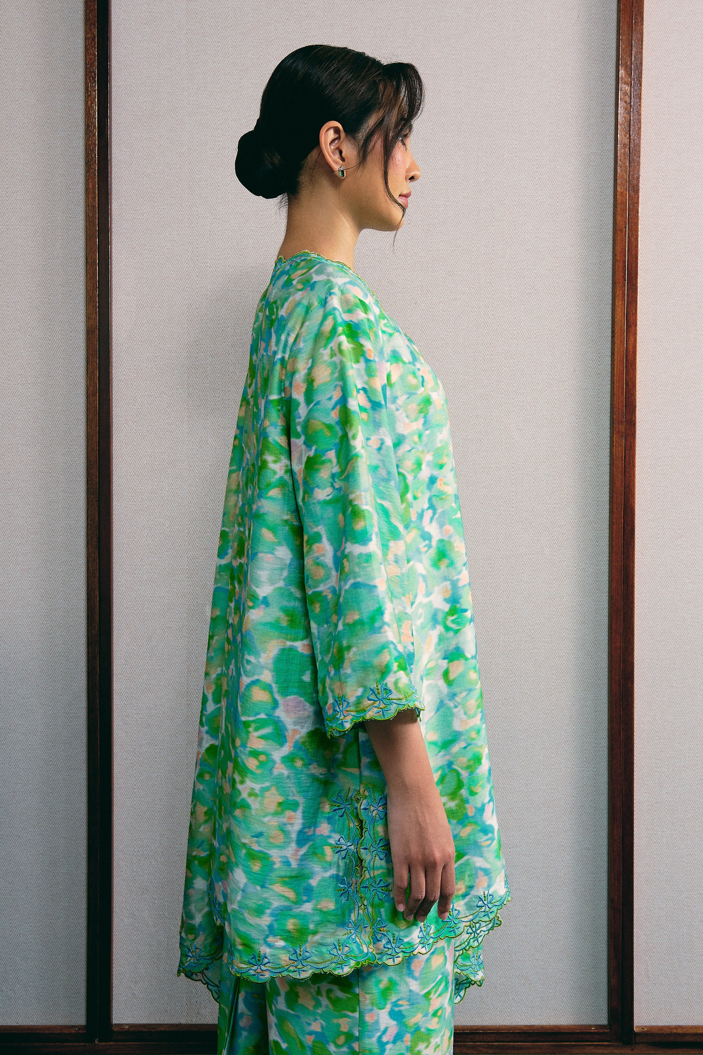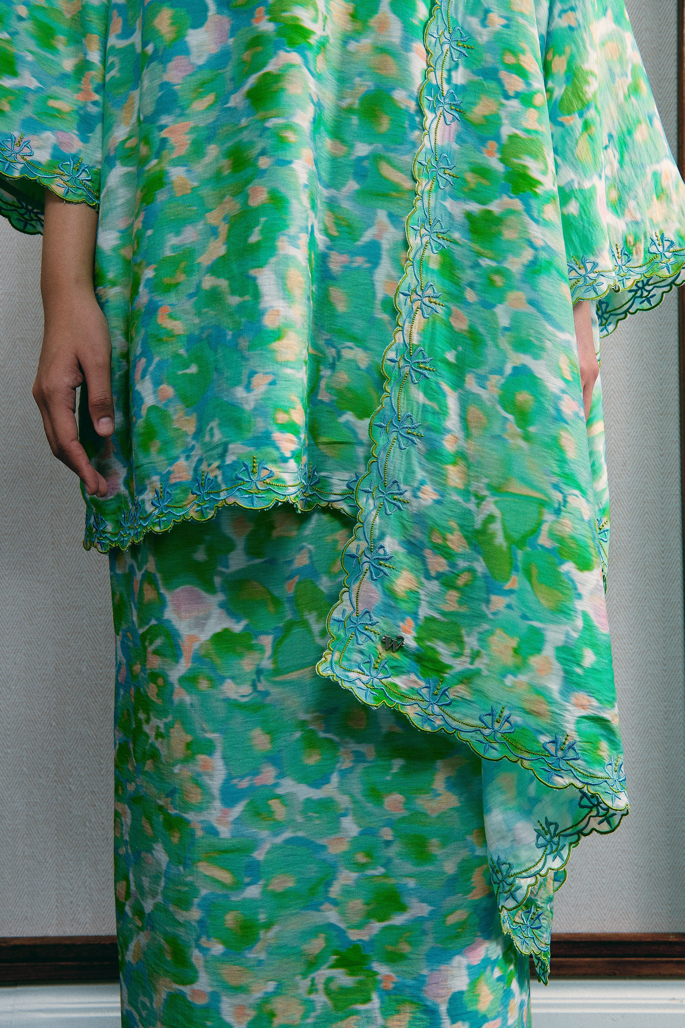 A long kurung top with drop shoulders, a front hook-and-eye closure, and intricate multicolour embroidery along the neckline, sleeves, and hem. Paired with a pencil skirt featuring embroidery at the hem, an elastic waistband, and an inverted back pleat. Fully lined in Tencel, with side pockets on the top and a back zip closure on the skirt.