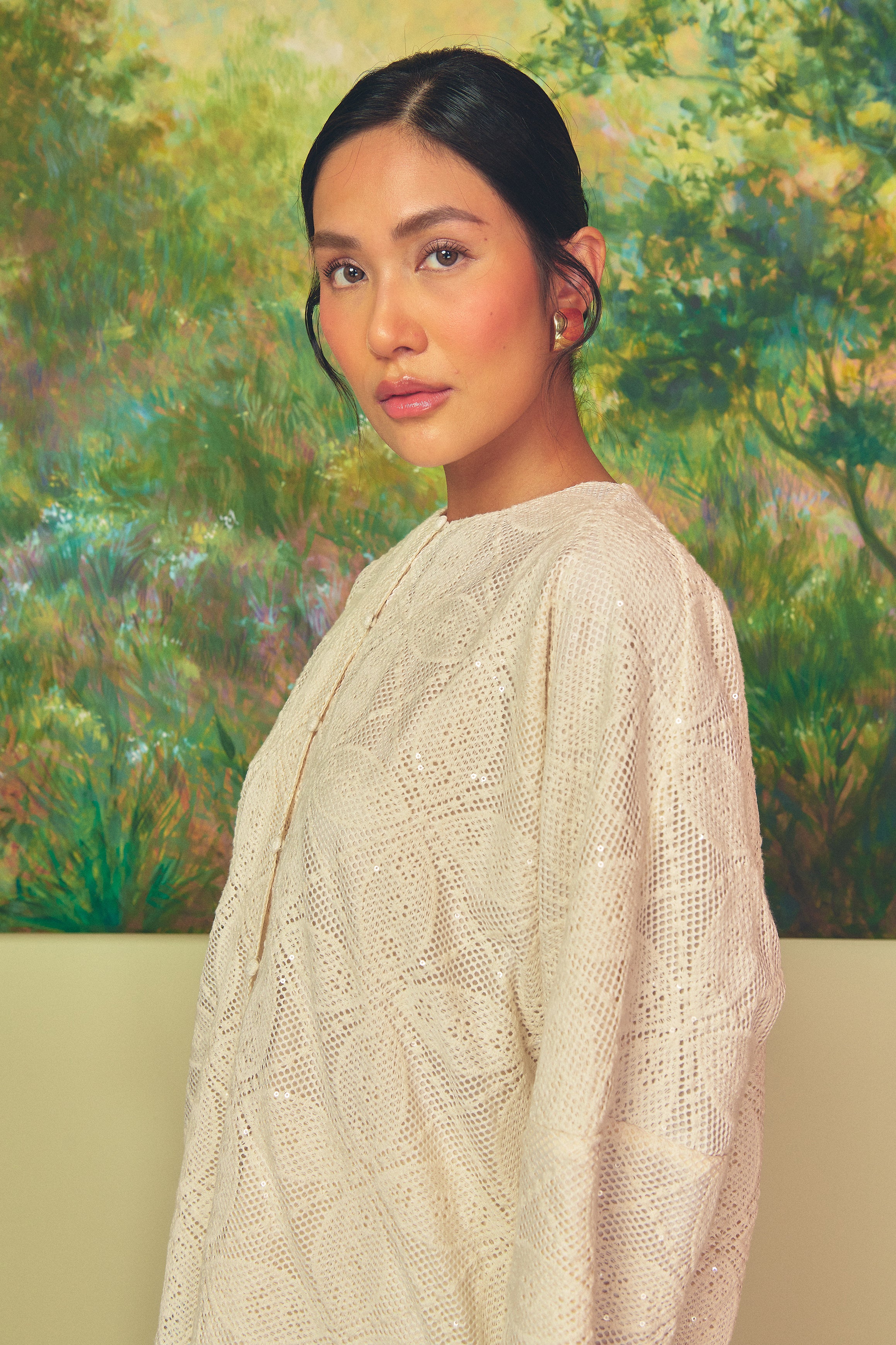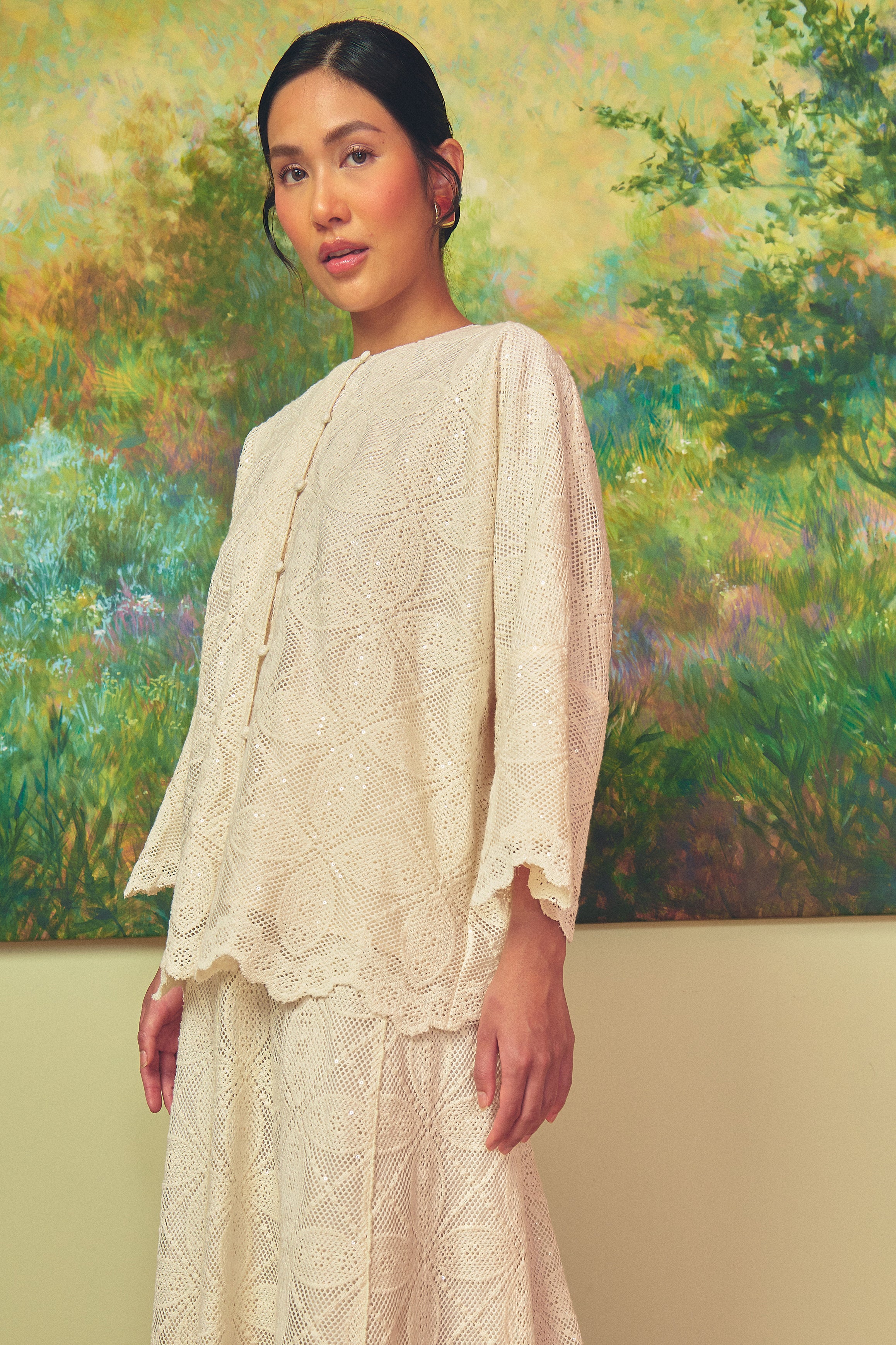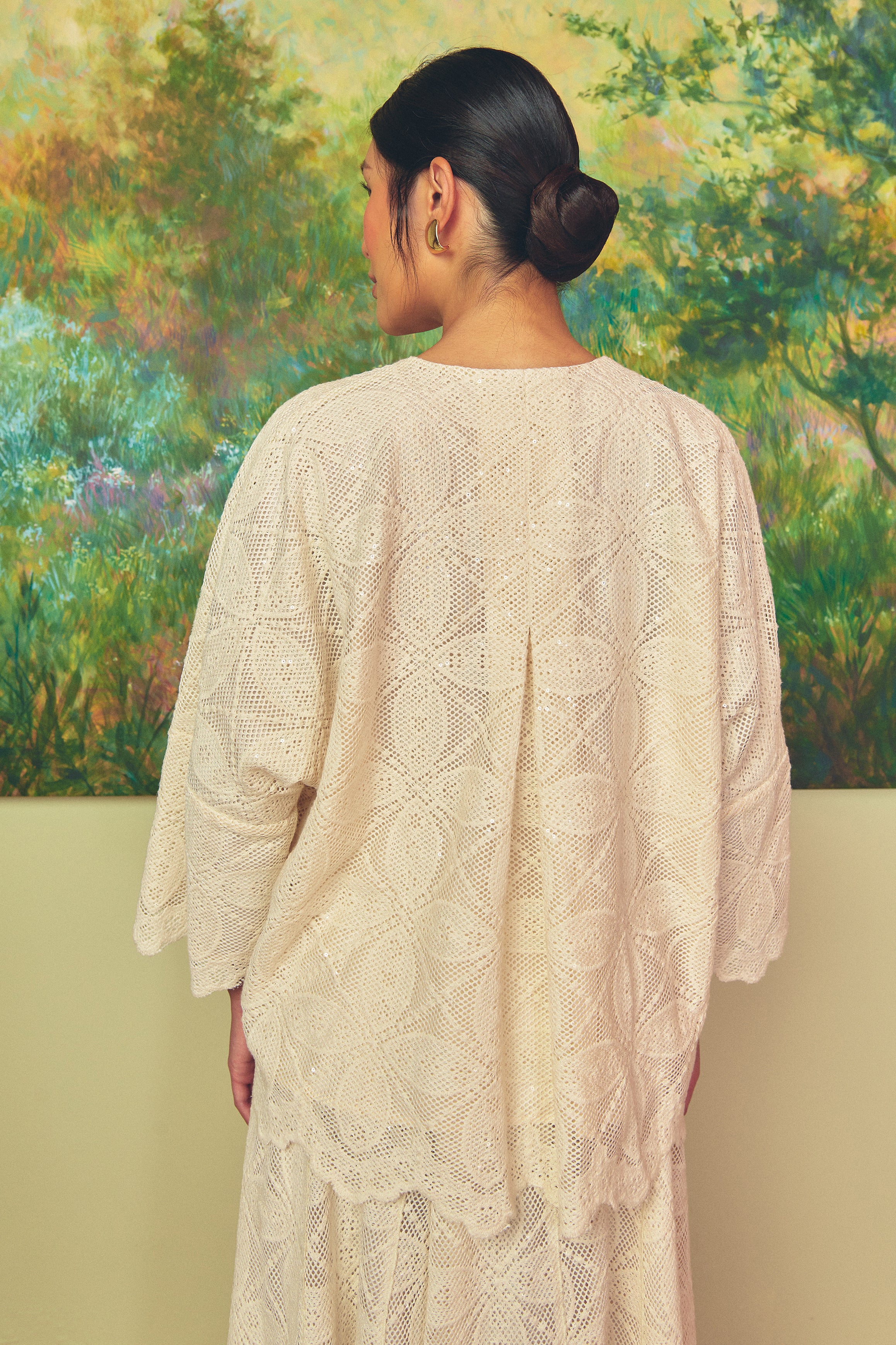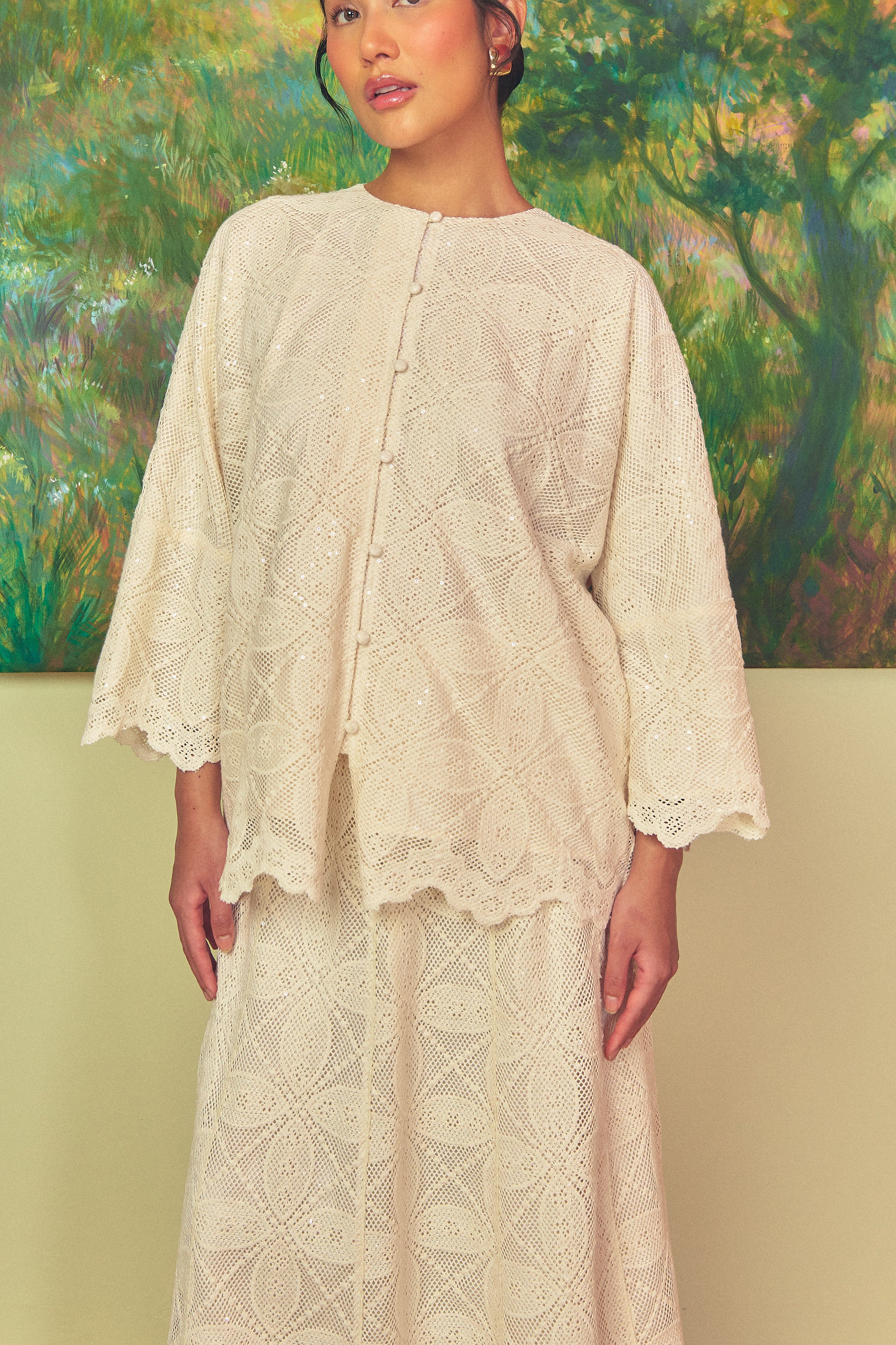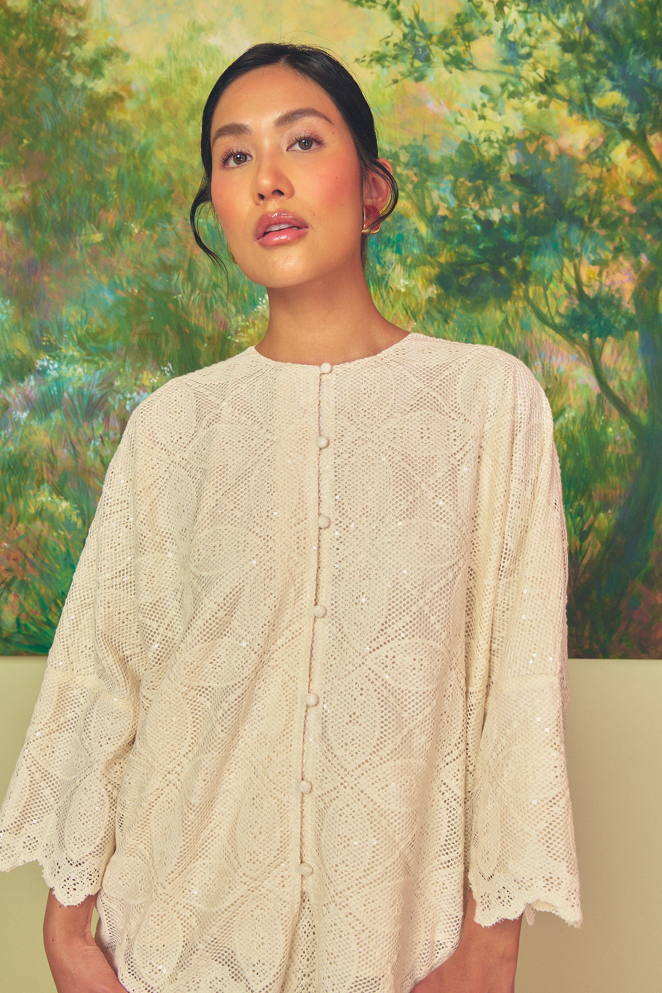 A batwing blouse, rendered in Cotton Crochet Lace. Features a scalloped lace hemline. Fully lined in Cotton.