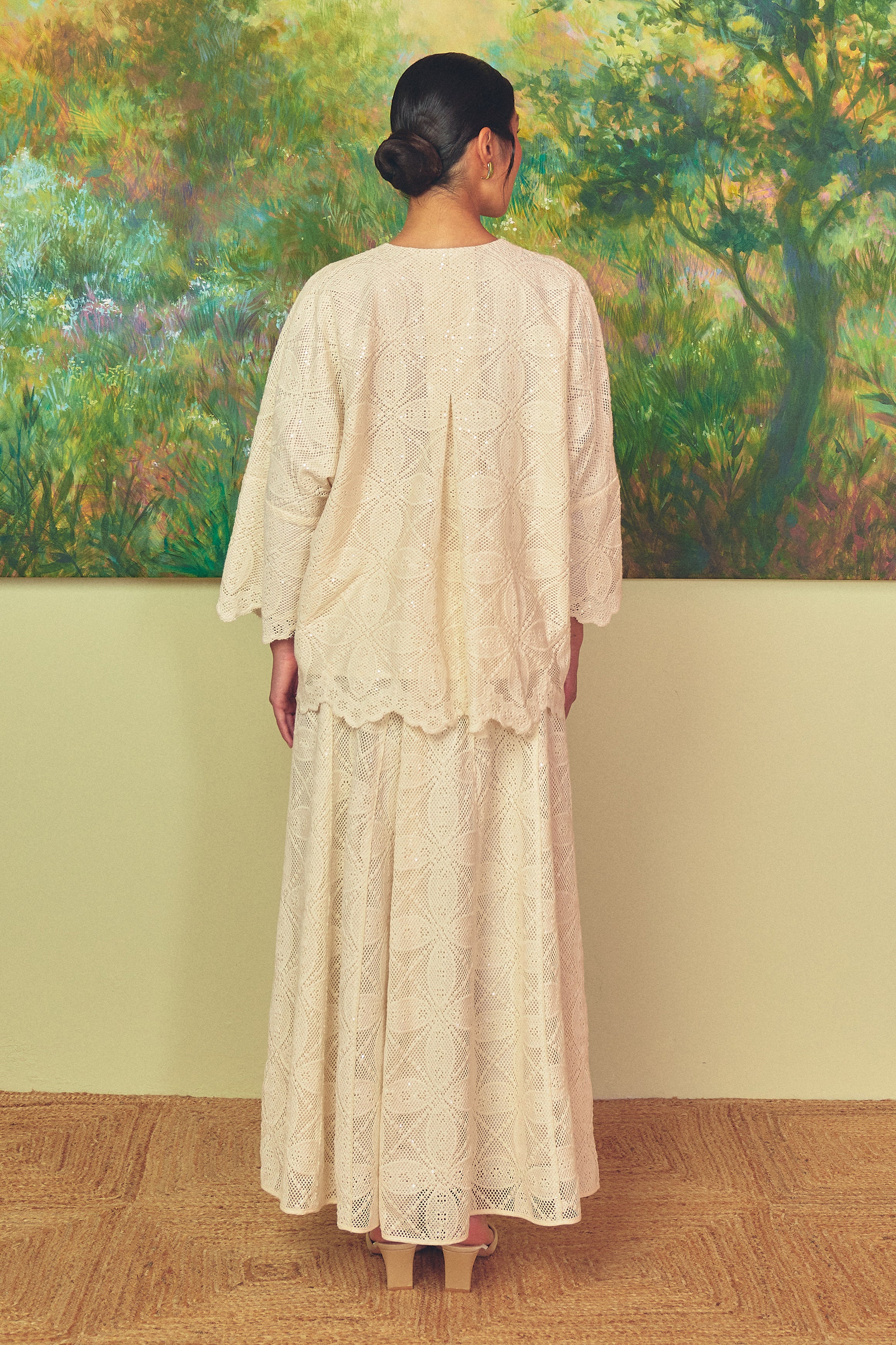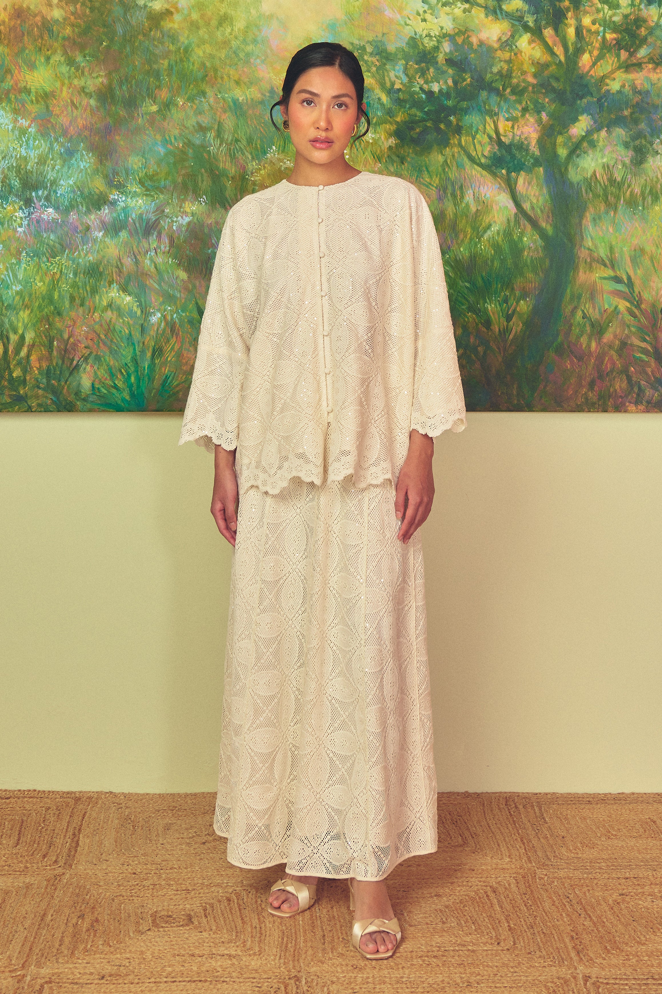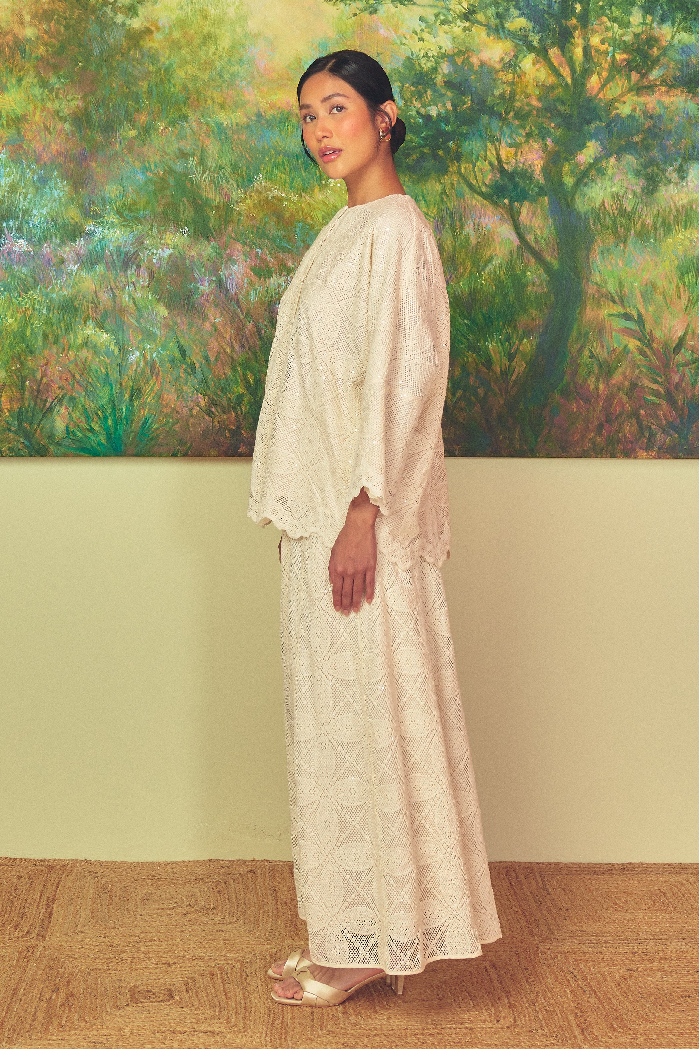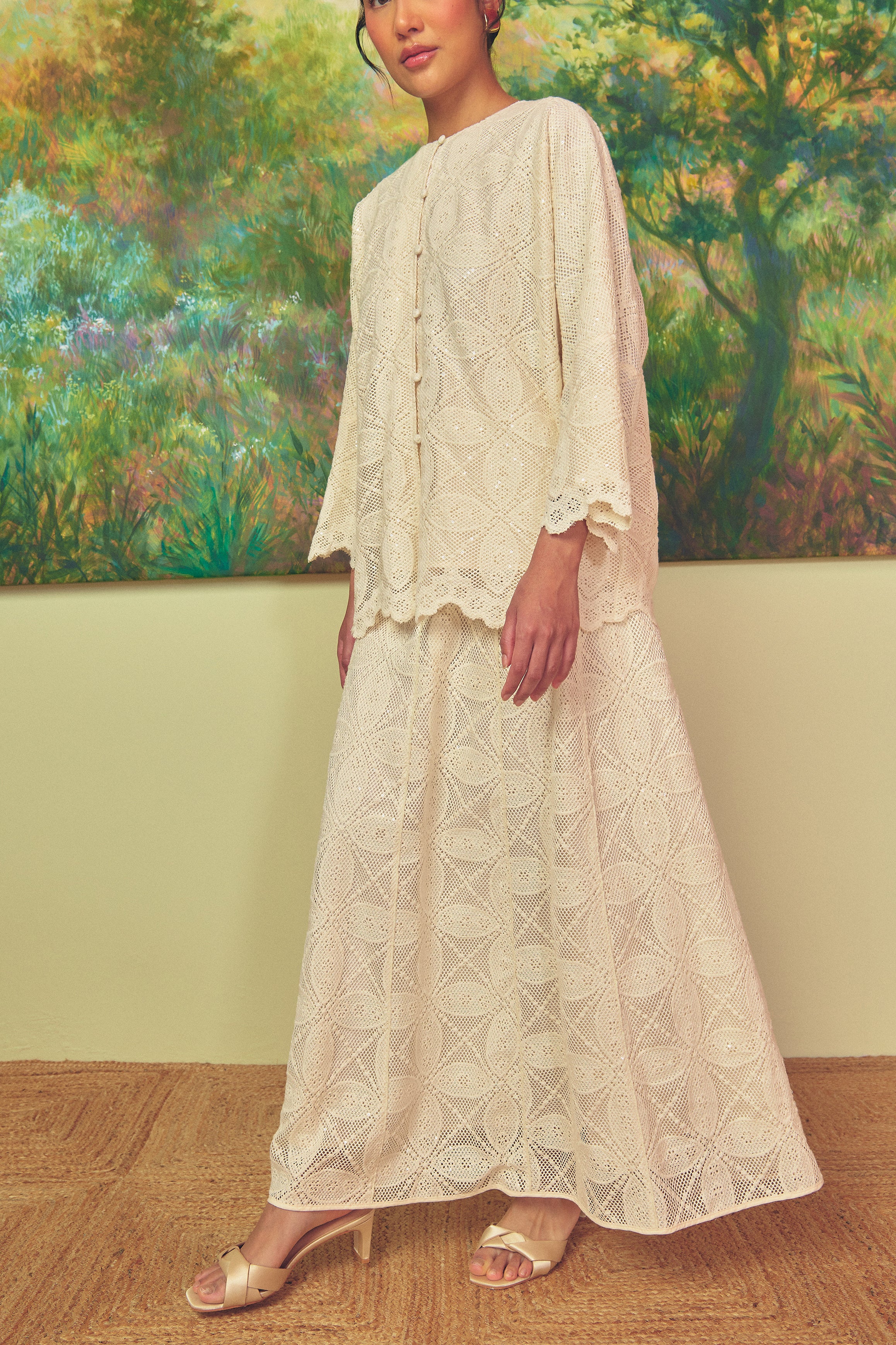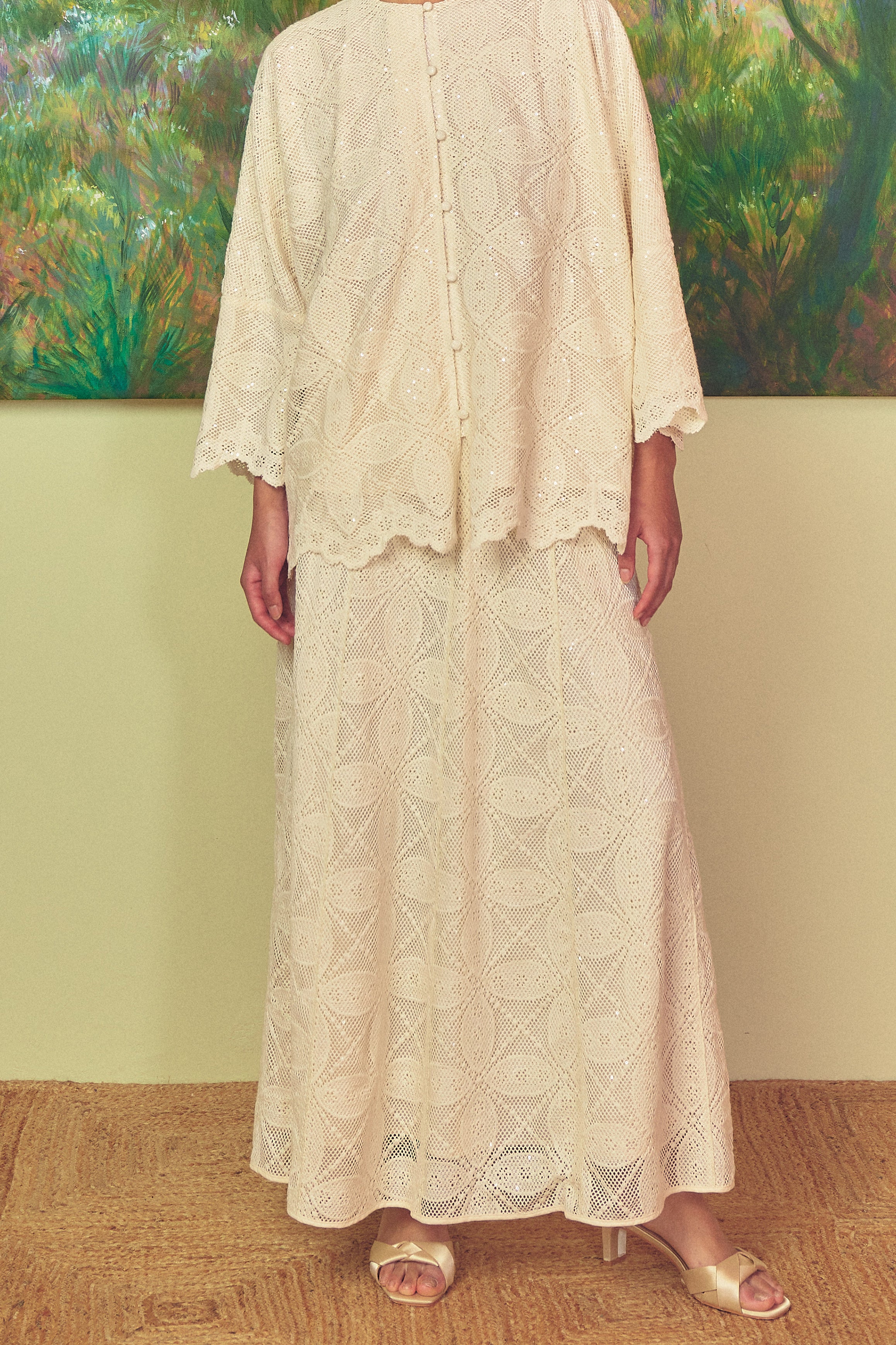 A bias cut skirt, rendered in Cotton Crochet Lace. Fully lined in Cotton.