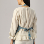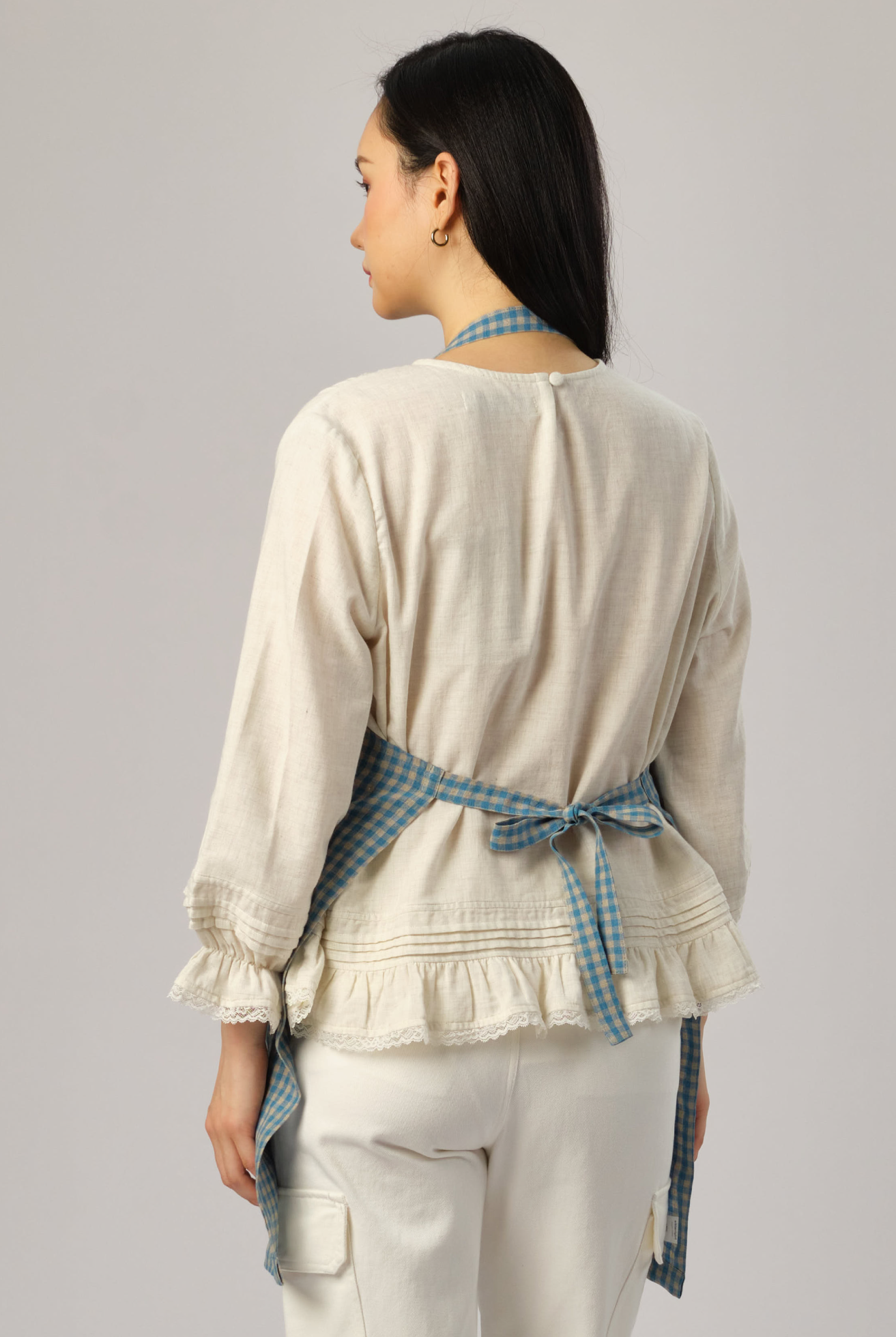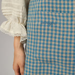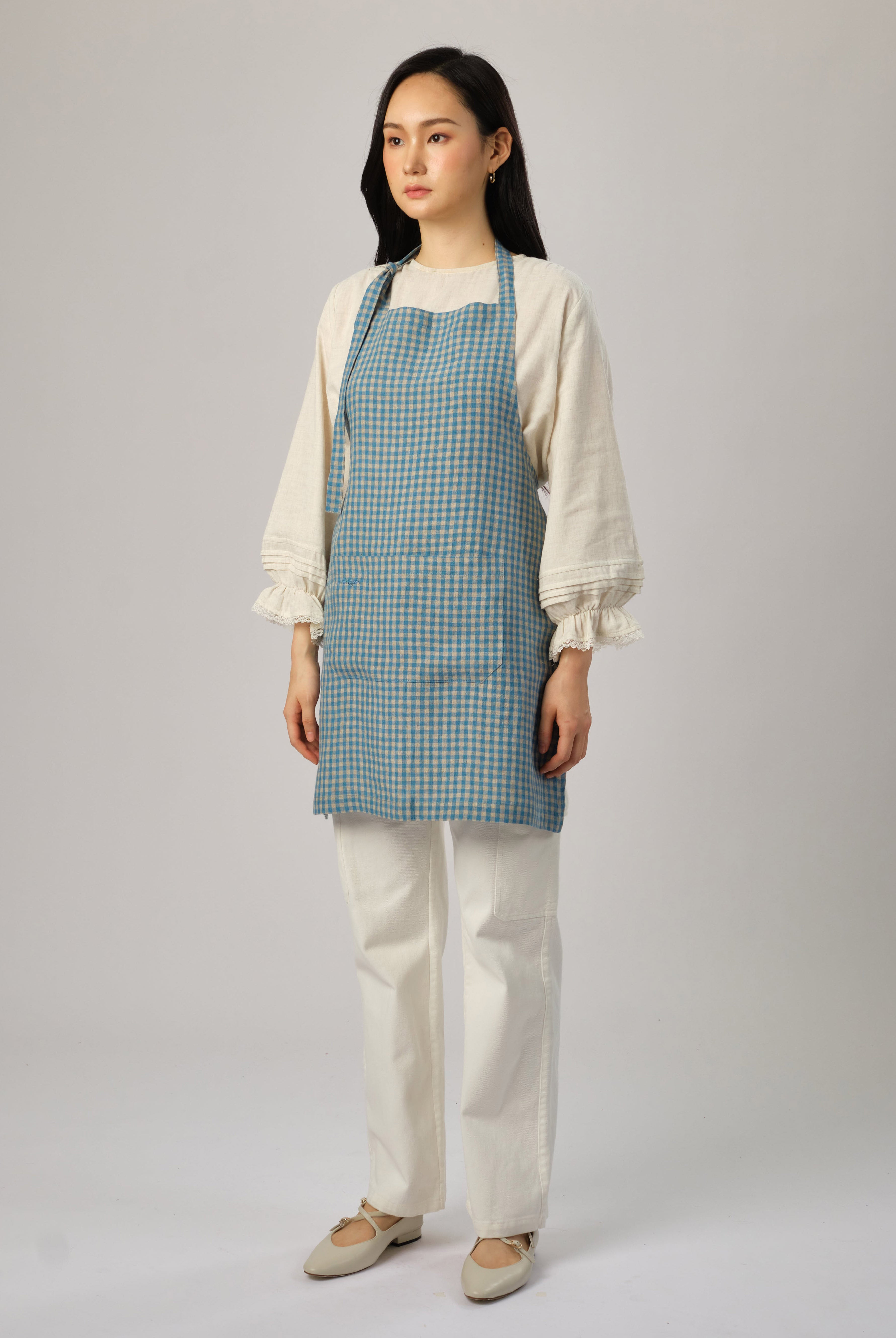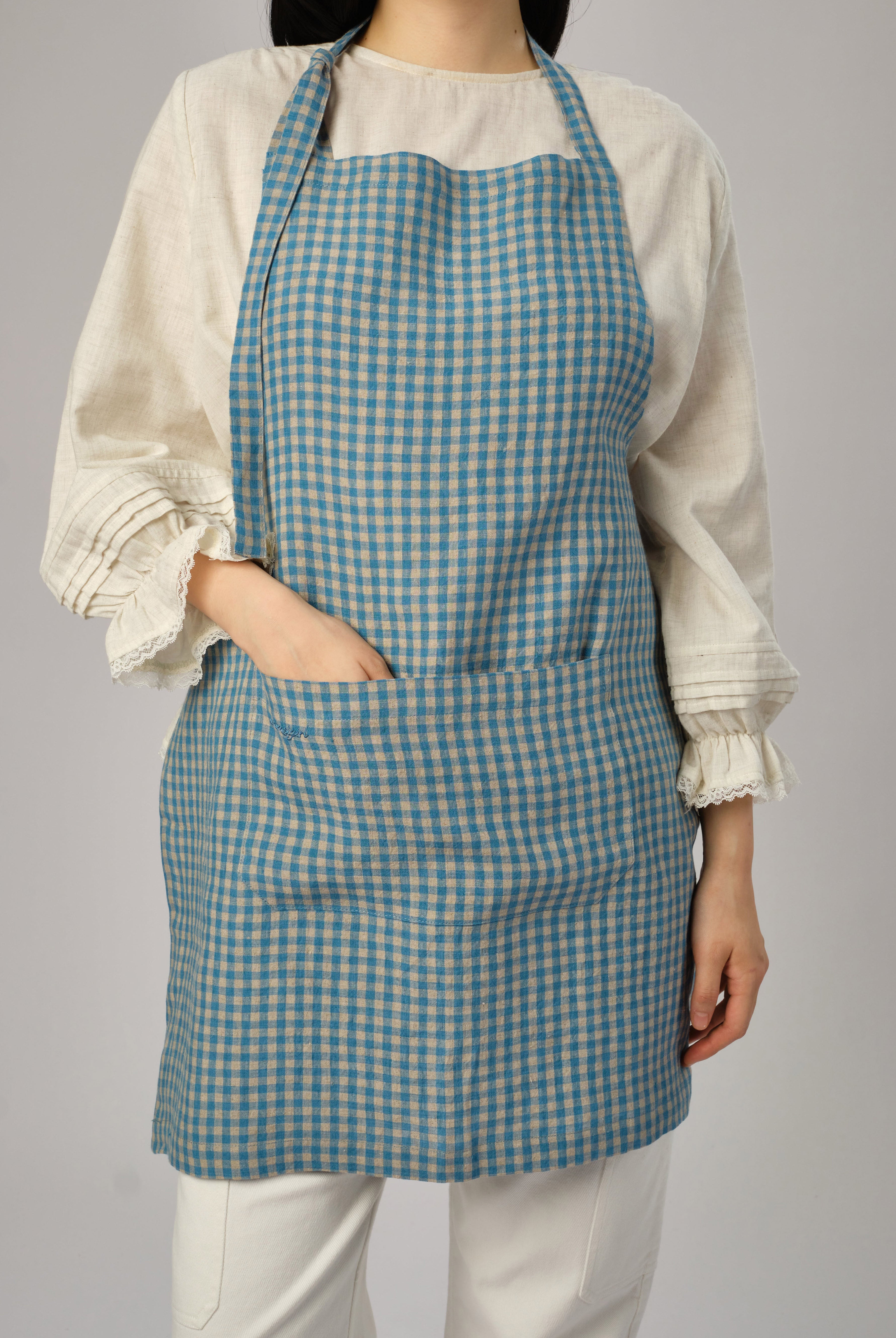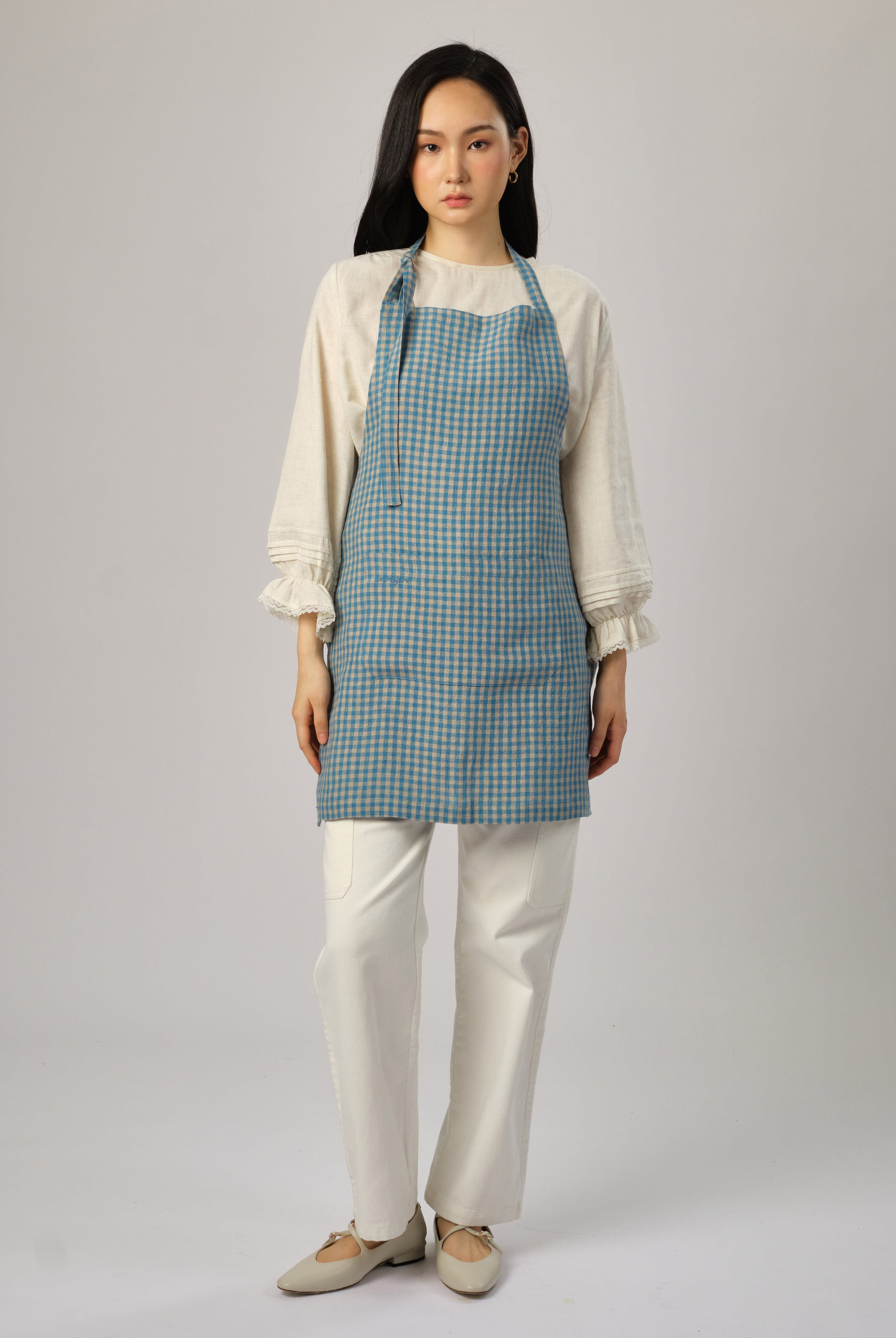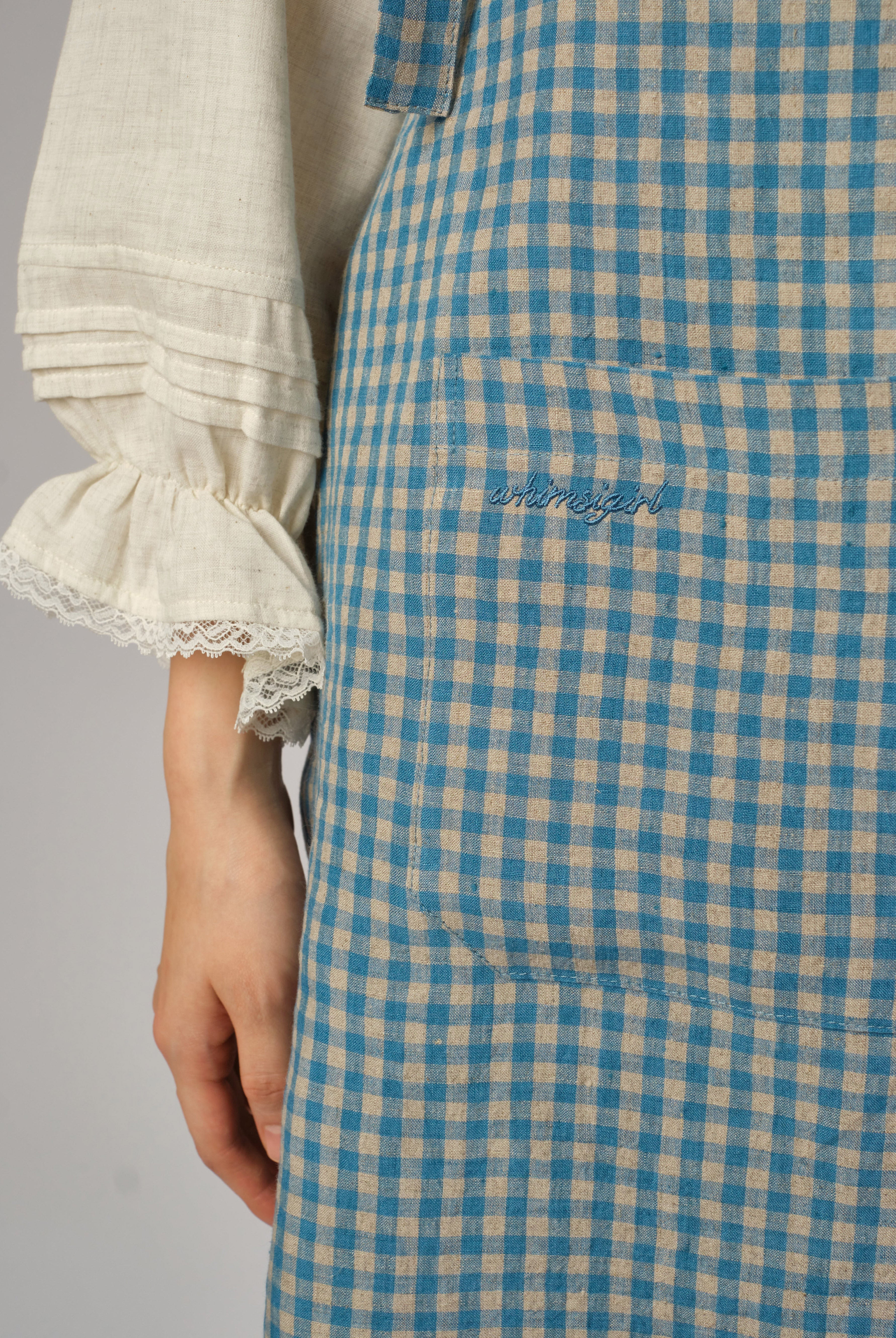Rendered in linen with a gingham print. Features a front pocket, adjustable neck strap and waist ties.