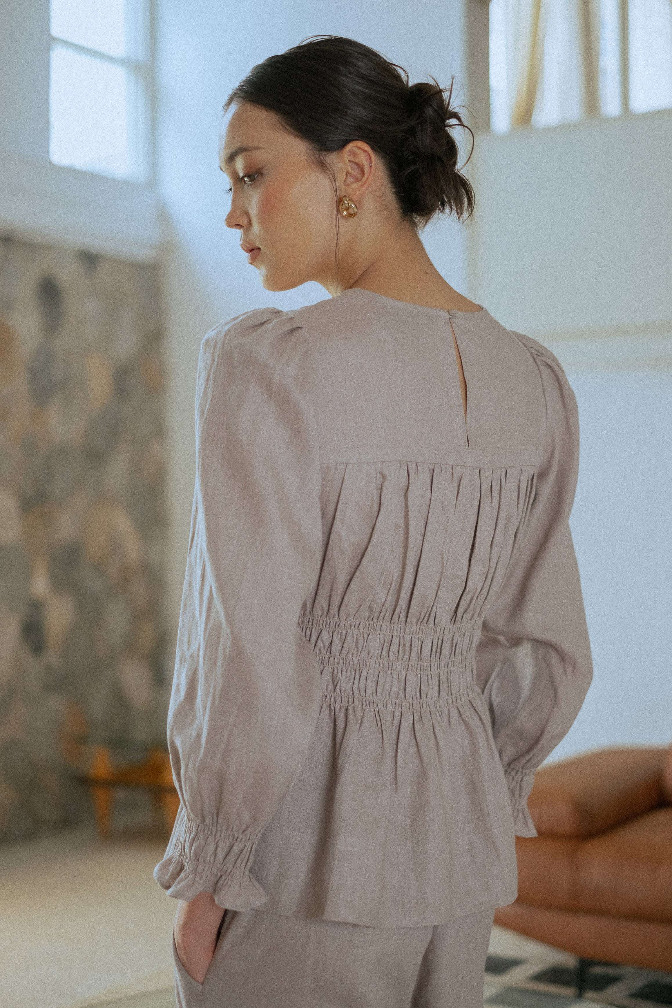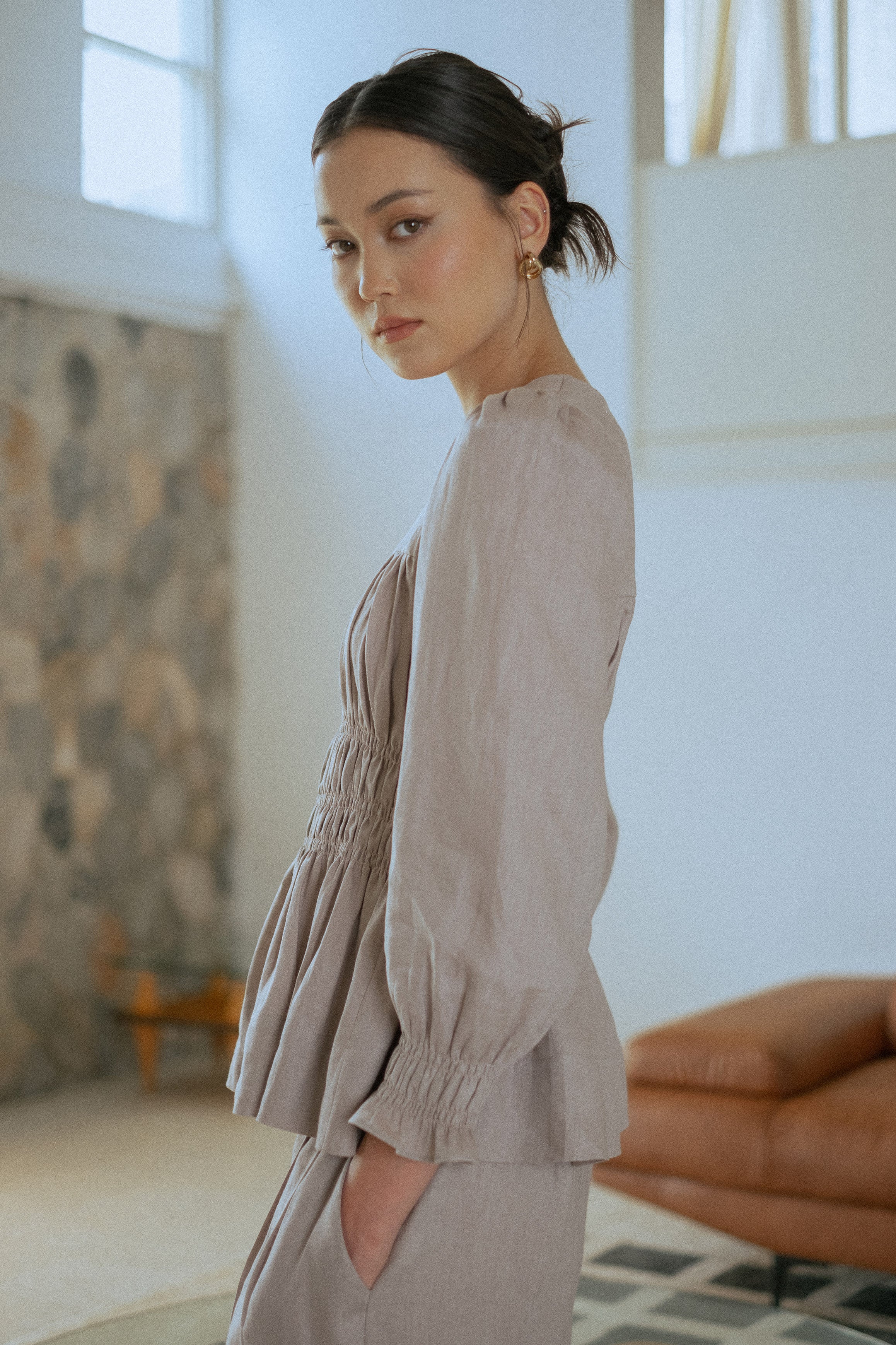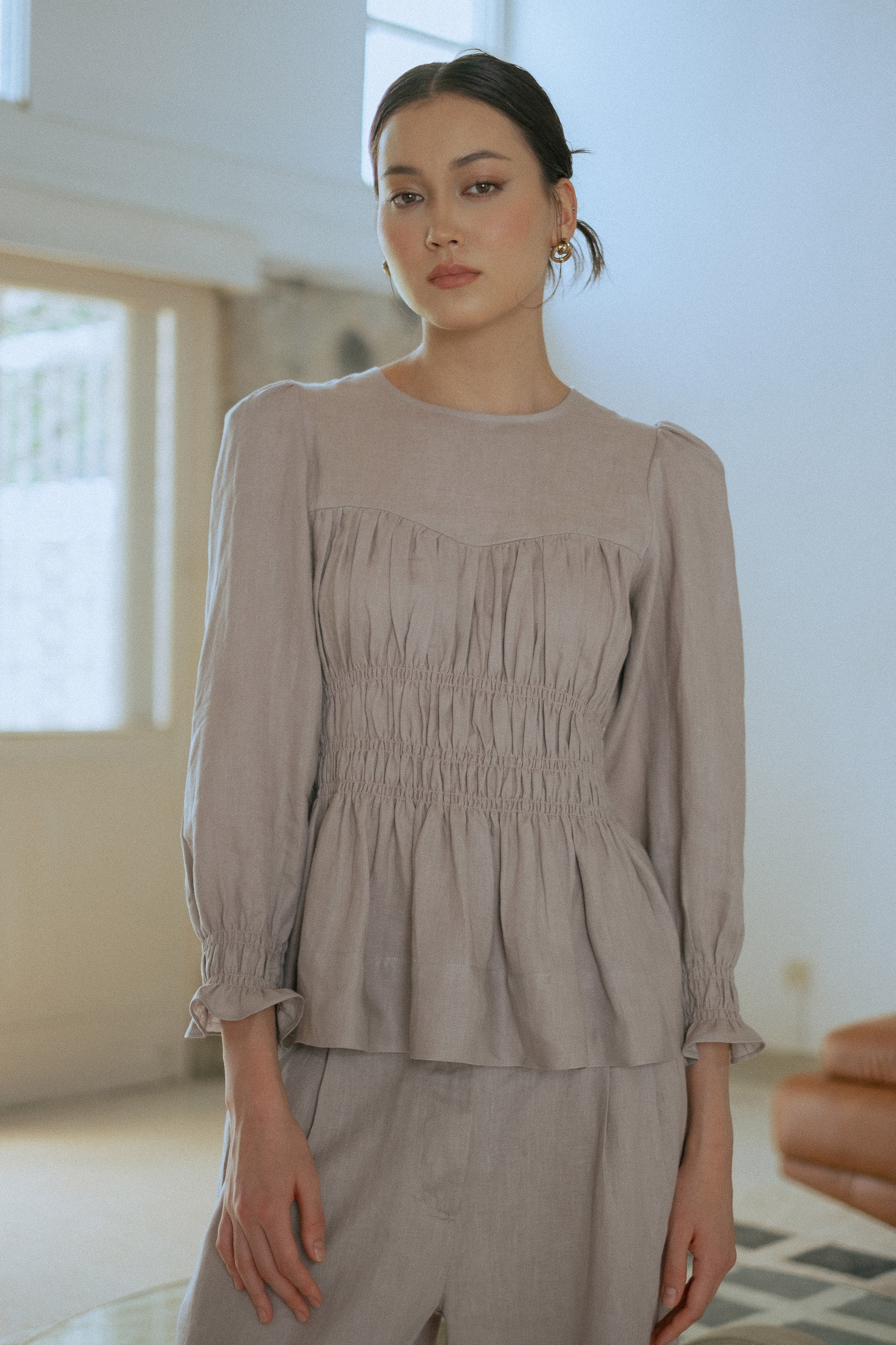 A shirred bustier blouse with a peplum, balancing structure and ease. Rendered in linen and finished with smocked wristbands and a round neckline.