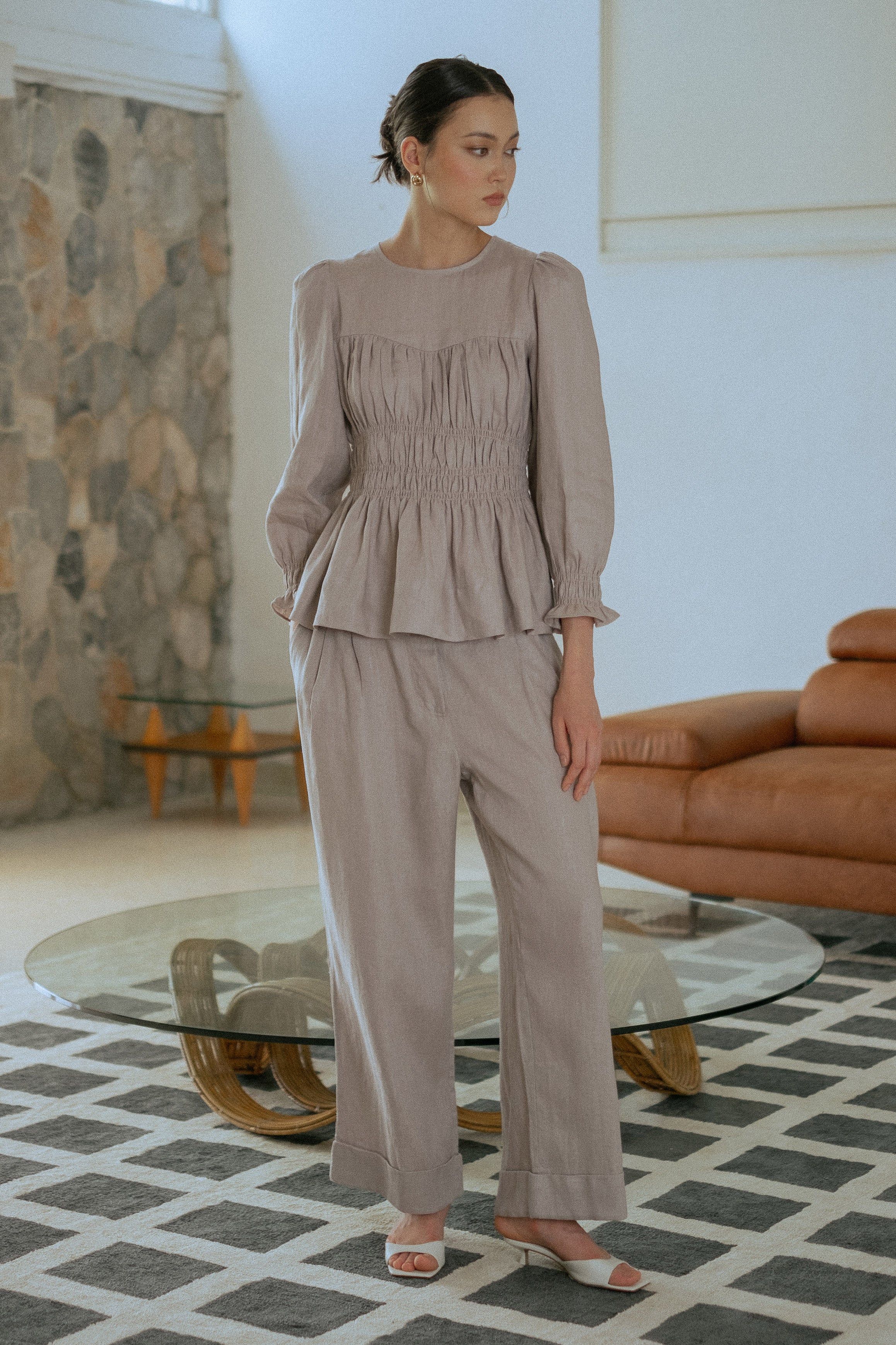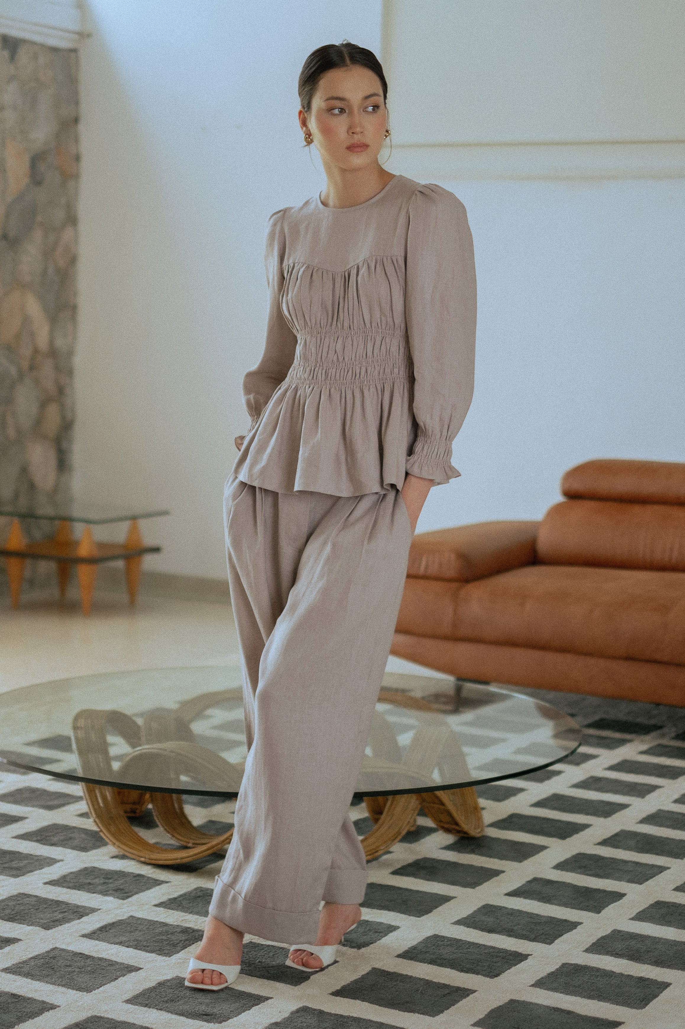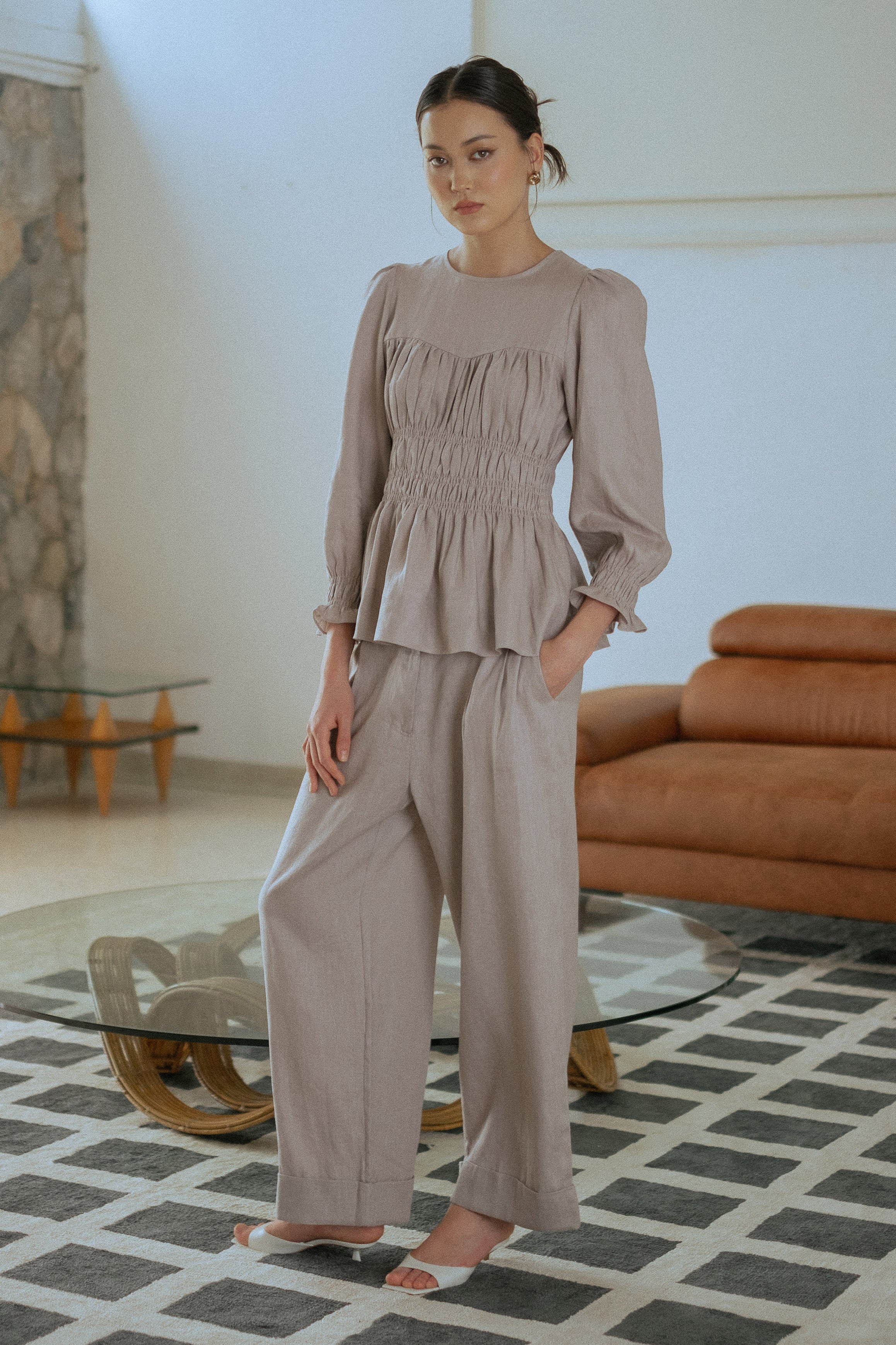A shirred bustier blouse with a peplum, balancing structure and ease. Rendered in linen and finished with smocked wristbands and a round neckline.