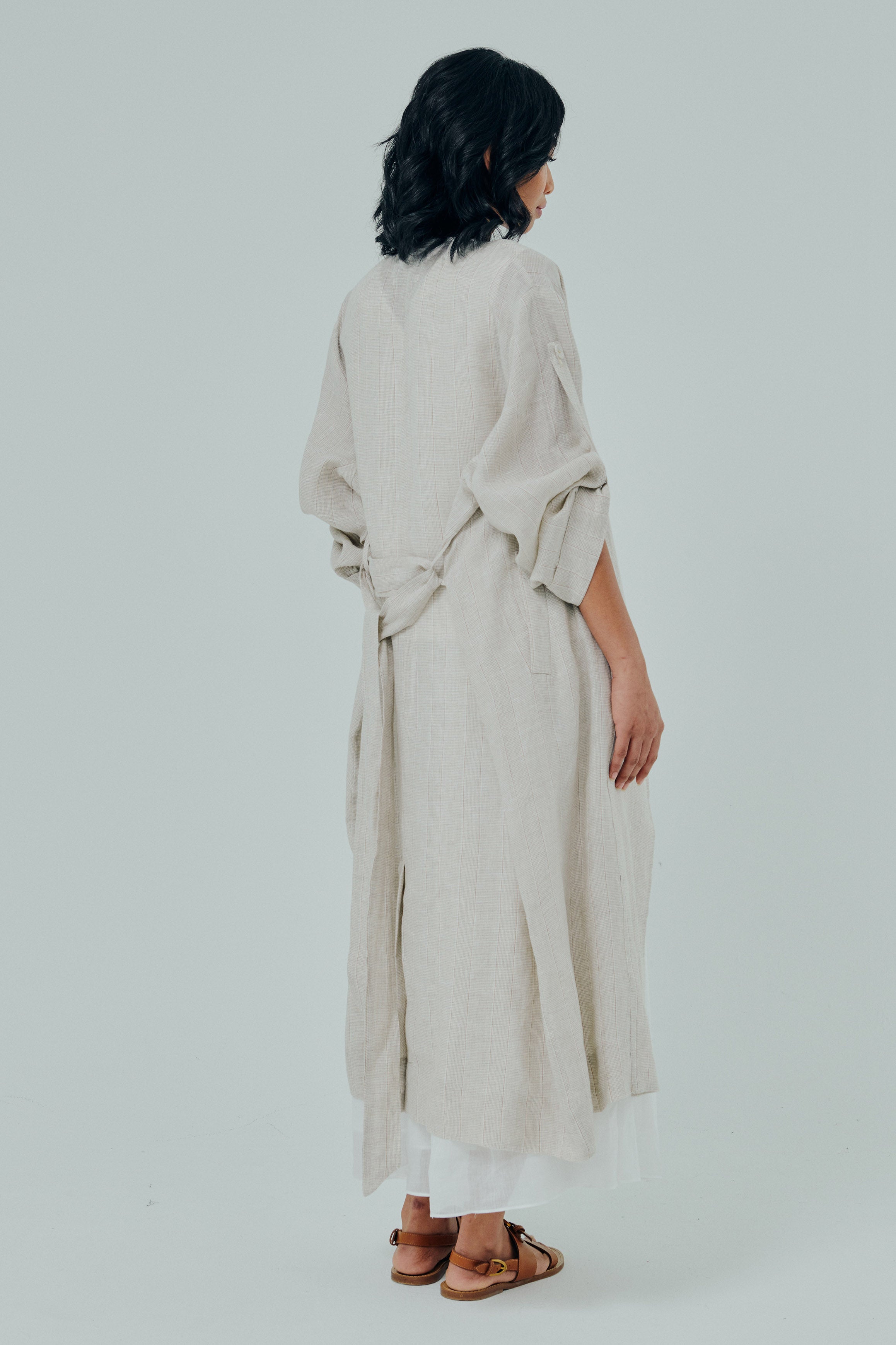 A relaxed fit, ankle-length lightweight coat. Features a double-breasted front and turn-up sleeves detailed with buttons. Finished with side pockets and a waist tie. Rendered in linen.