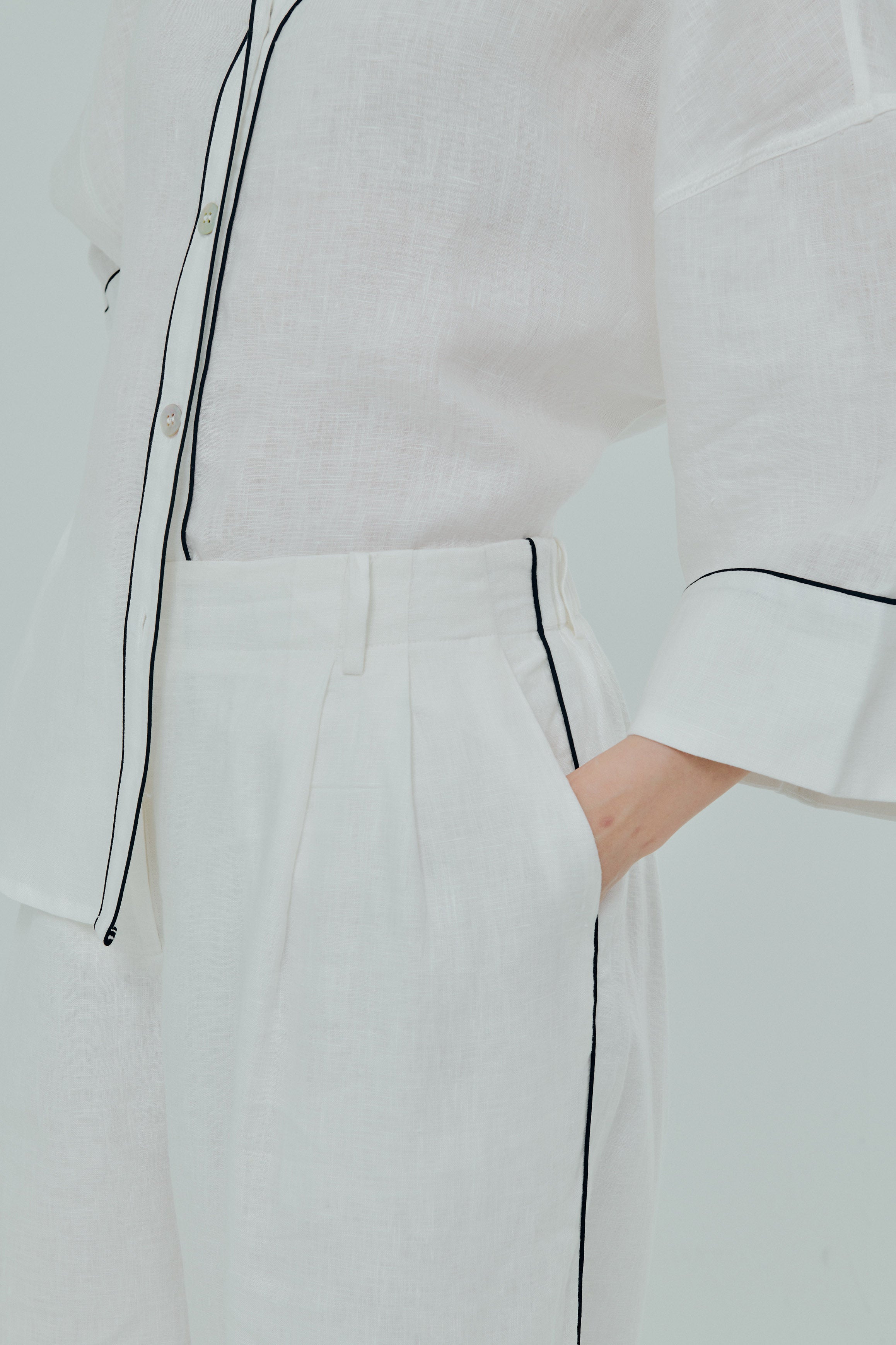 Tailored trousers, with a front zip, button fastening and half-elastic waistband. Finished with side and back pockets, with contrast black piping. Rendered in linen, and lined in cotton.