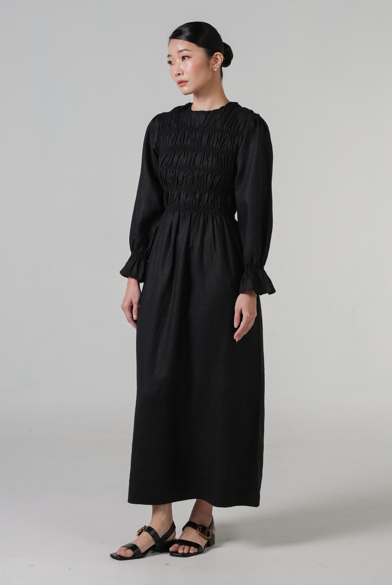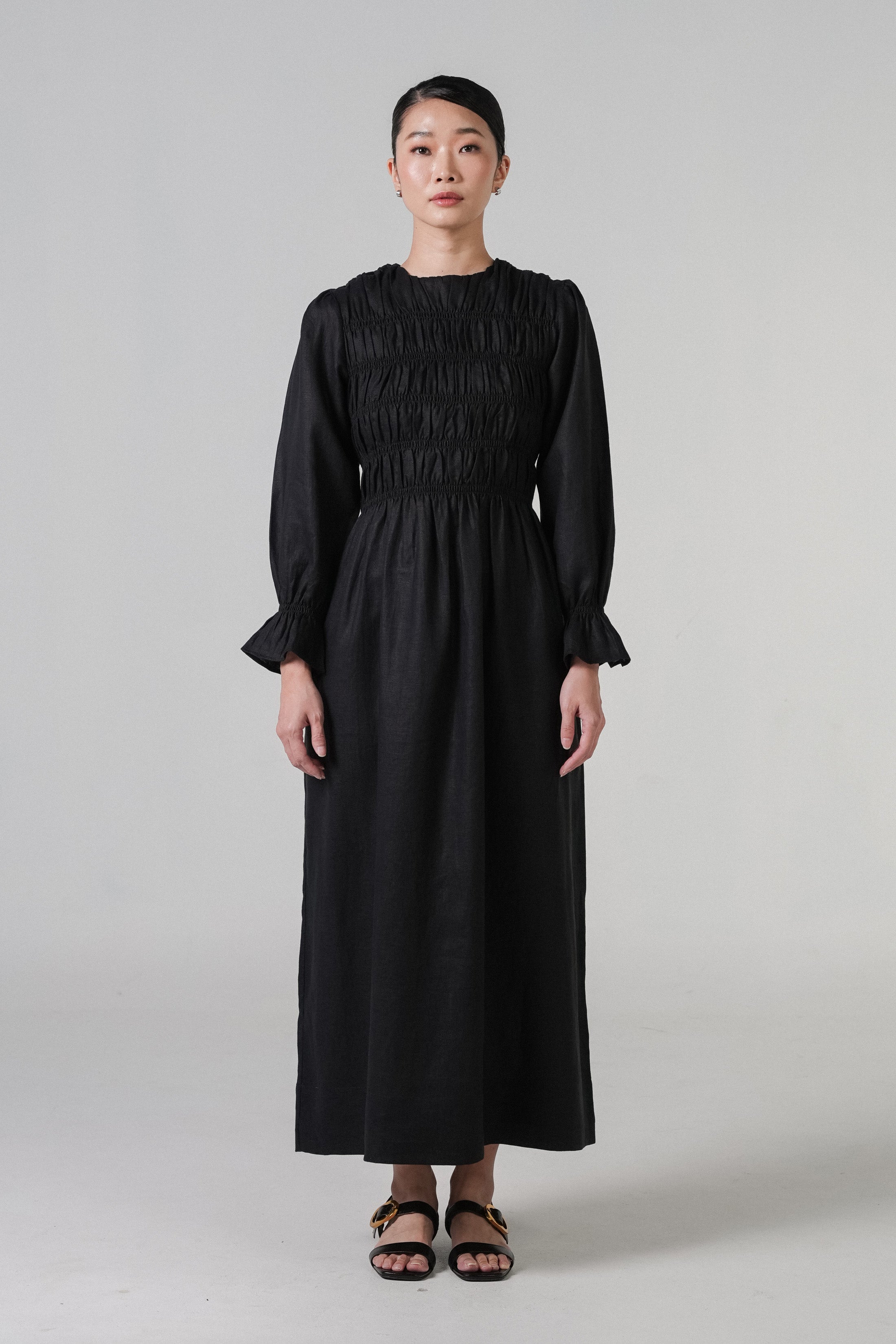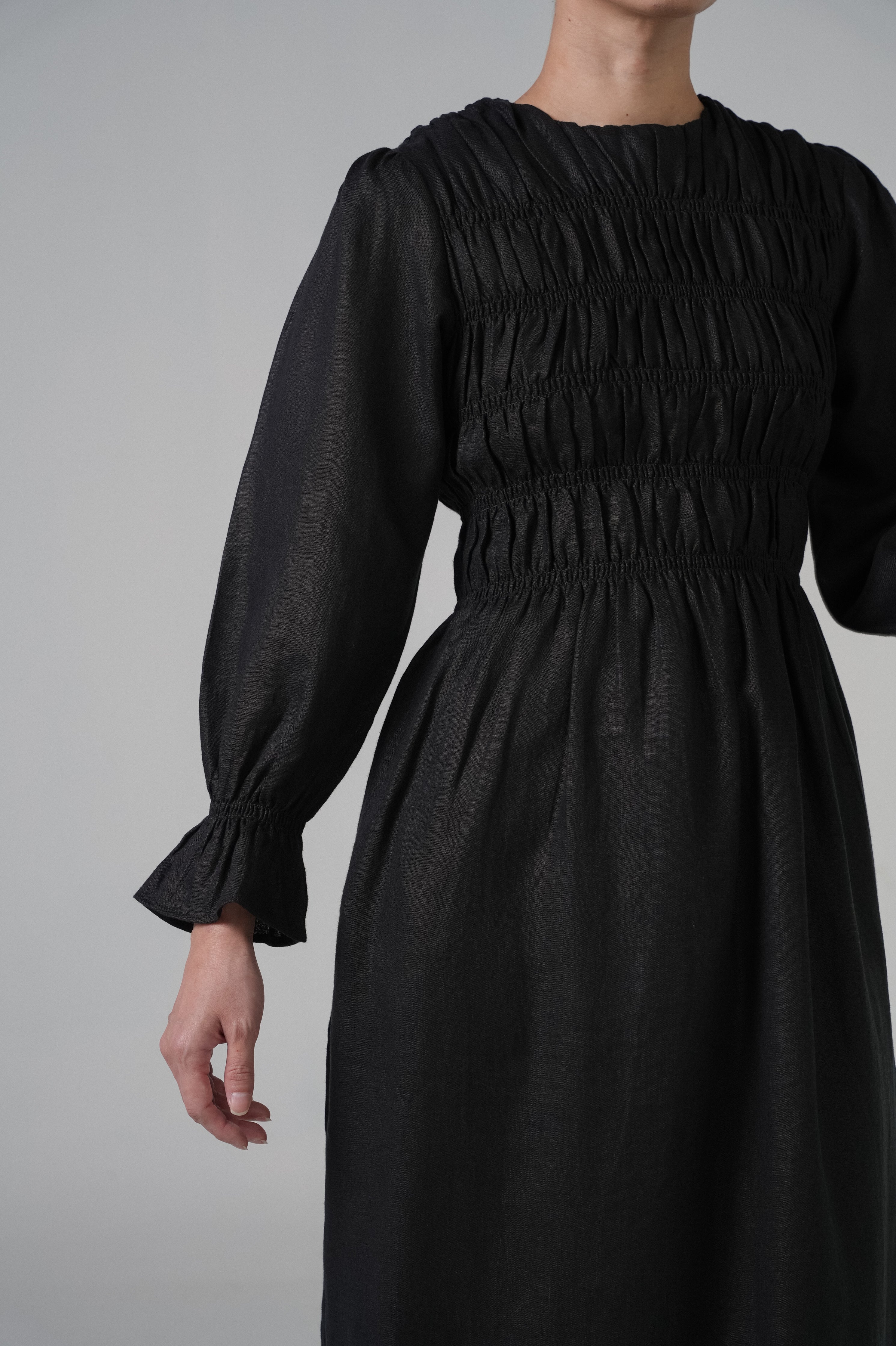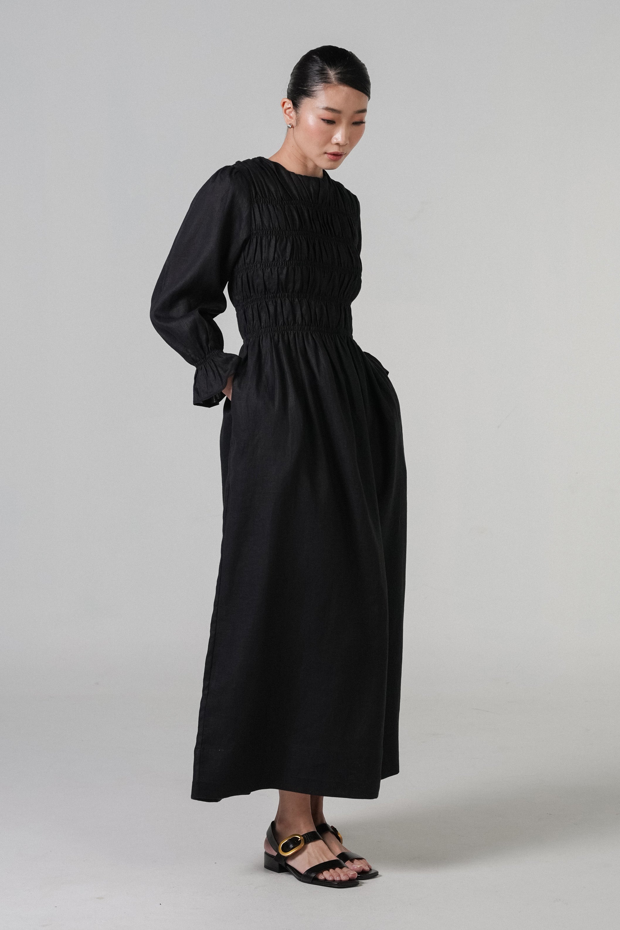 A shirred dress, for a touch of texture and volume. Featuring puffed sleeves and a smocked bodice. Rendered in 100% linen. Finished with pockets.