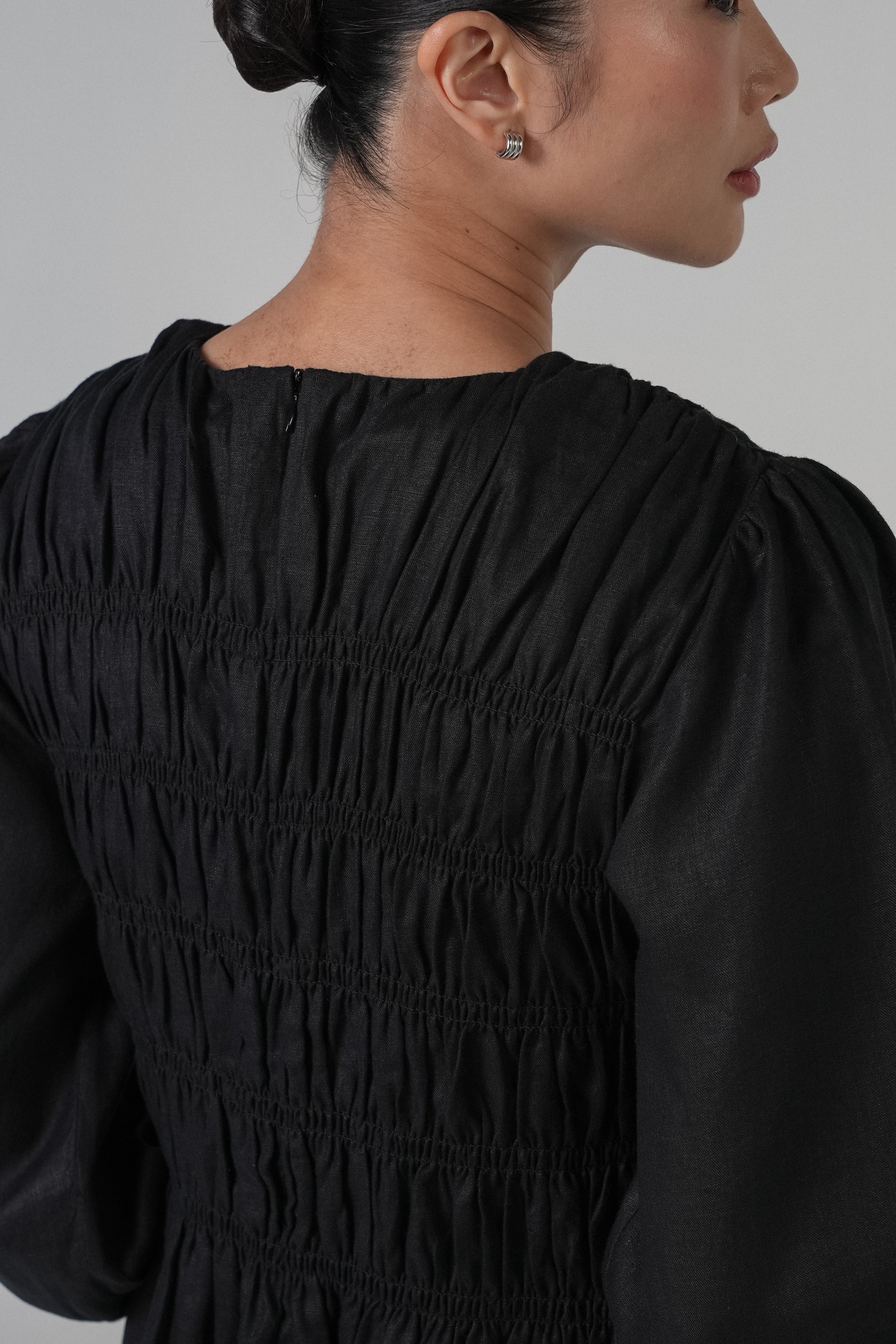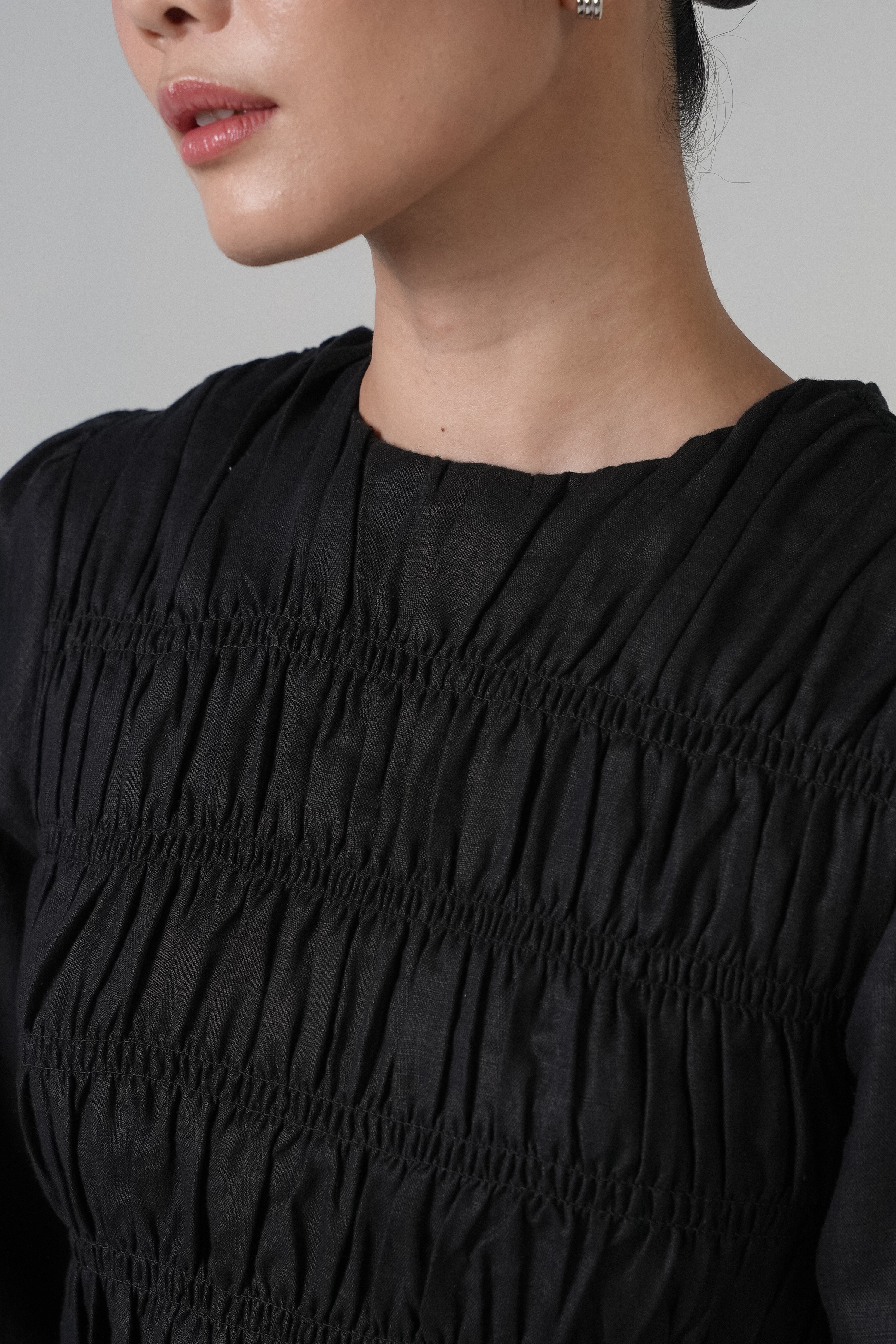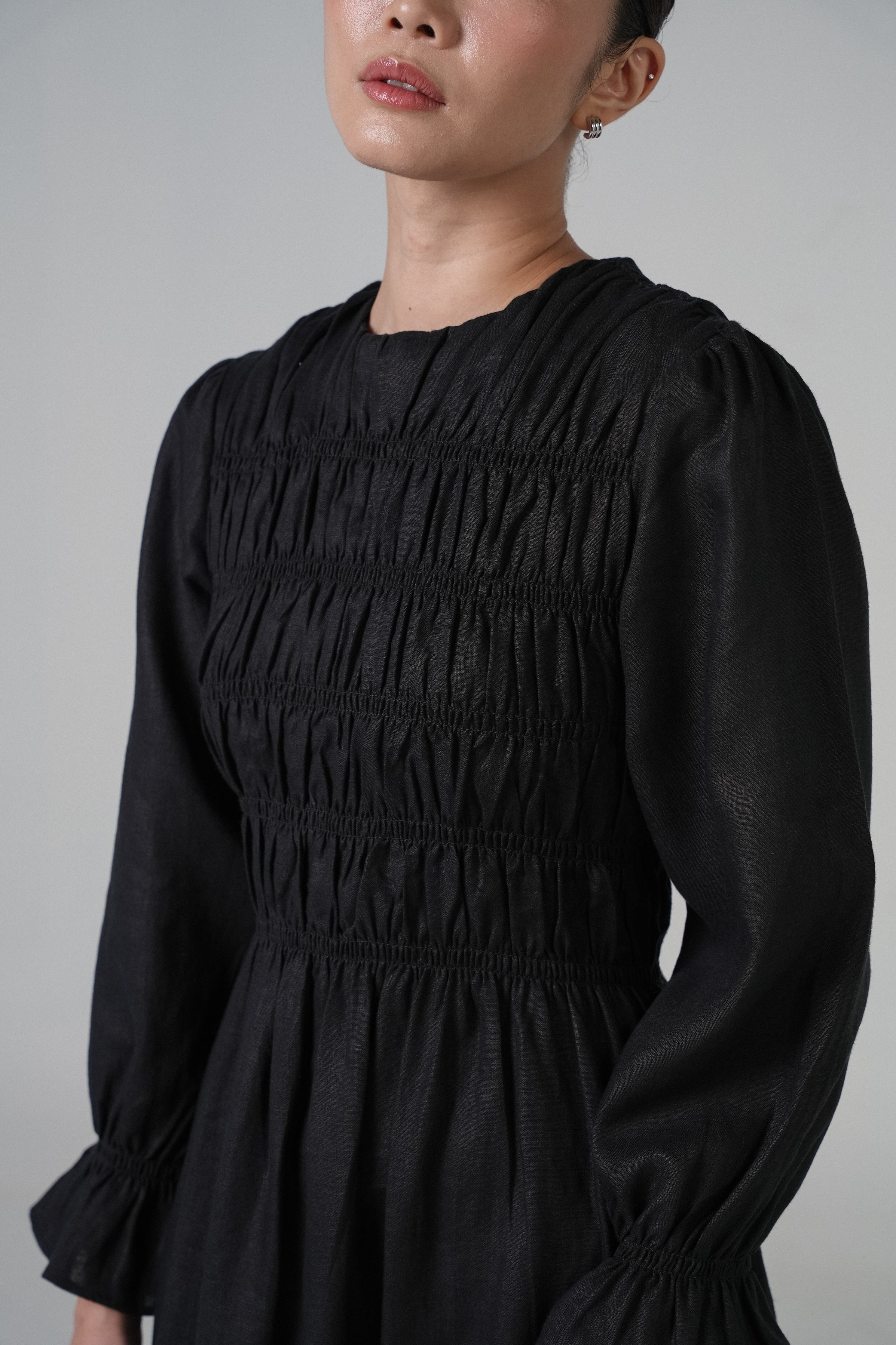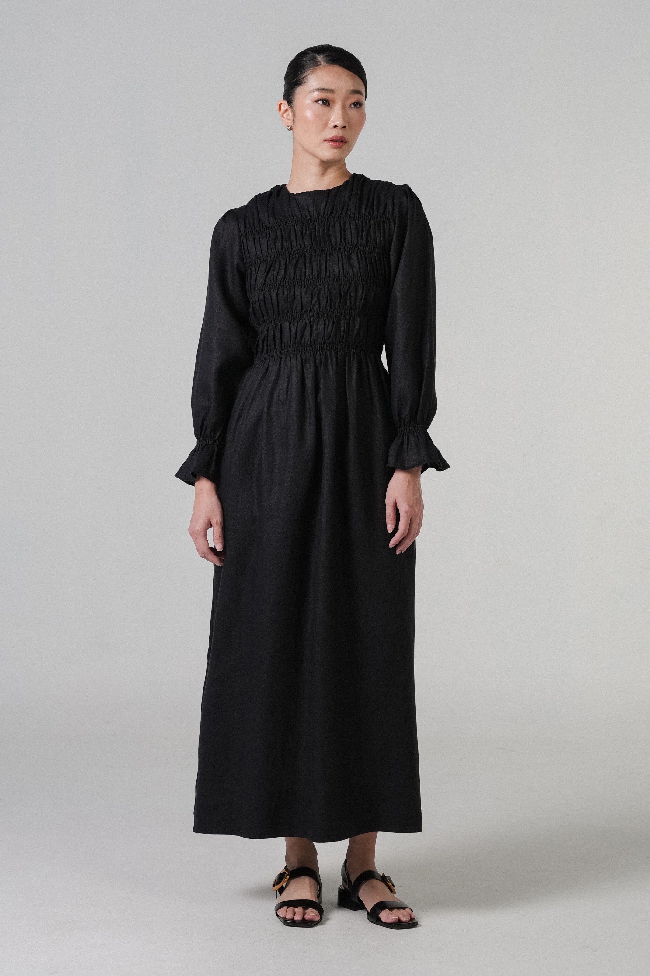 A shirred dress, for a touch of texture and volume. Featuring puffed sleeves and a smocked bodice. Rendered in 100% linen. Finished with pockets.