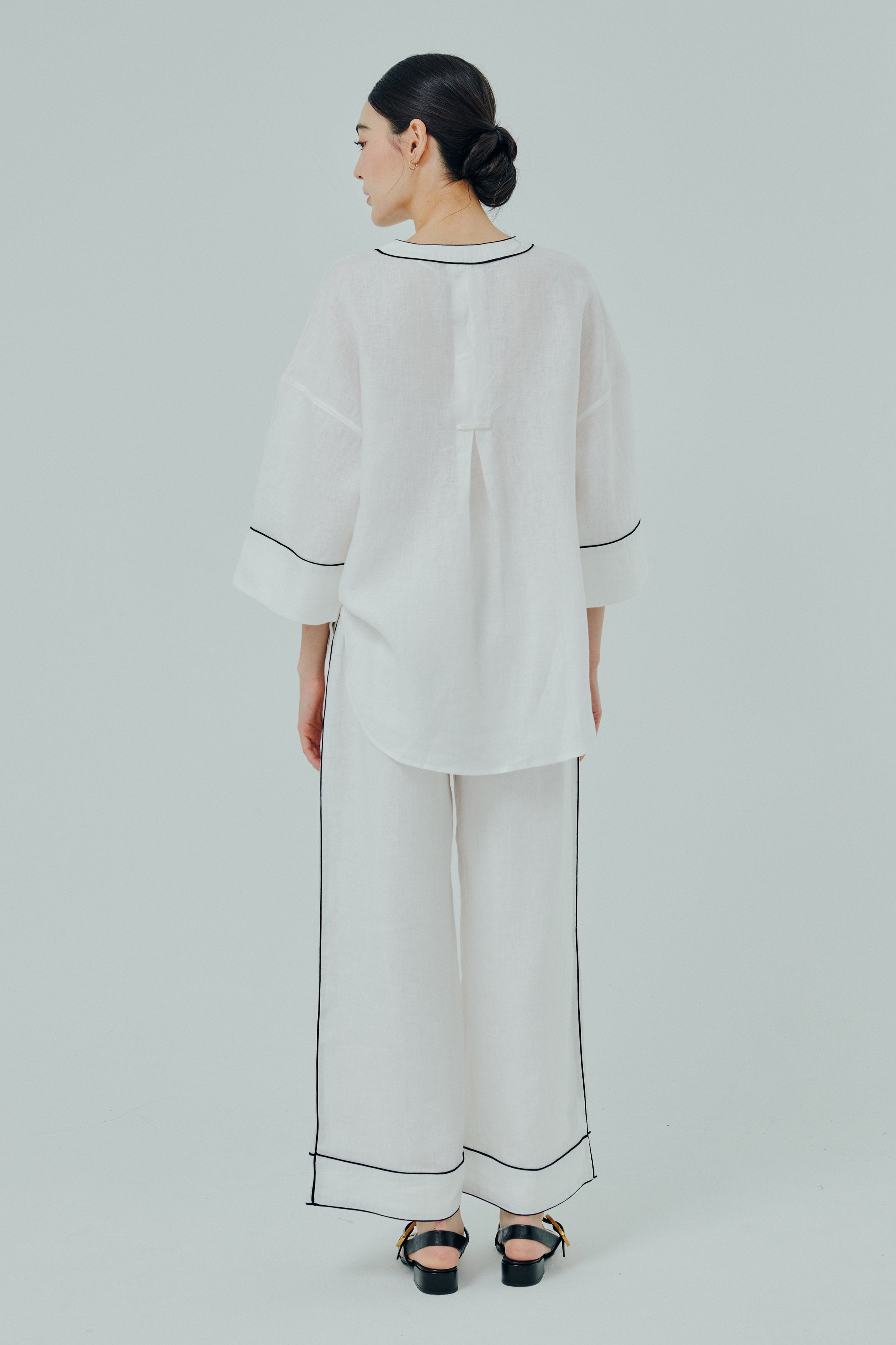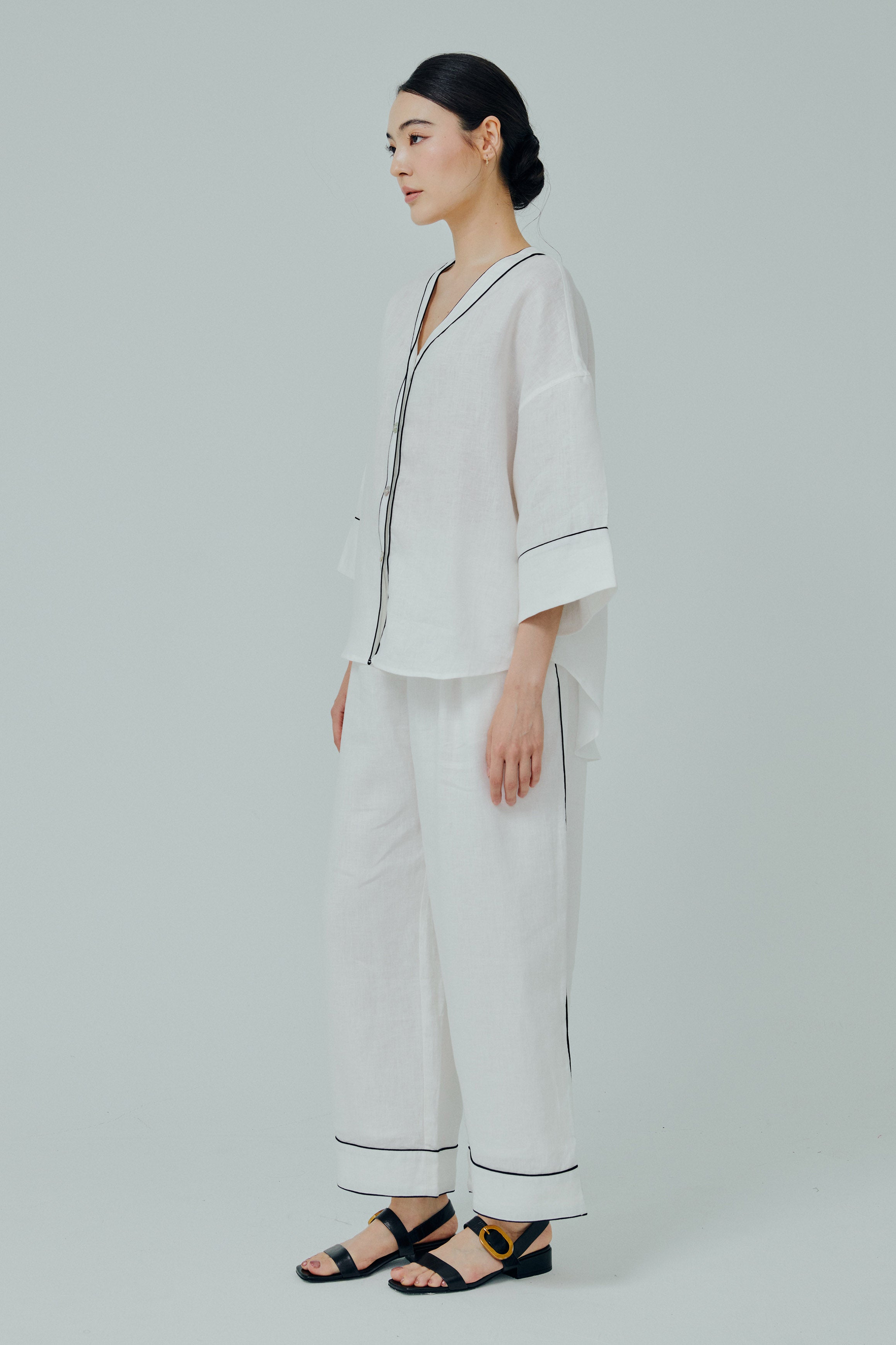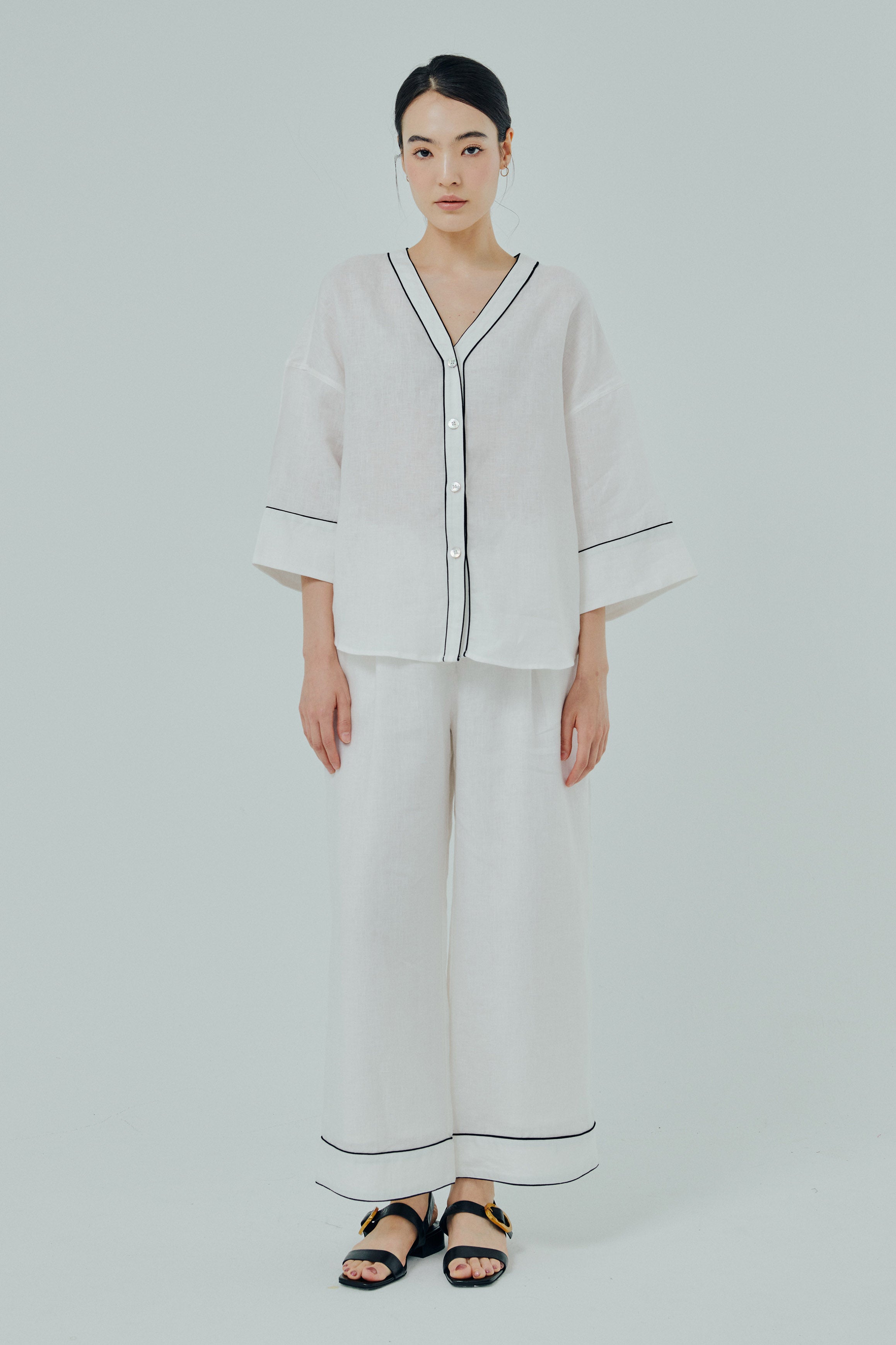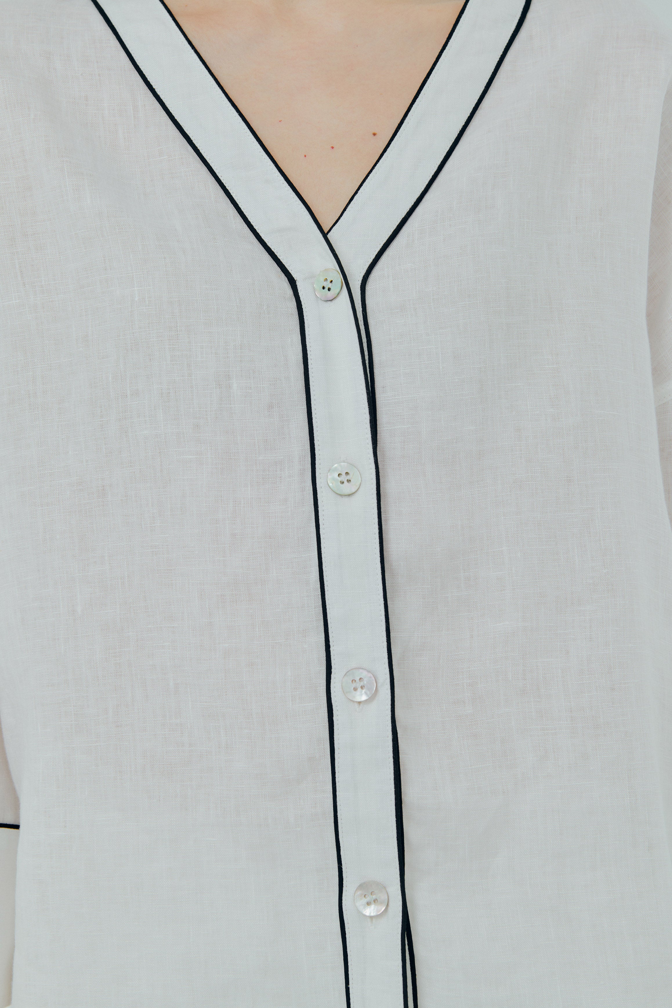 An oversized fit with an open V-neck and pointed collar, complemented by drop shoulders for an easygoing silhouette. Rendered in linen.