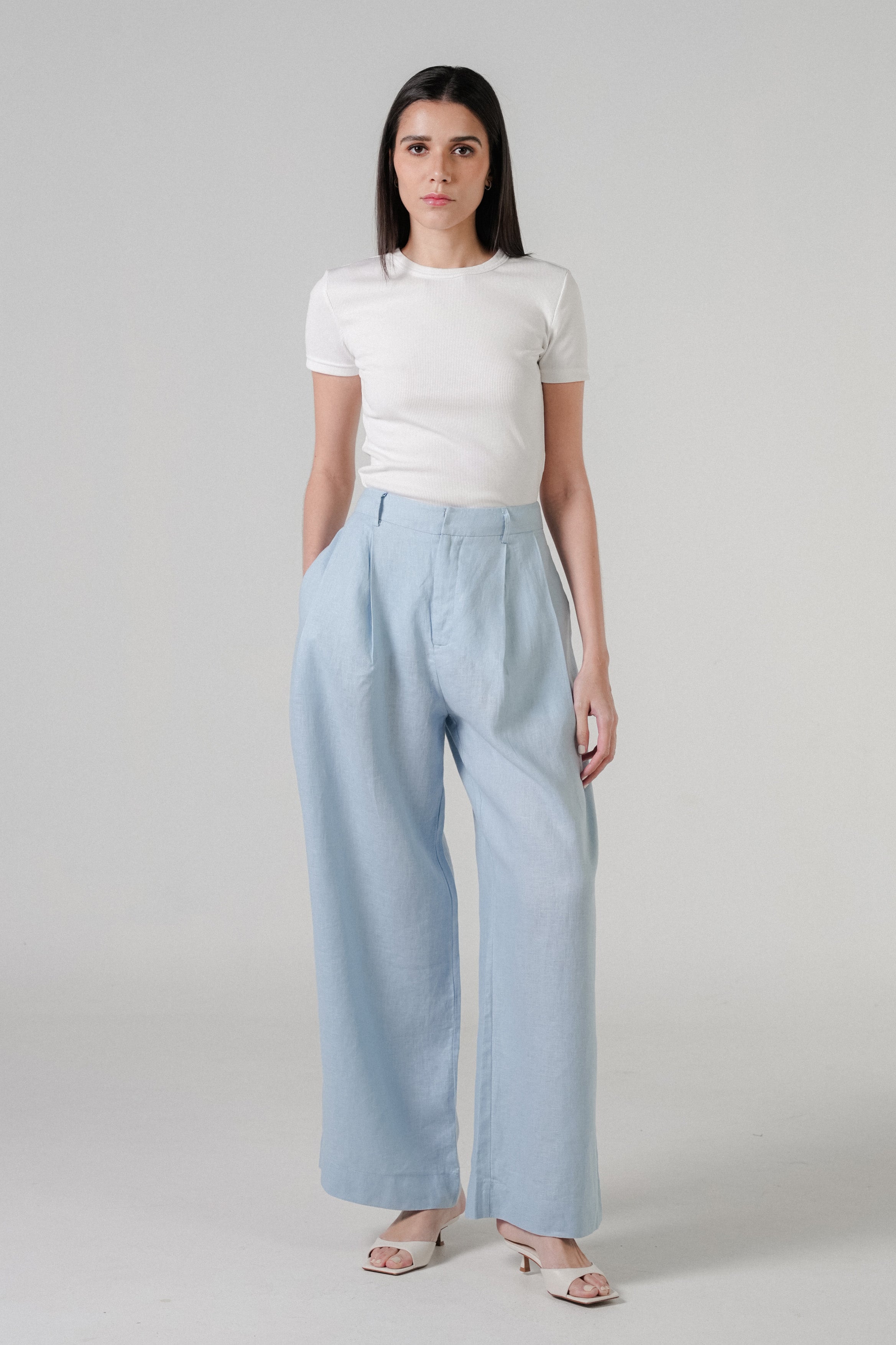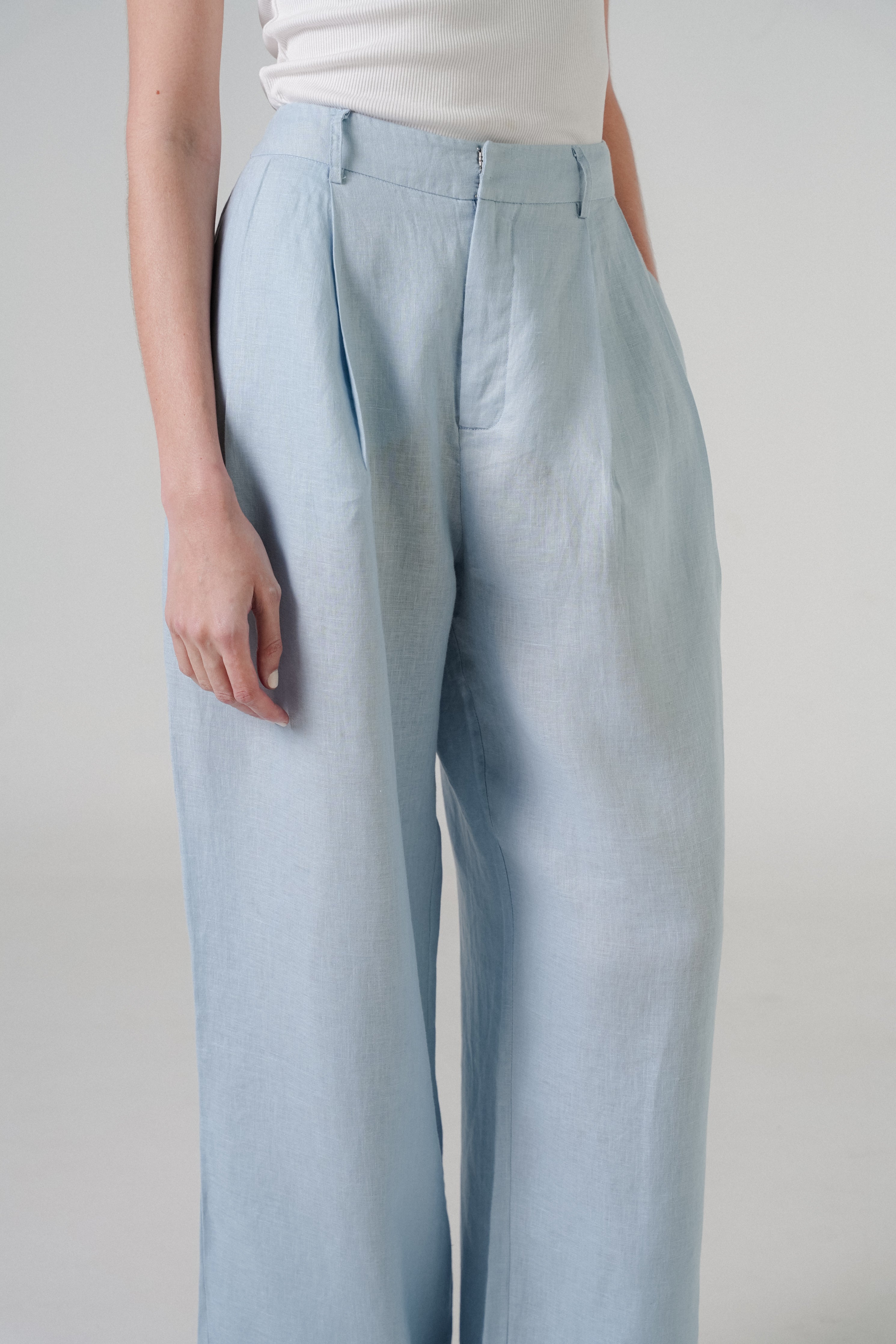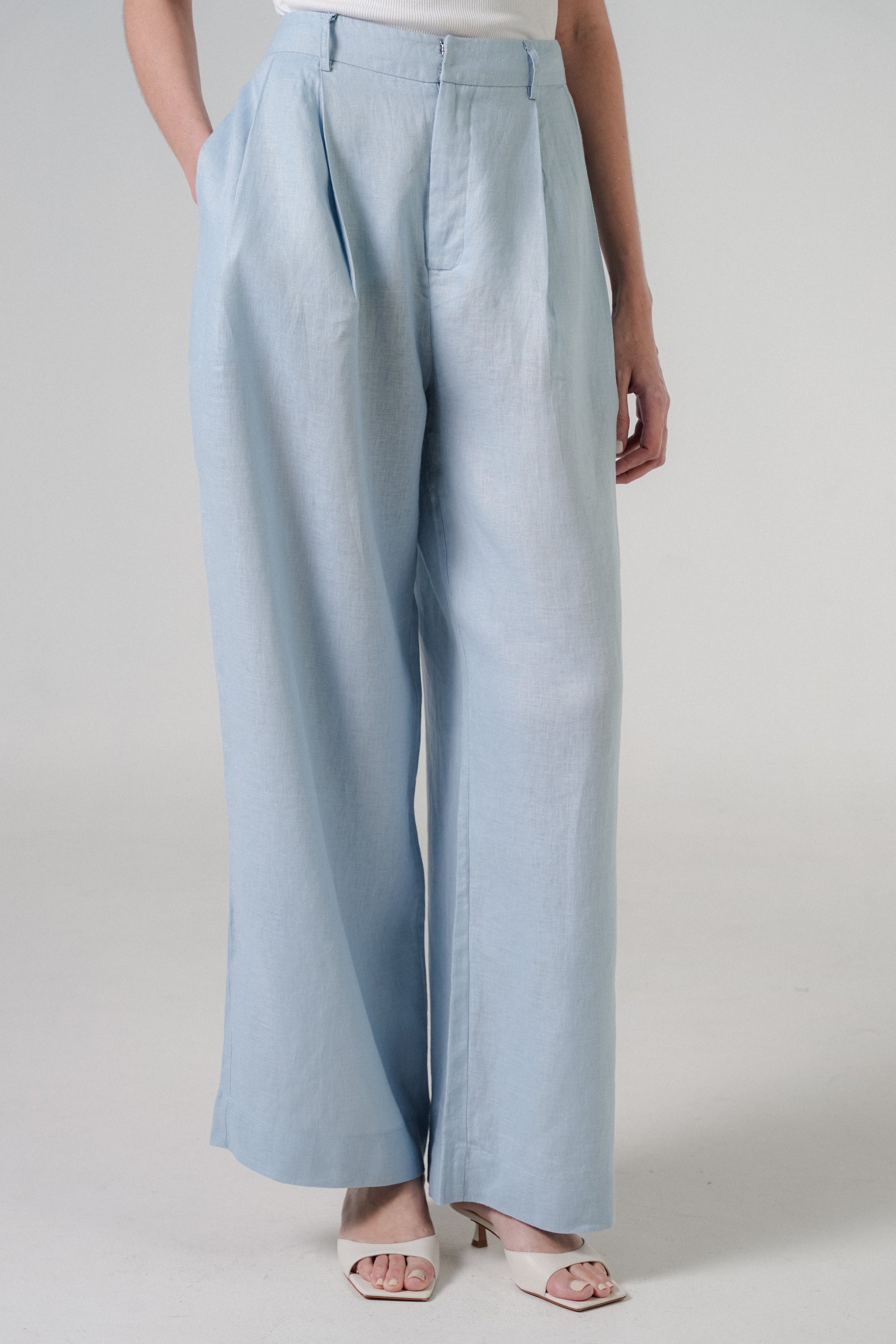 High-waisted trousers, with front pleats. A full-length relaxed fit. Rendered in 100% linen. Featuring side pockets, and finished with a back welt pocket.