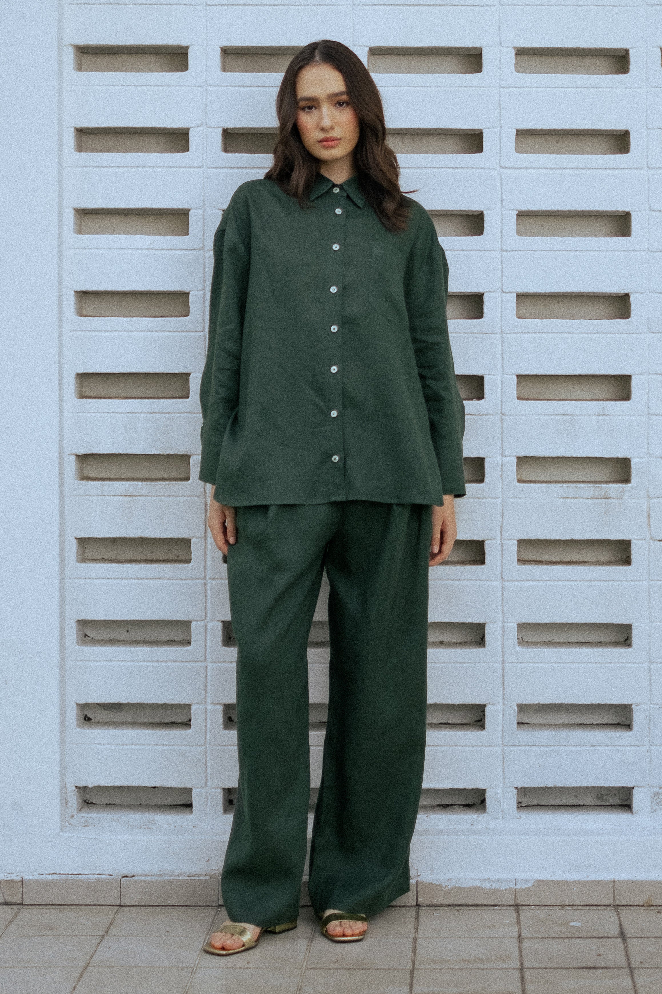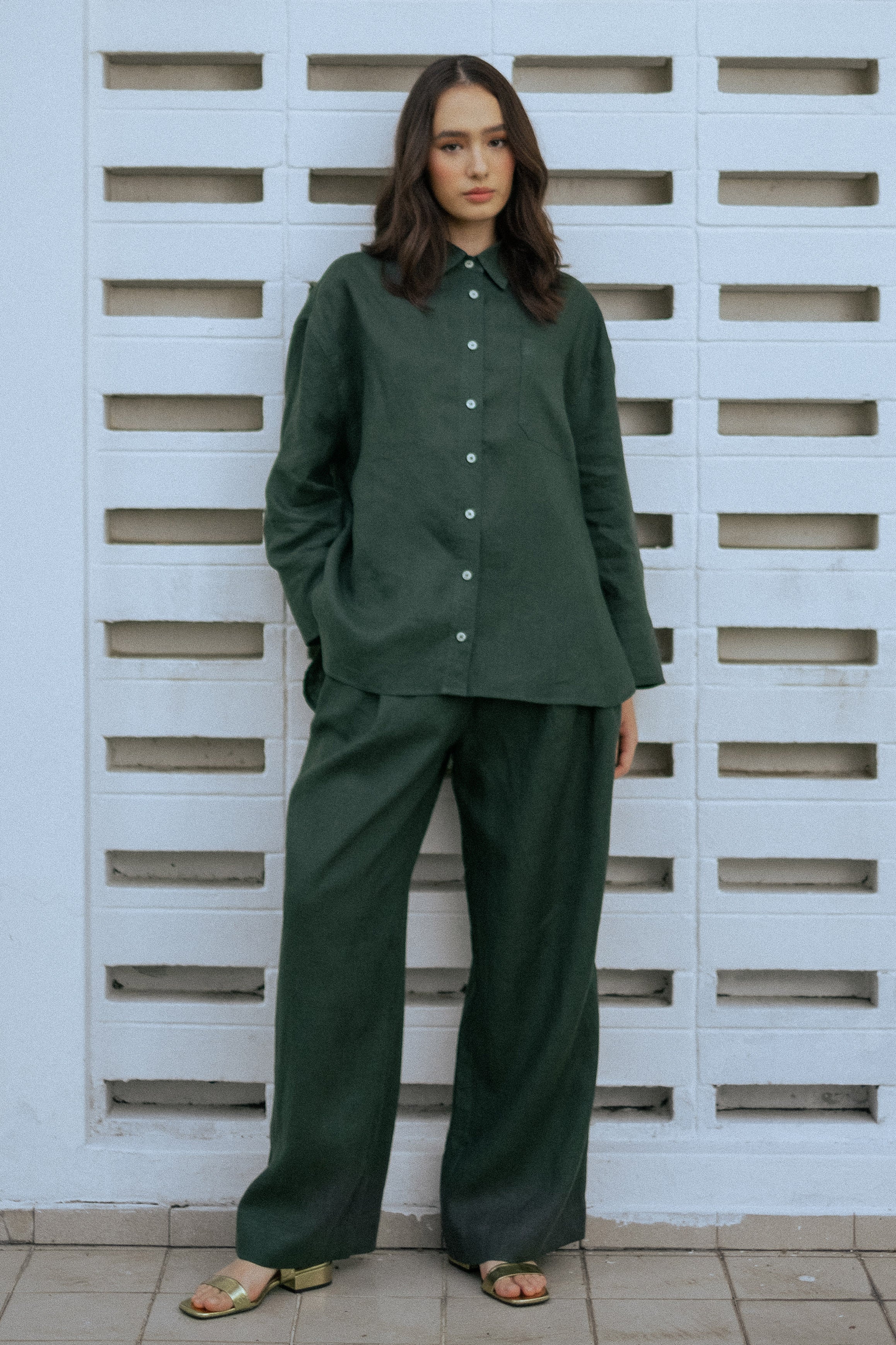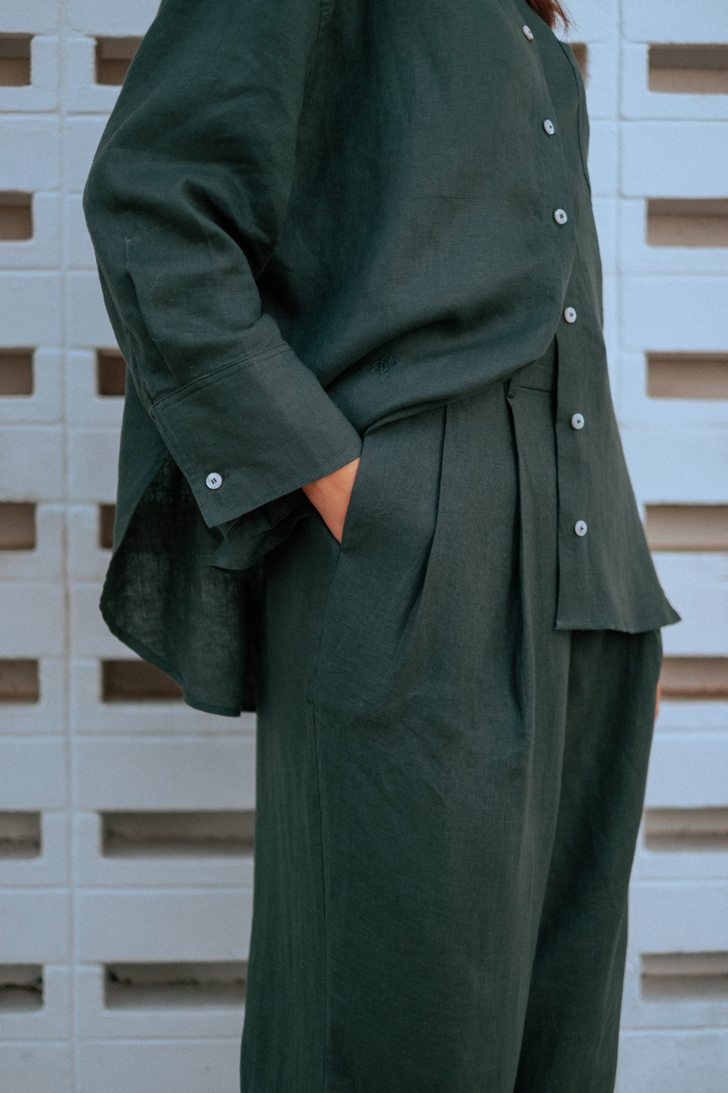 High-waisted trousers, with front pleats. A full-length relaxed fit. Rendered in 100% linen. Featuring side pockets, and finished with a back welt pocket.