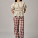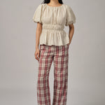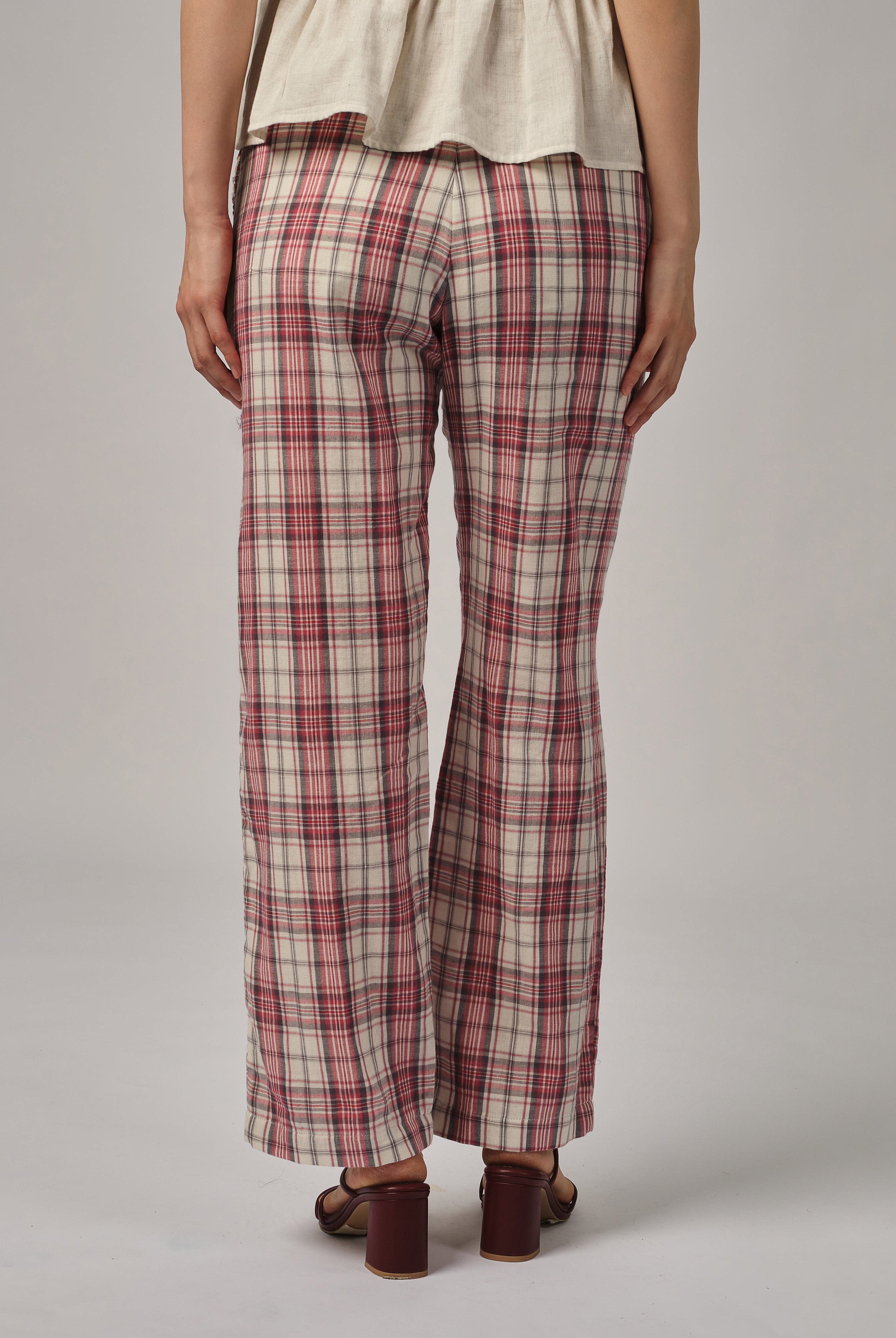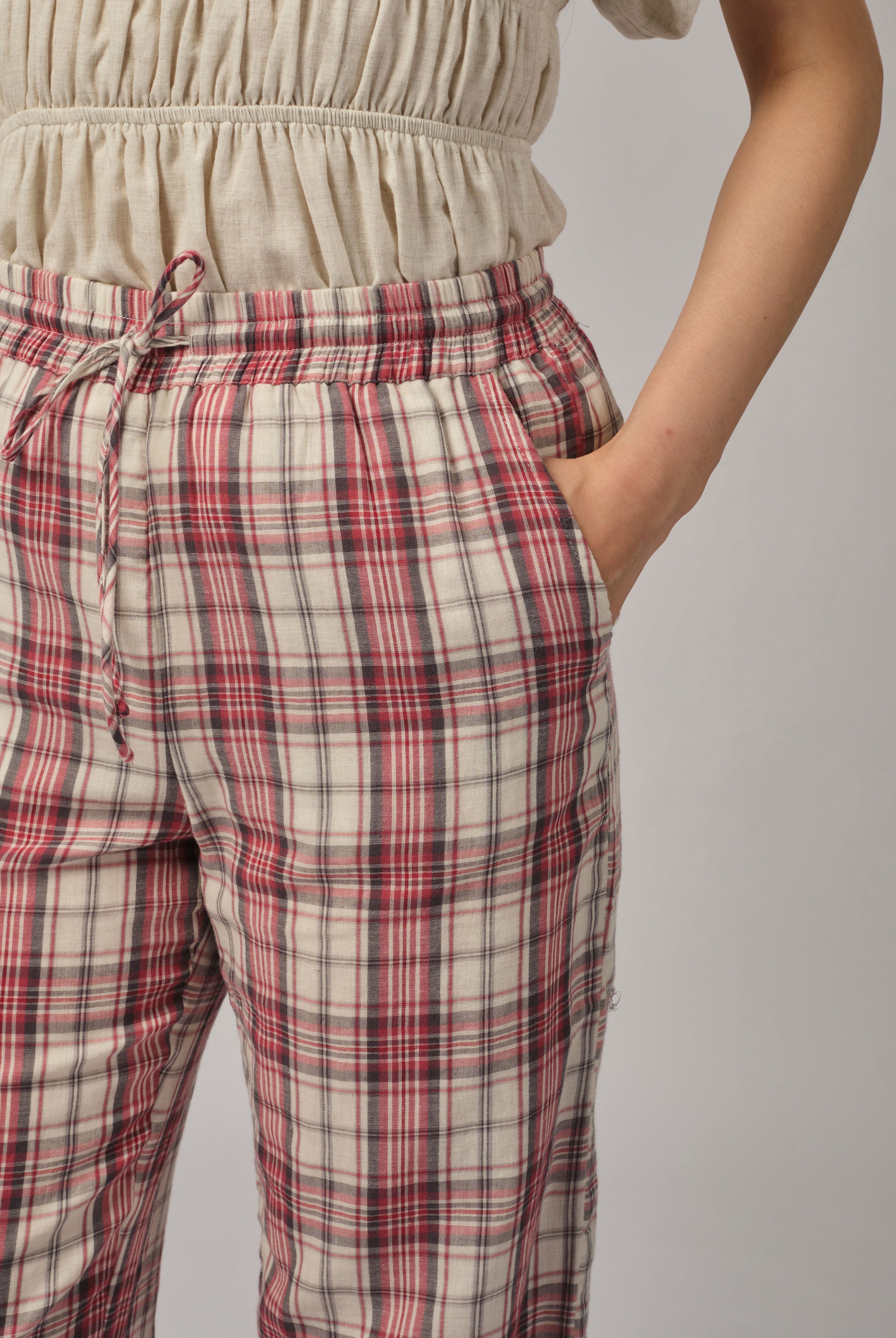 A straight cut fit, designed with a flexible drawstring waistband. Made from cotton, in a plaid weave pattern. Finished with pockets.