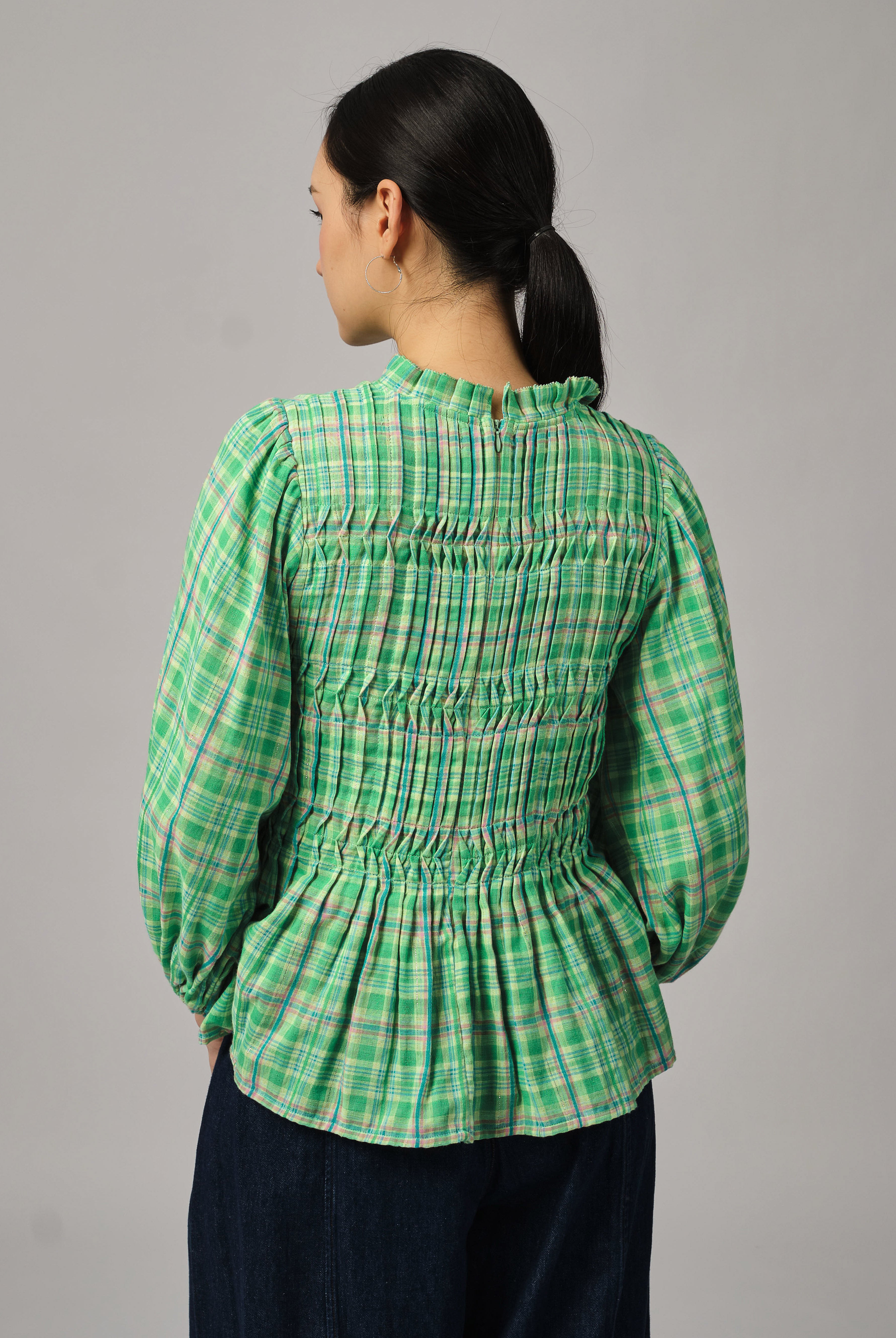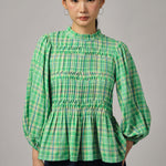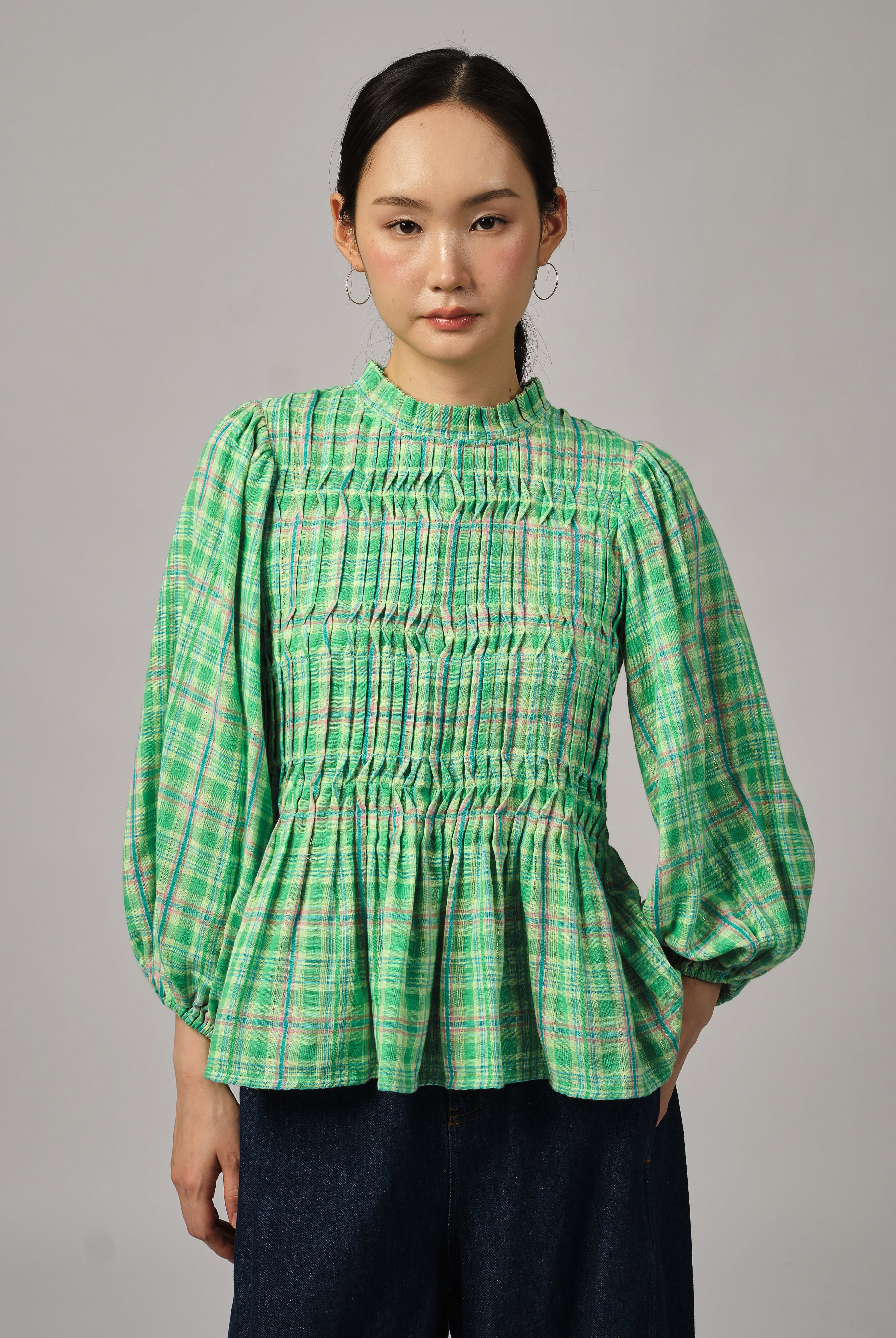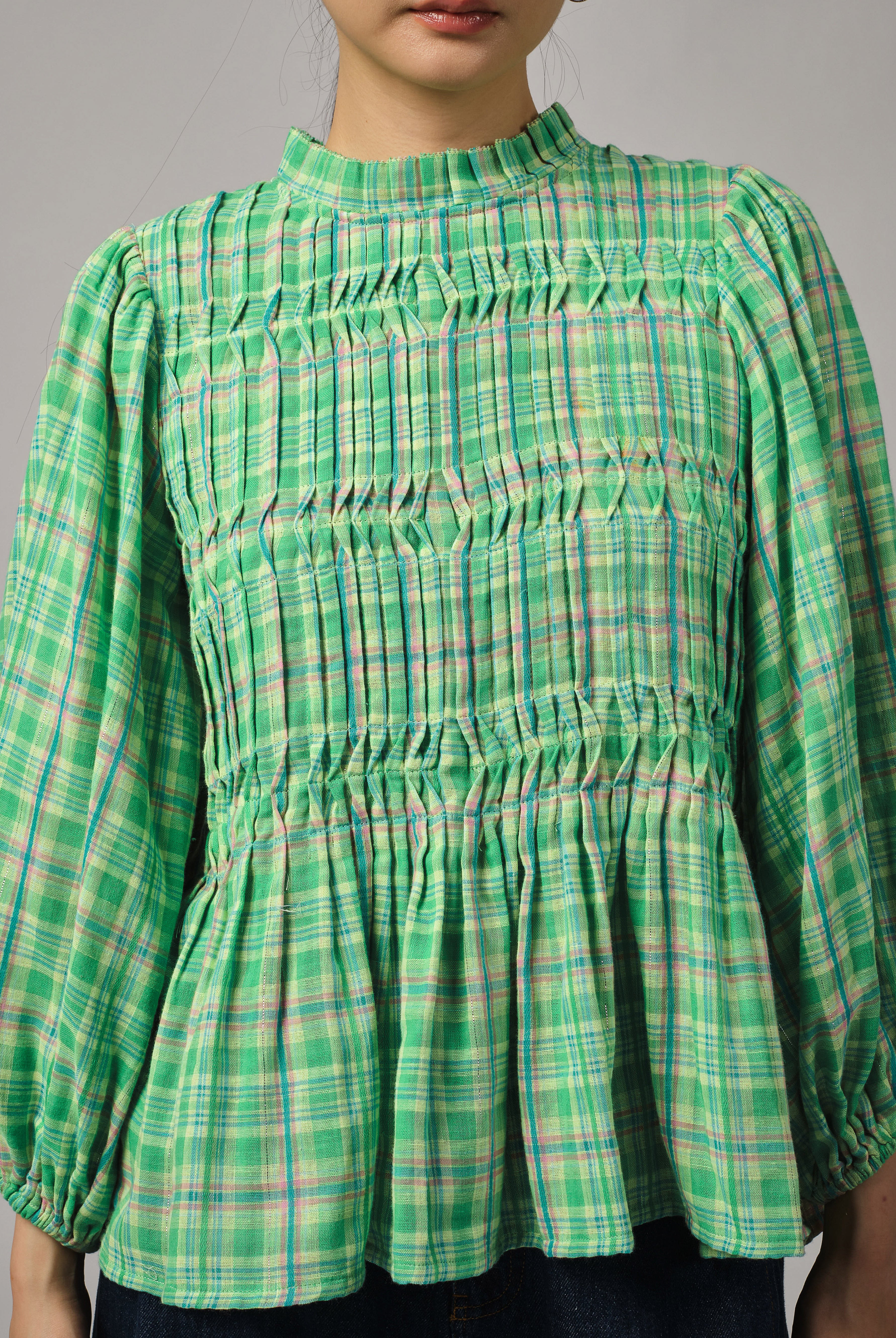 A feminine silhouette with a plaid weave pattern. Features a pintuck bodice and peplum hem. Finished with frilled details and fisheye trims.
