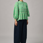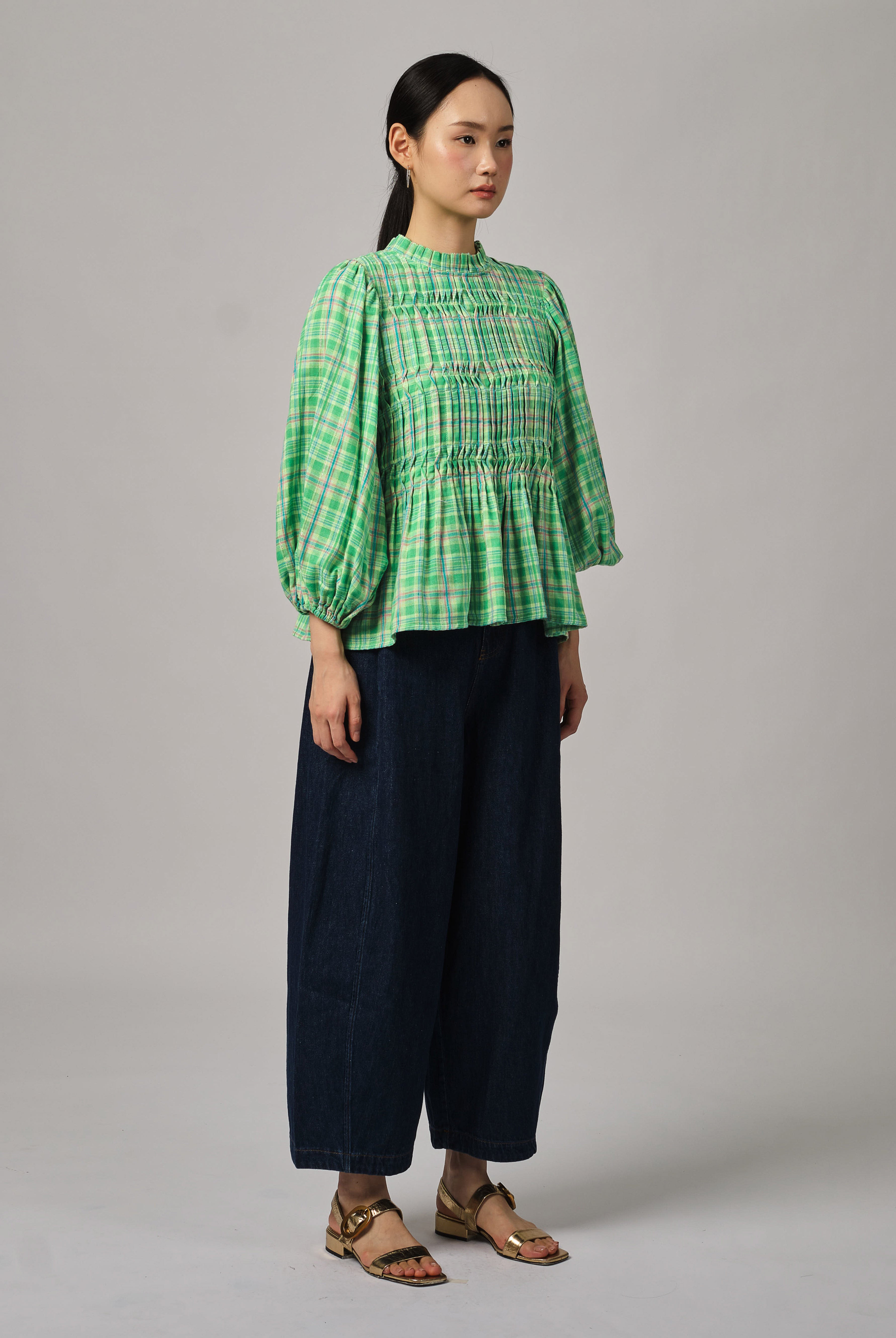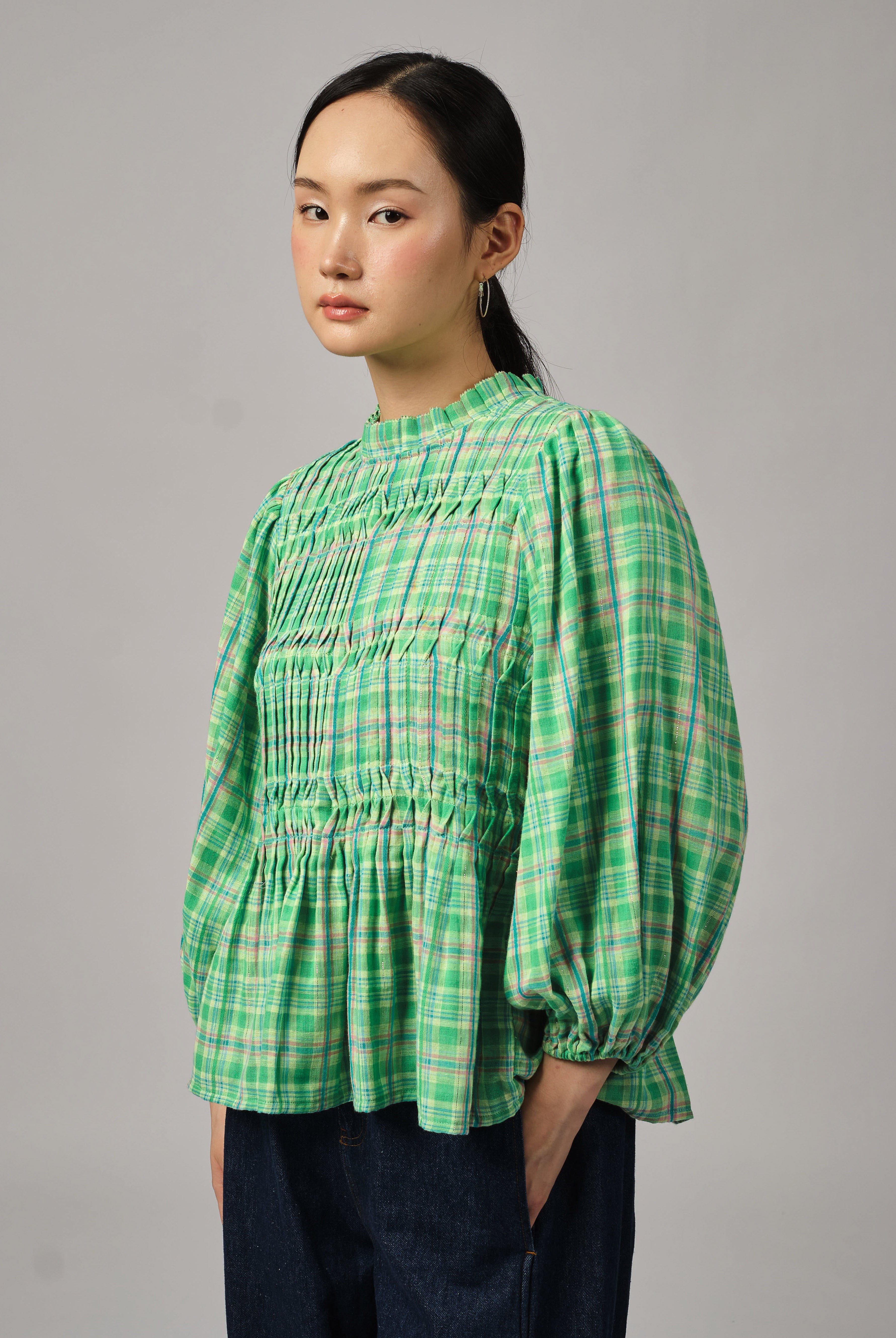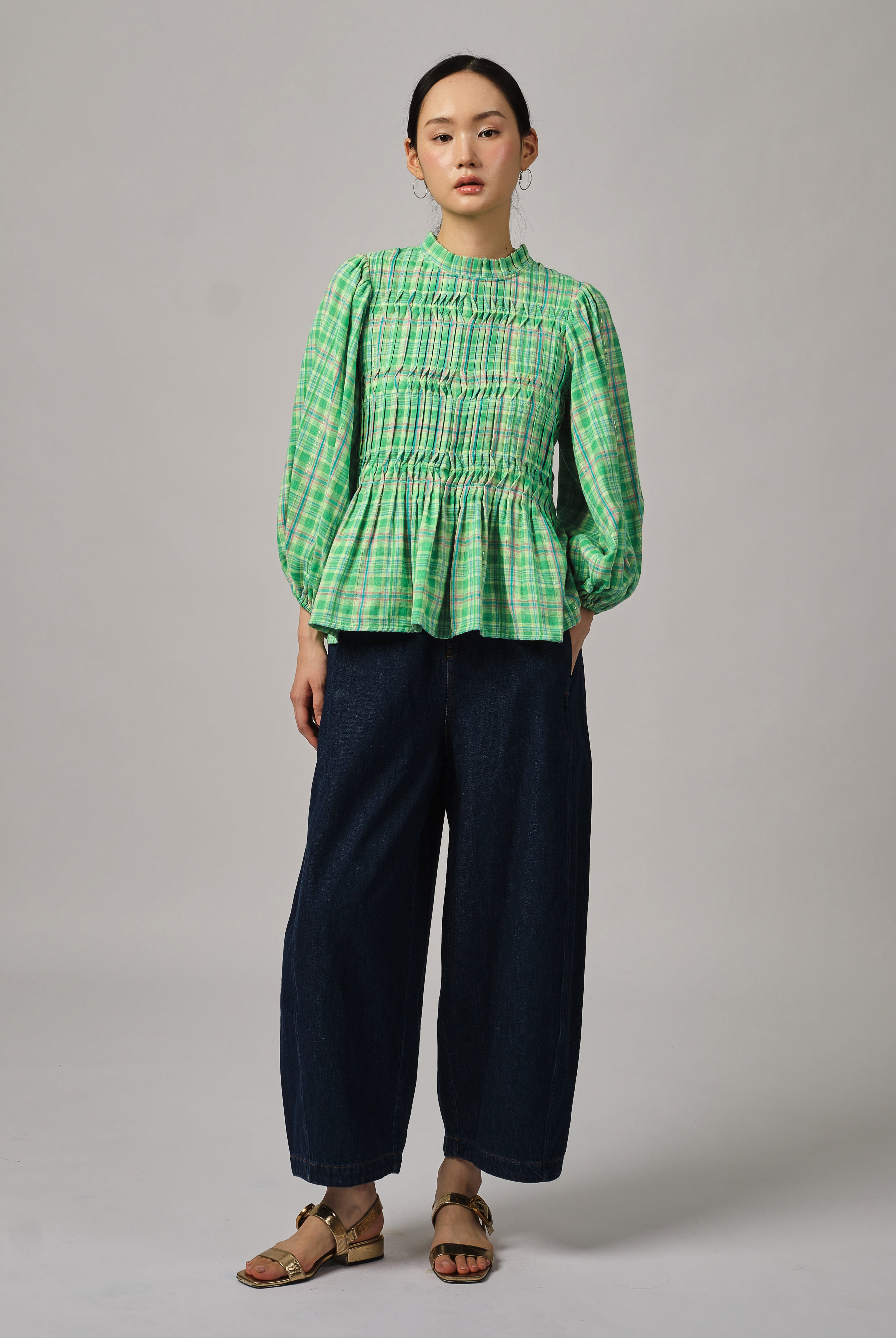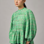 A feminine silhouette with a plaid weave pattern. Features a pintuck bodice and peplum hem. Finished with frilled details and fisheye trims.